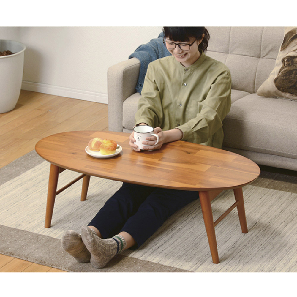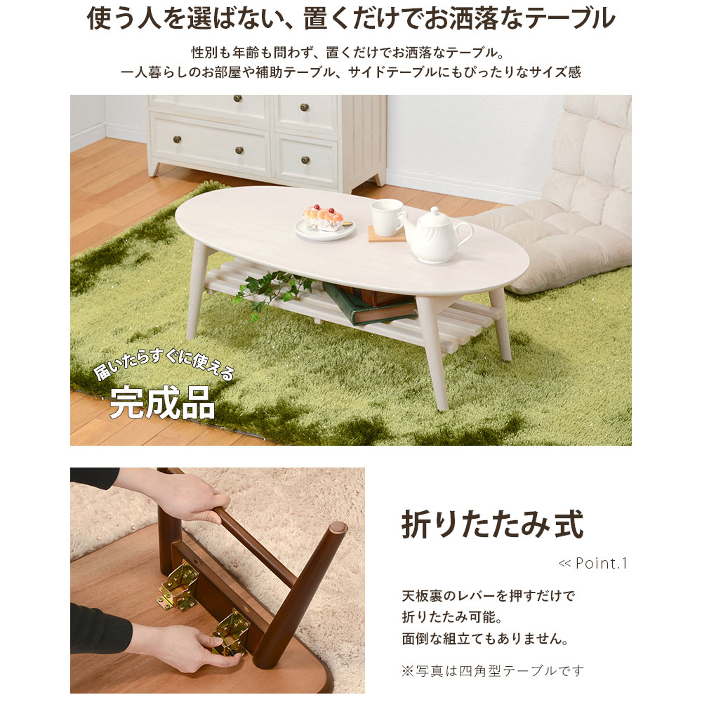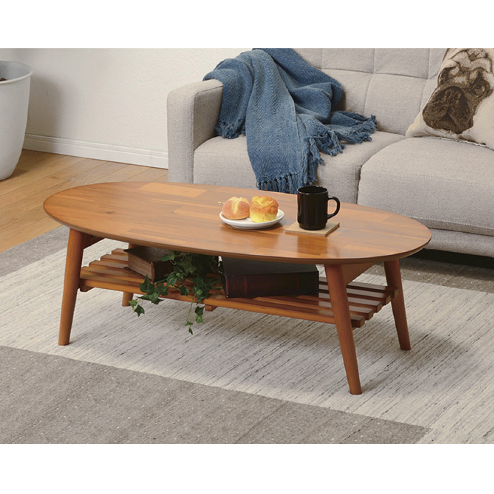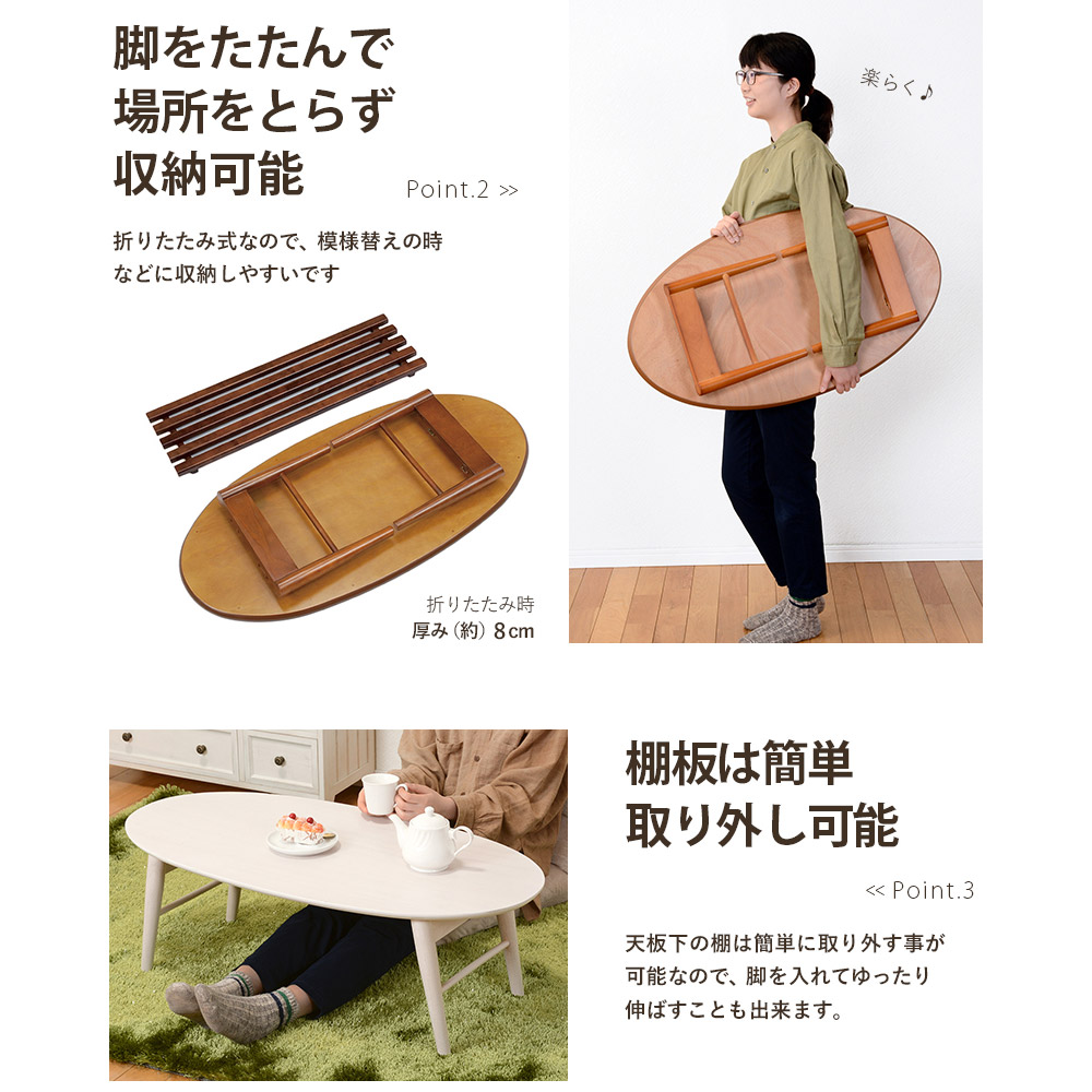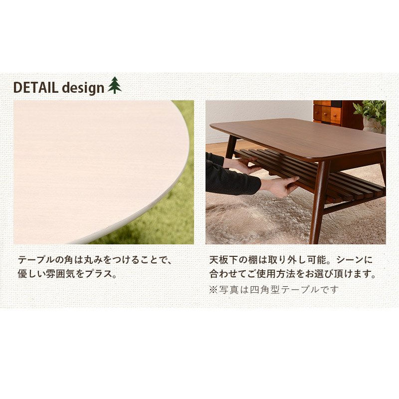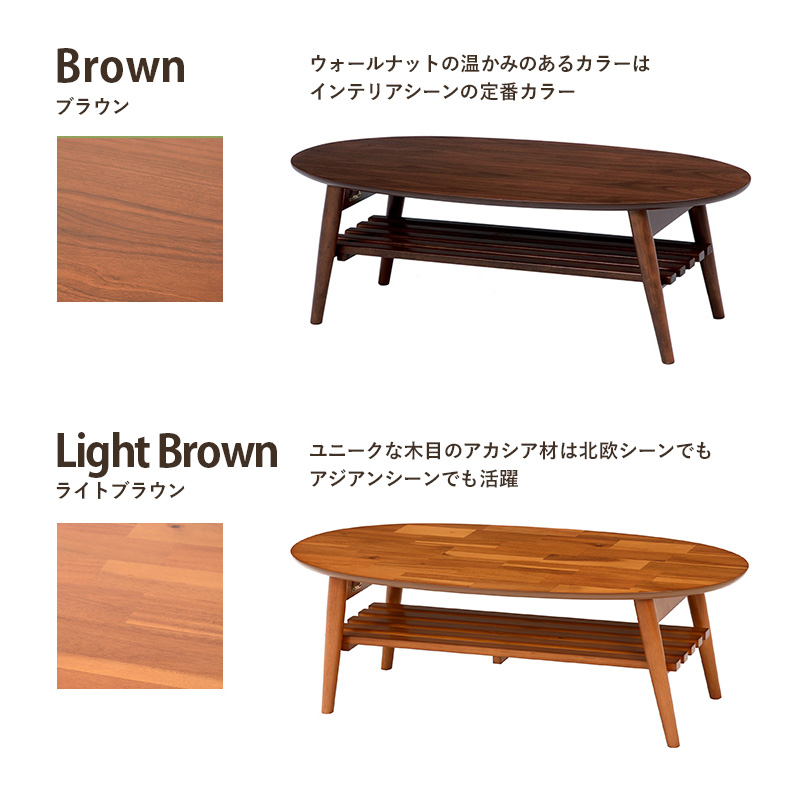 天然木の風合いが美しい北欧風テーブル。使わない時にはサッとしまえる。便利な折りたたみタイプです。天然木の風合いそのまま、折りたたみ式の使い勝手もうれしい!●天板はウォルナット(ブラウン)、黄雲木(ホワイトウォッシュ)の天然木突板の2色から選べます。●脚部もラバーウッドで天然木仕様です。●デザイン性に長けたラウンドデザインもウリです。●折りたたみ式となっており、模様替えの時など省スペースでの収納も簡単!テーブル下には便利な棚付き!●細々したものの収納、テーブルの上に置きっぱなしにしてしまうものの一時保管場所等に便利です。●棚板は取り外しての使用も可能なので、シーンに合わせて取り付けたり外したりお好みで設置下さい。使い勝手のいいコンパクトなサイズ感がうれしい!●幅100cm奥行50cm高さ33.5cmのコンパクトで使い勝手のいいサイズ感を採用。●床から天板下までの内寸は31.5cmになります。●床から棚までの内寸高さは15cm、棚から天板までの内寸高さは14cmとなります。