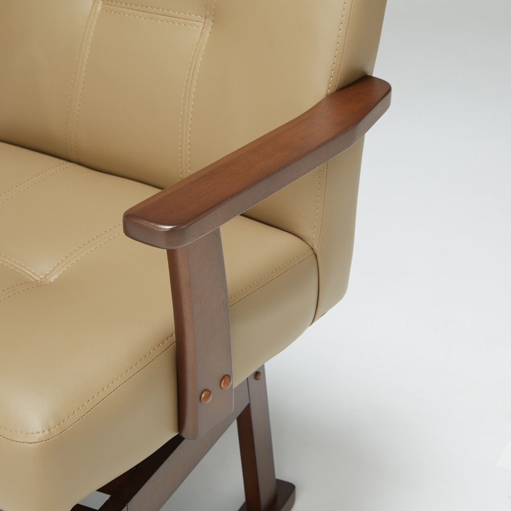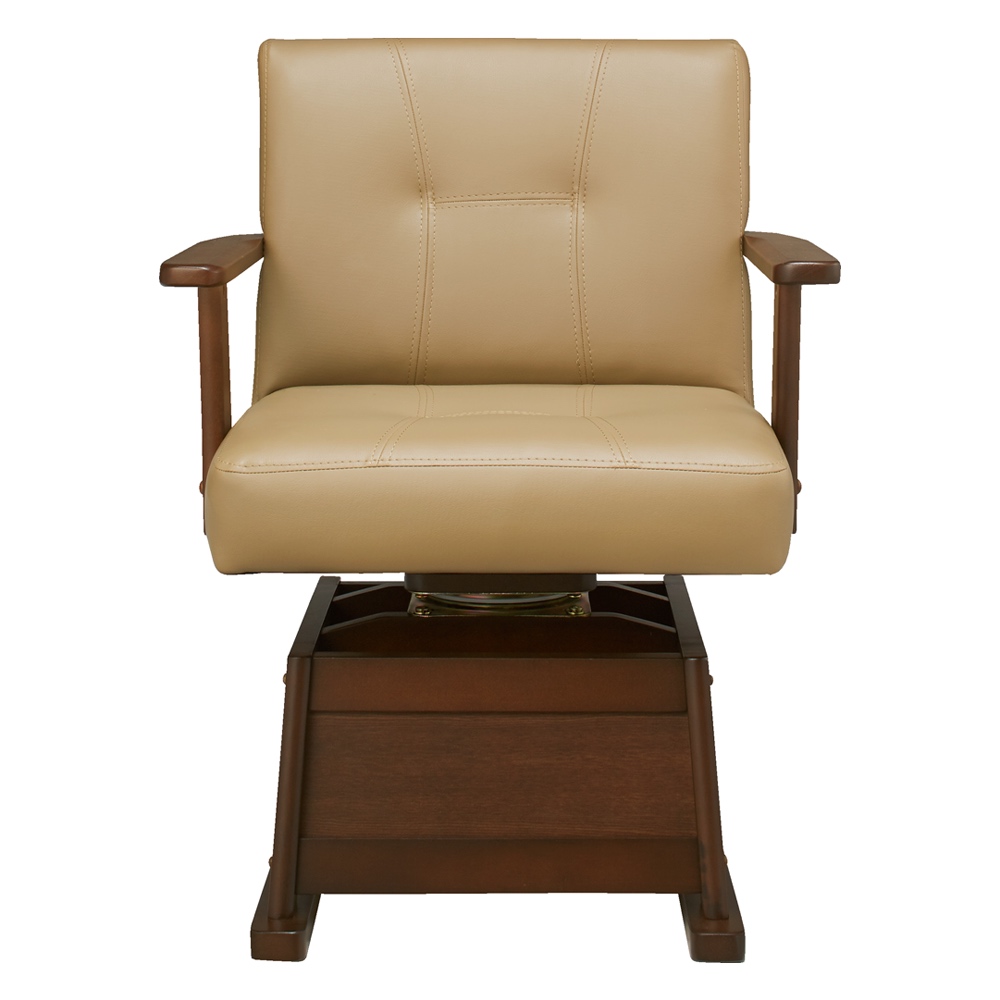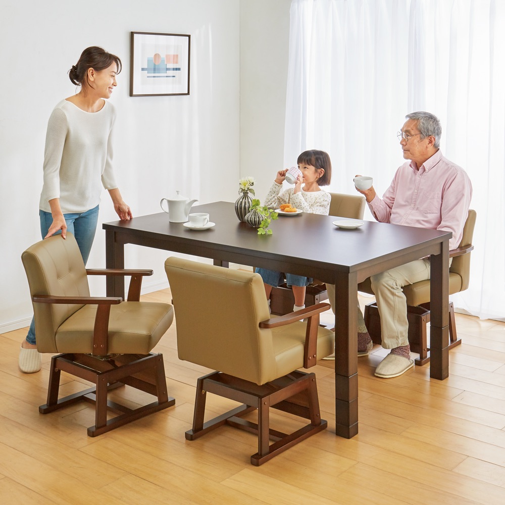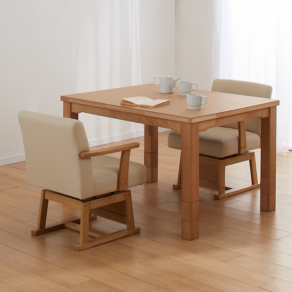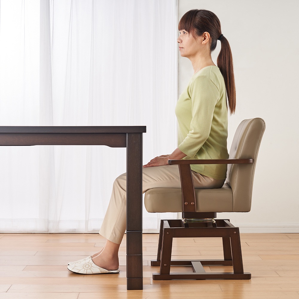 座部が回転するので立ち座りがラクラクなアームチェア。2段階で高さ調節が可能。座面下に前板があるので、こたつの熱が逃げにくいダイニングこたつにピッタリな回転式ダイニングチェアです。立ち座りしやすい座部が回転式なので、椅子を引かずに立ち座りができます。大き目の肘掛けは天然木製。膝や腰への負担も軽く立ち座りができます。高さ調節可能テーブルの高さに合わせてスペーサーの付け外しで高さ調節が可能です。脚部と座部の間にスペーサーを入れることで、座部高40.5cmのハイタイプのダイニングチェアとして。スペーサーを使用しなければ、座部高35.5cmのゆったり落ち着きのあるリビングダイニングチェアとして。テーブルの高さに合わせてご使用いただけます。こたつテーブルと合わせて座面下に前板があるので、こたつの熱が逃げにくい仕様。ダイニングこたつテーブルはもちろん、いろいろなテーブルに合わせてお使いいただける肘掛け付きチェアです。