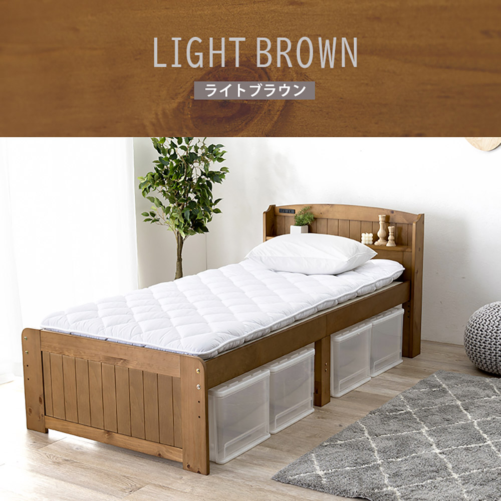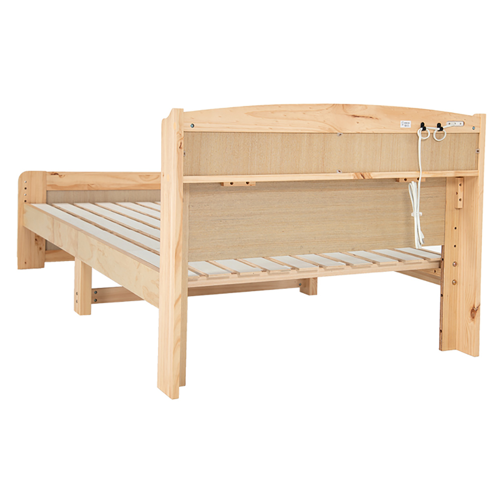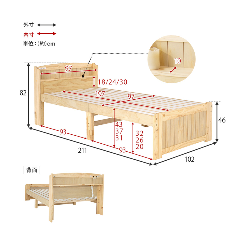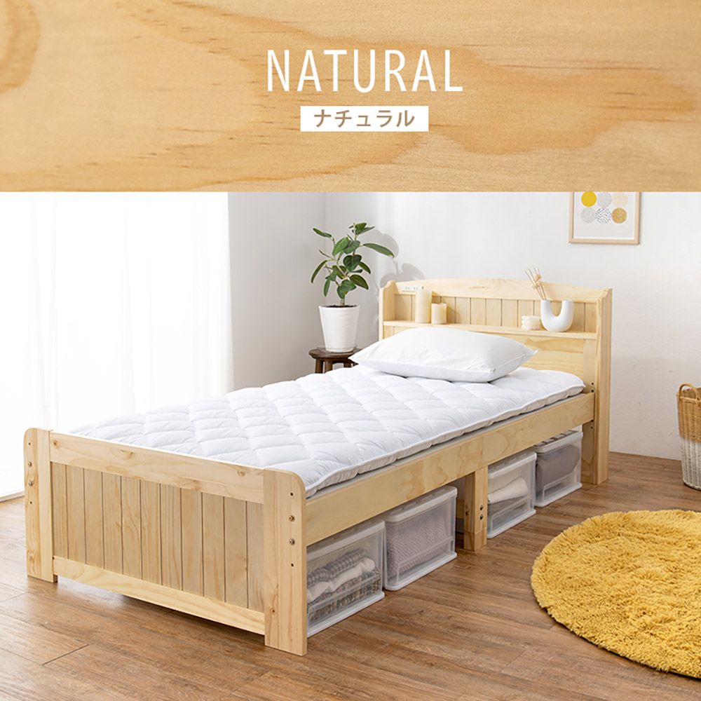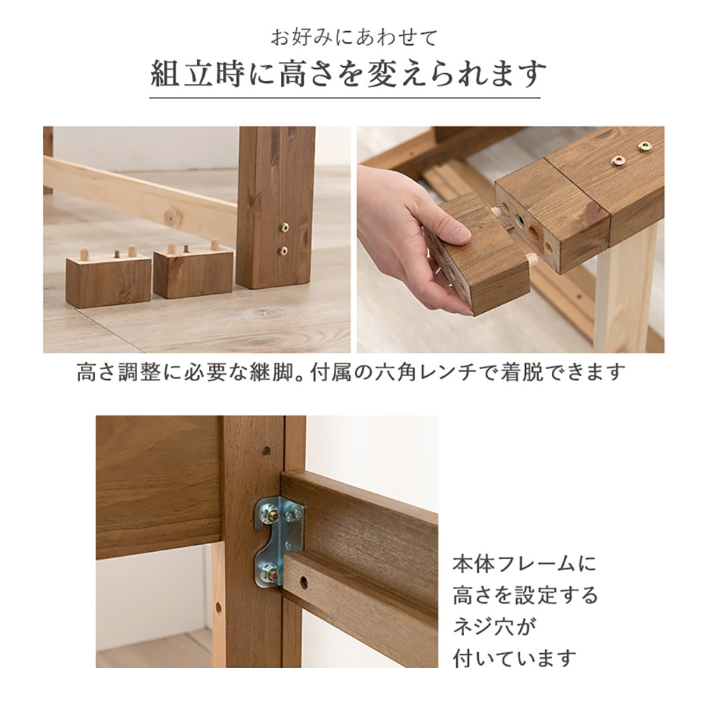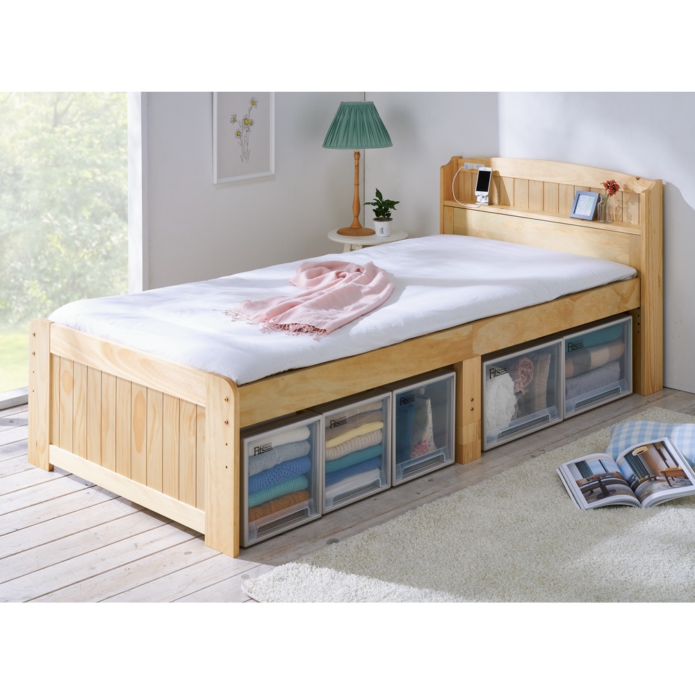 ベッド下は驚きの大収納。衣類ケースがしまえてお部屋すっきり。パイン天然木のナチュラルな風合いと収納力を兼ね備えたベッドフレーム。高さの調節も可能です。幅30cmの収納ケースが12個入る収納力ベッド下の空間は、押し入れやクローゼットで使う衣類ケースを2段重ねて収納ができる高さ。お洋服を沢山持つお客様のお悩みも解決できます。幅44cmの収納ケースなら高さ違いで最大8個、幅30cmの収納ケースなら高さ違いで最大12個入るくらいの大容量スペースです!ケースの奥の空きスペースには、ラグなどの長いもの収納できます。高さ3段階に変更可能床面の高さ30cm・37cm・43cm(ベッド下20cm・26cm・32cm)に組み立てできるので、ベッド下に収納したいものに合わせてお好みで調節ができます。天然木を使用し、ぬくもりのあるデザイン本体はパイン材を使用。木目を生かした色展開です(ホワイトウォッシュ・ナチュラル・ライトブラウン)ヘッドボード・フットボードの前面は板張り仕様なので、優しくぬくもりを感じさせます。すのこは強度のある頑丈仕様一般的なすのこベッドは、すのこを支える桟木が縦中心に1本のみですが、本商品は横方向に12本設置。軋みを防ぎ、長く安心してご利用頂けます。コンセント付きの棚スぺースヘッドボードに2口コンセント付きなので、スマホの充電のほかにも電源を繋げられます。棚スペースは狭すぎず広すぎずの奥行き感(10cm)なので、寝る前の文庫本を置いたりお気に入りの雑貨を並べられます。