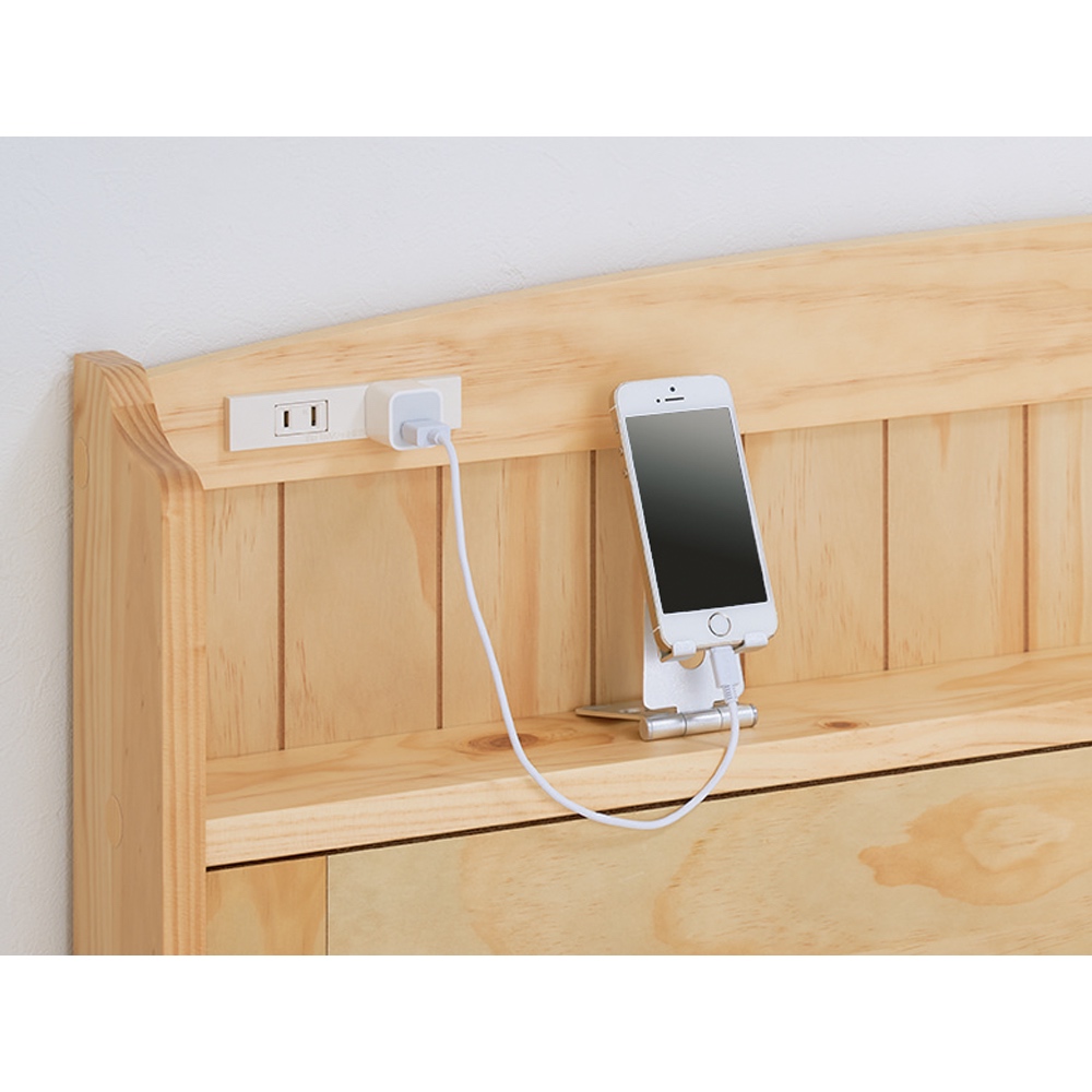 ヘッドボードはコンセント付き。棚にはスマホやメガネが置けます。
