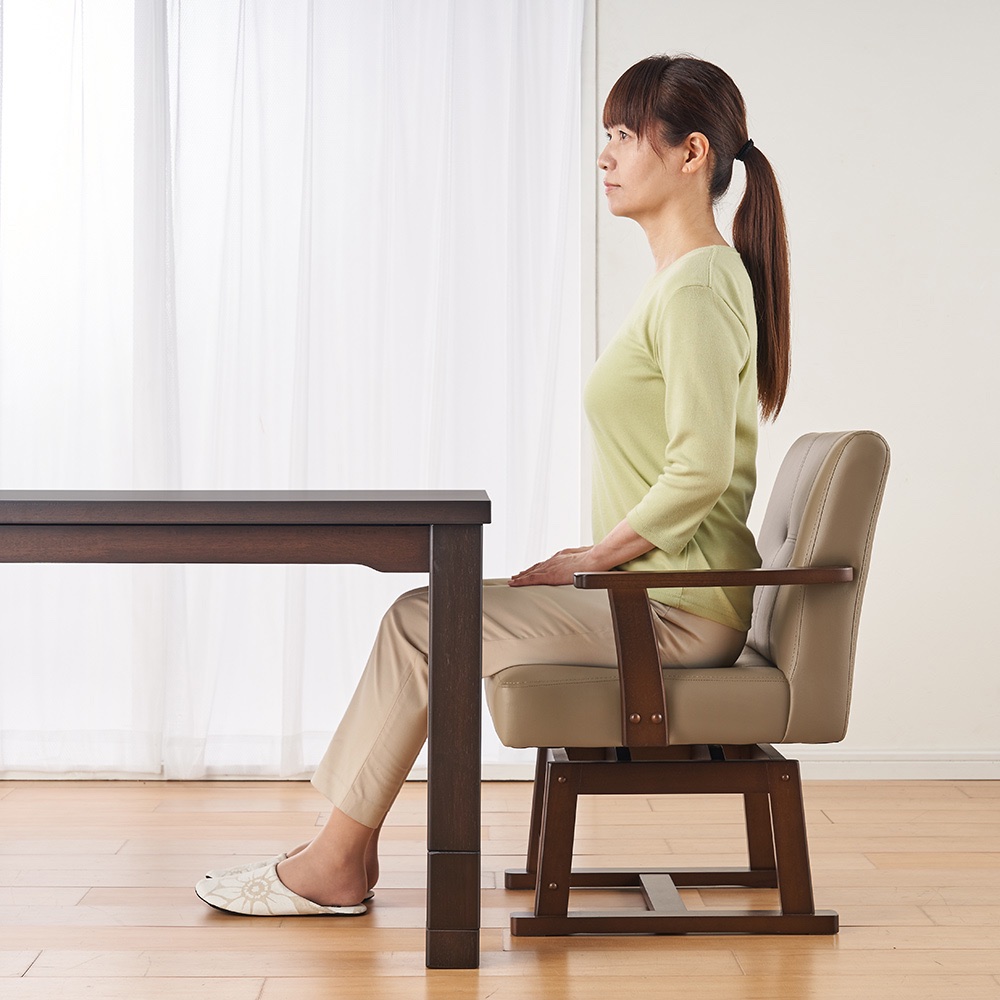 コーディネート例(ア)ダークブラウン 小柄な方・足腰が気になる方にも使いやすいダイニング。 ※お届けはテーブル105×80cmです。 ※写真はテーブル高さ65cm(継ぎ脚10cm+10cm使用時)※椅子は別売りです