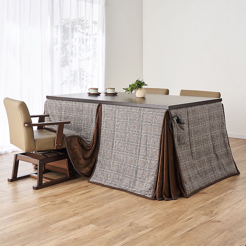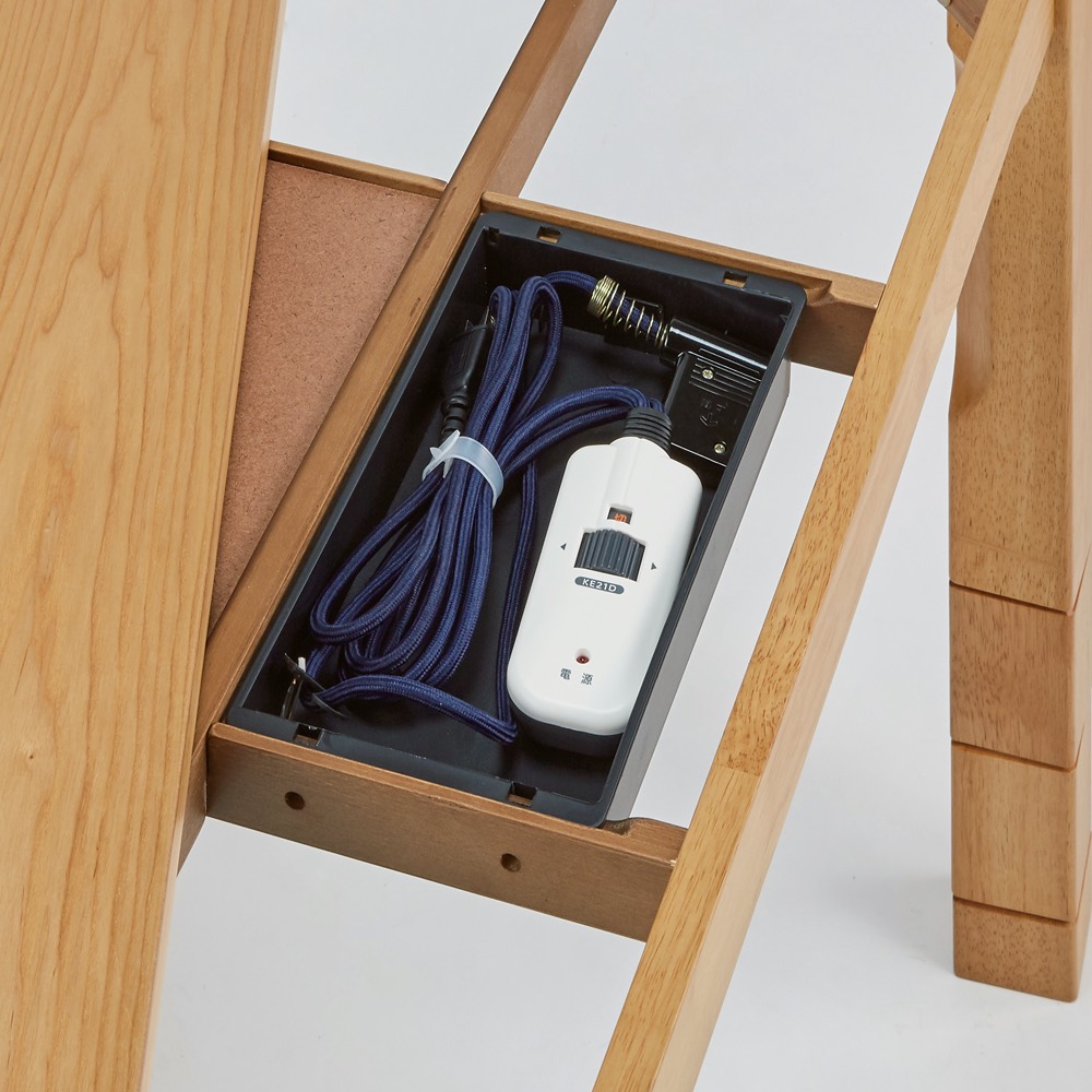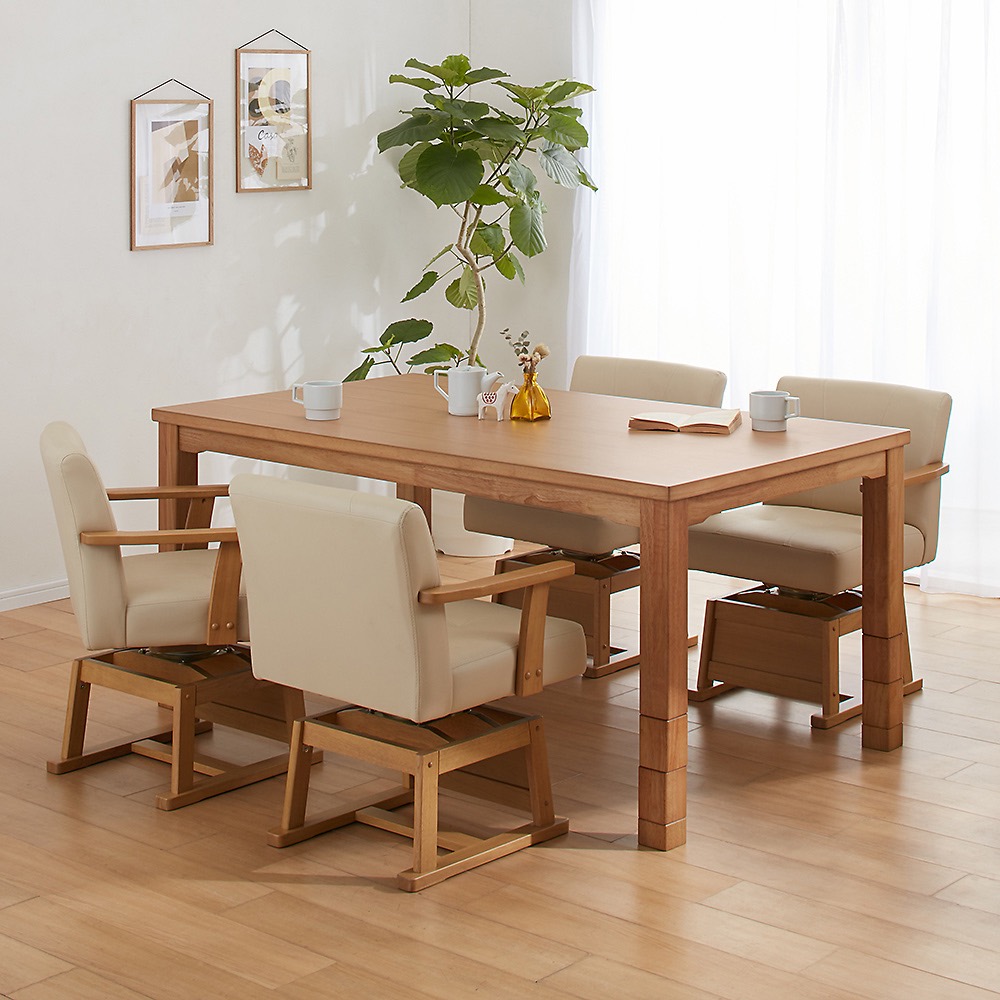 イスが使えるダイニングこたつテーブル。高さを変えて、座卓からダイニングテーブルまで、6通り高さのこたつ生活ができます。高級感あふれる天然木突板仕上げの天板。すぐに暖まる薄型でもハイパワーなファン付きヒーター。手元で温度調節できる手元コントローラー式。省エネになると話題のこたつで電気代を賢く節電しましょう。オーク天然木・アッシュ天然木突き板仕上げの天板お手入れしやすいウレタン塗装に、傷や染み込みに強いUV加工を施しました。イスに座って使えるこたつテーブルイスの高さに合わせて高さ調節できるこたつテーブル。別売りの回転チェアとの組合せで、立ち座りしやすいリビングダイニングが実現。デスクの姿勢で使えるこたつは、テレワークや趣味の作業にもおすすめです。6段階の高さ調節付属の継ぎ脚を組み合わせることで、テーブルの高さを6段階に調節できます。テーブルの高さは45・50・55・60・65・70cmに。(テーブル下高さは左記マイナス9cm)文机からリビングテーブル、ダイニングテーブルとお好みの使い方ができます。こたつテーブルでも一年中使えます出っ張りの少ないヒーターを採用。こたつ布団を外せばダイニングテーブルとしてお使いいただけます。天板は専用ボルトで固定できます(布団使用時は固定できません)。冬だけでなく、夏場もダイニングやデスクとして使える便利なテーブルです。ヒーターとコントローラー600Wのハイパワーなファン付きハロゲンヒーターで、すぐに暖まります。暖かさを手元で調節できる手元電子コントローラー式。コード長さは余裕の約300cmです。