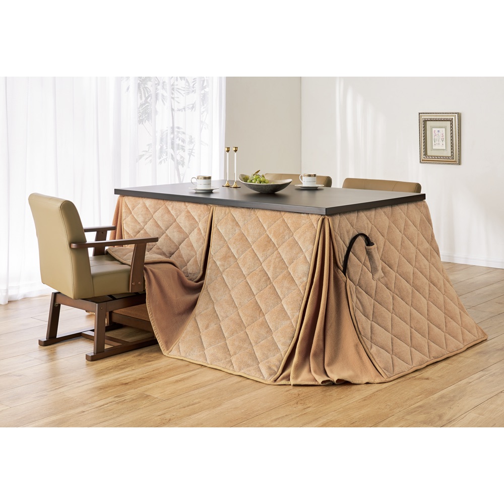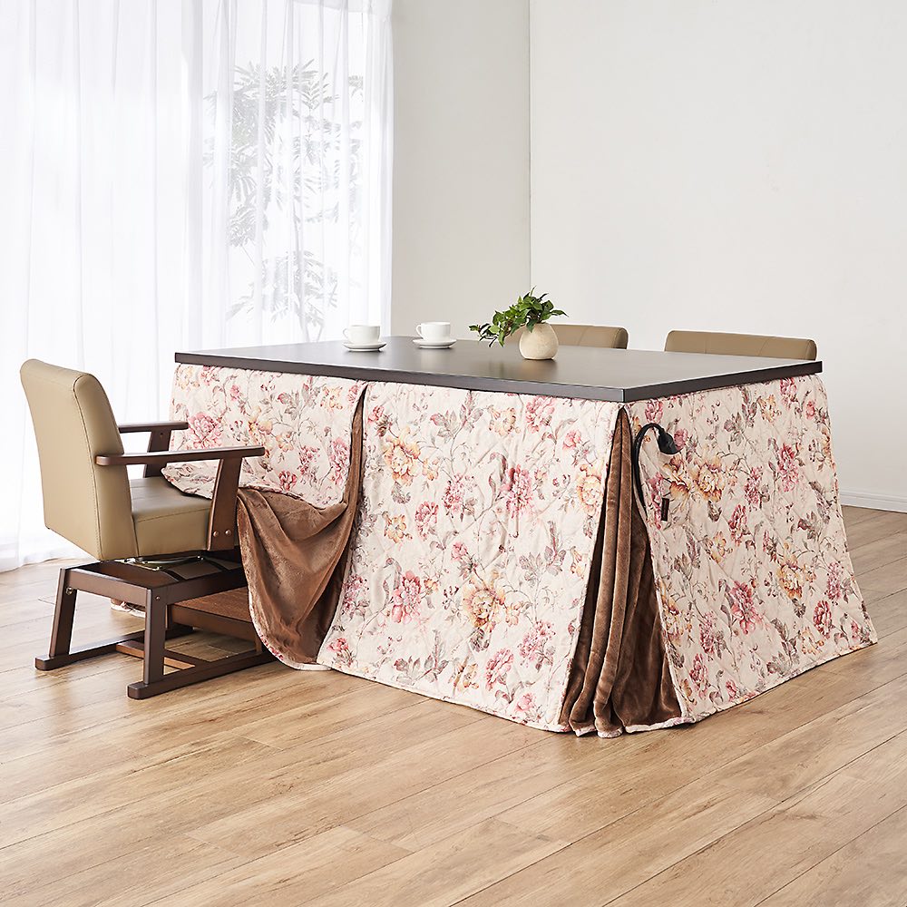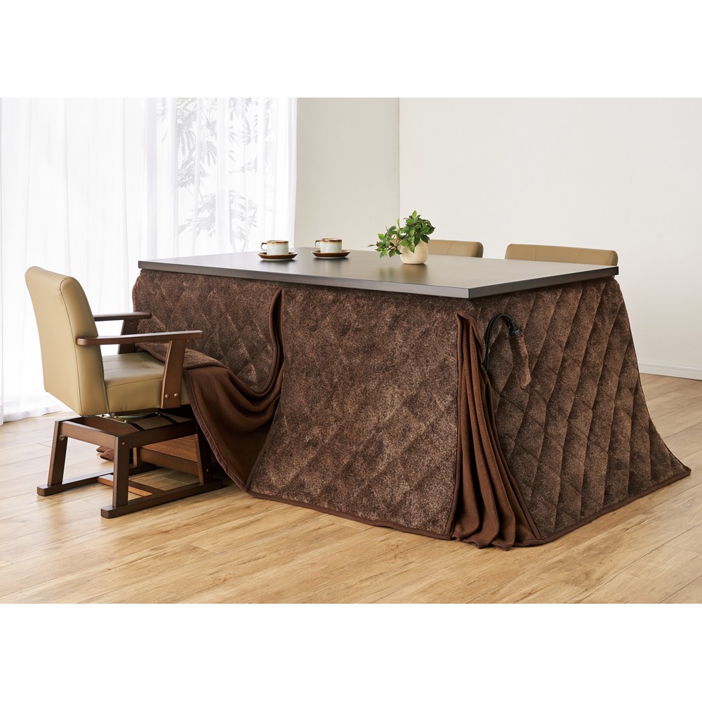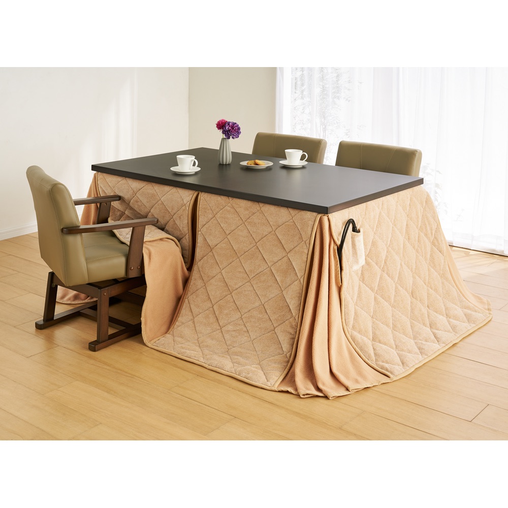 イスが使えるダイニングこたつテーブル。高さを変えて、座卓からダイニングテーブルまで、6通り高さのこたつ生活ができます。高級感あふれる天然木突板仕上げの天板。すぐに暖まる薄型でもハイパワーなファン付きヒーター。手元で温度調節できる手元コントローラー式。省エネになると話題のこたつで電気代を賢く節電しましょう。オーク天然木・アッシュ天然木突き板仕上げの天板お手入れしやすいウレタン塗装に、傷や染み込みに強いUV加工を施しました。イスに座って使えるこたつテーブルイスの高さに合わせて高さ調節できるこたつテーブル。別売りの回転チェアとの組合せで、立ち座りしやすいリビングダイニングが実現。デスクの姿勢で使えるこたつは、テレワークや趣味の作業にもおすすめです。6段階の高さ調節付属の継ぎ脚を組み合わせることで、テーブルの高さを6段階に調節できます。テーブルの高さは45・50・55・60・65・70cmに。(テーブル下高さは左記マイナス9cm)文机からリビングテーブル、ダイニングテーブルとお好みの使い方ができます。こたつテーブルでも一年中使えます出っ張りの少ないヒーターを採用。こたつ布団を外せばダイニングテーブルとしてお使いいただけます。天板は専用ボルトで固定できます(布団使用時は固定できません)。冬だけでなく、夏場もダイニングやデスクとして使える便利なテーブルです。ヒーターとコントローラー600Wのハイパワーなファン付きハロゲンヒーターで、すぐに暖まります。暖かさを手元で調節できる手元電子コントローラー式。コード長さは余裕の約300cmです。