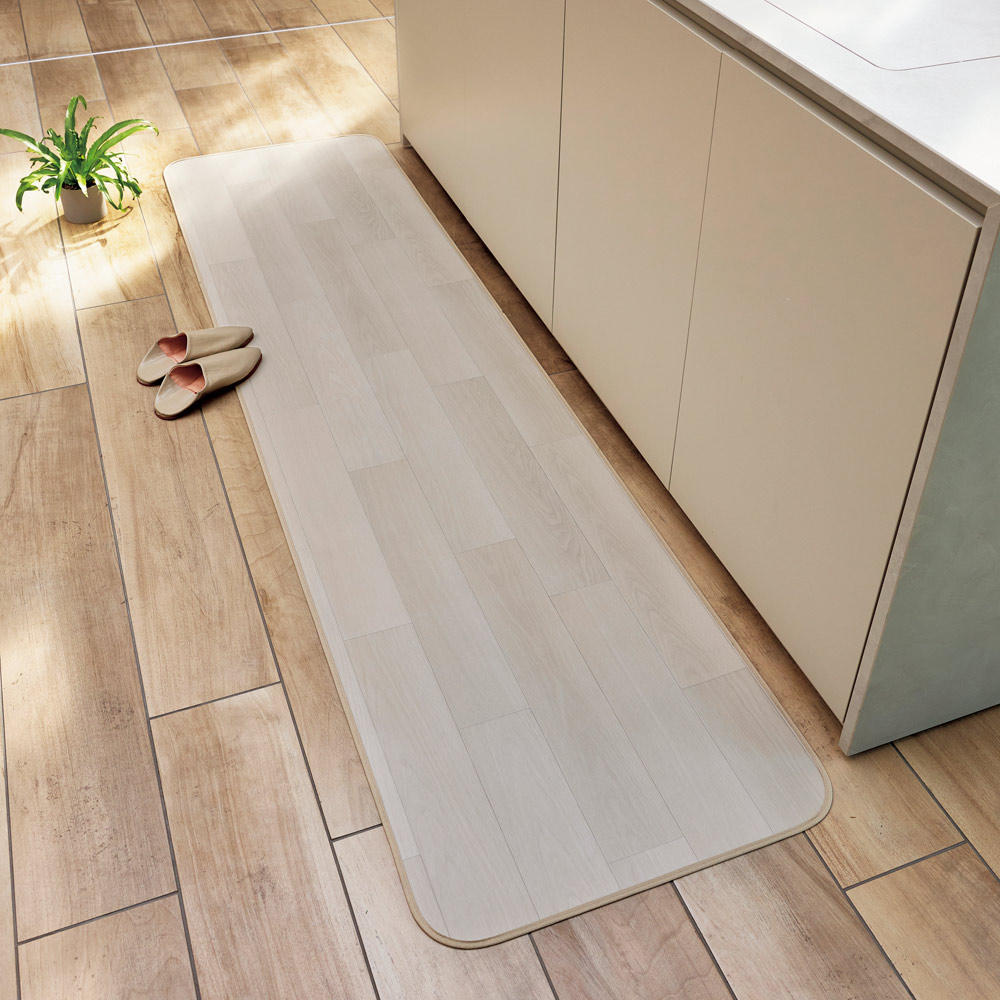 • (エ)ウッドナチュラル(写真は約60×240cm) 汚れたらサッと拭け、抗菌加工の清潔仕様。コーナーはつまずきにくいラウンドカット。
