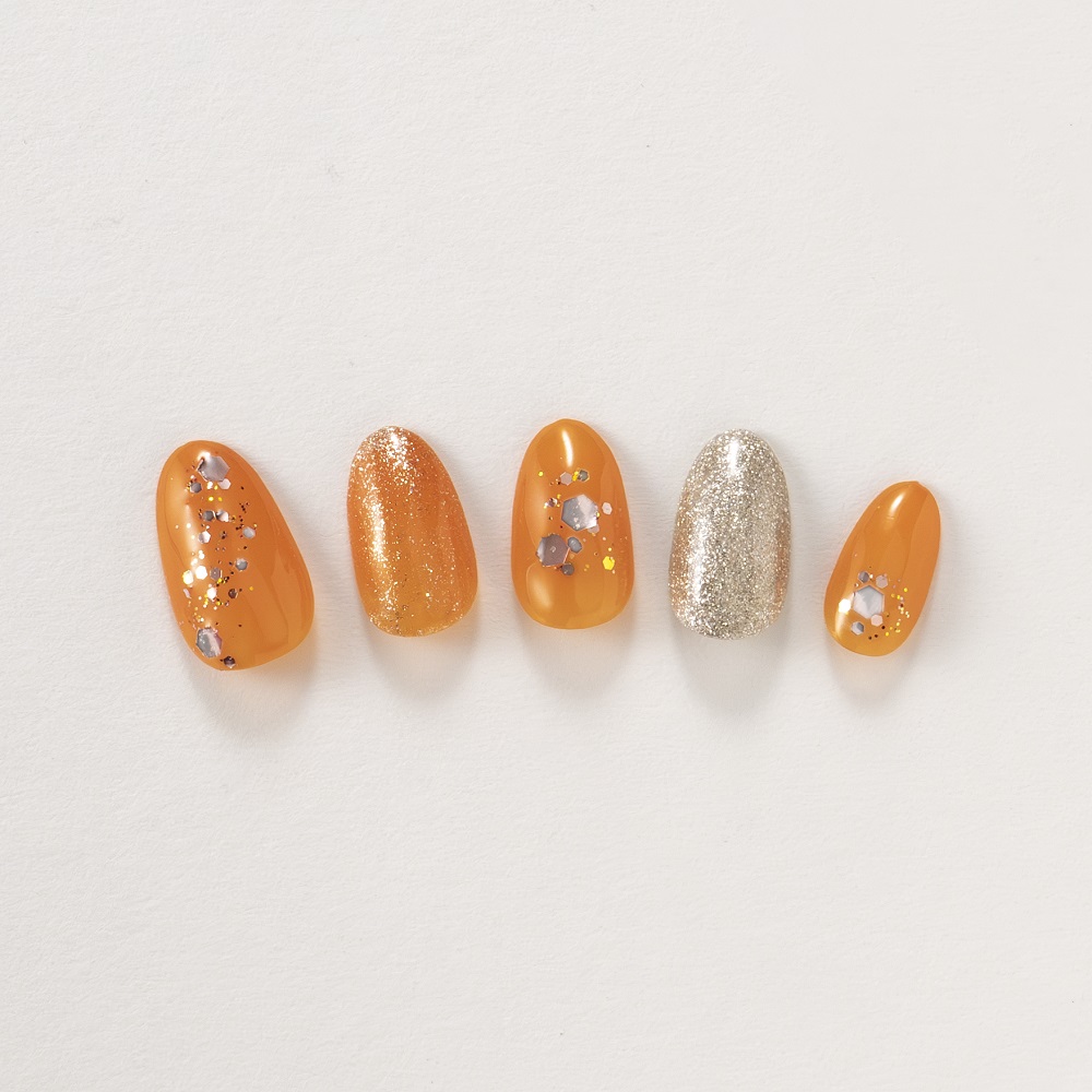 サマー(クリア、シルバー※ラメ入り、クリアオレンジ)と別売りのネイルアートセットを使って、華やかアレンジ!
