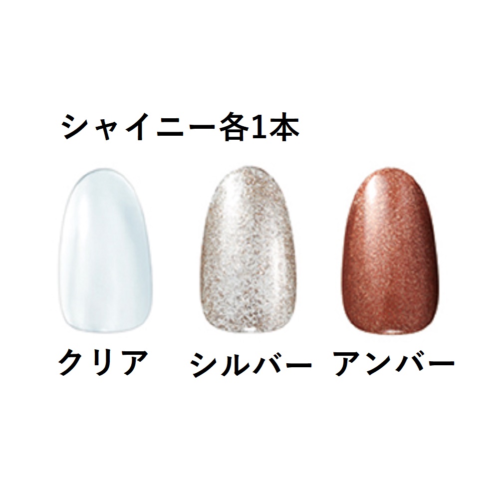 シャイニー(上から:クリア、シルバー※ラメ入り、アンバー※ラメ入り)