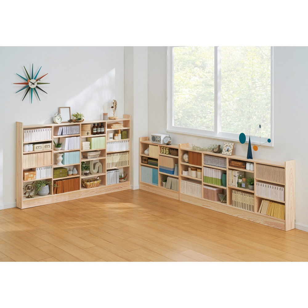 コーディネート例 シリーズは9種類のサイズがあり、室内を檜のラックで統一できます。 ※写真は左から幅150幅100cm、幅90高さ70cm、幅150高さ70cm