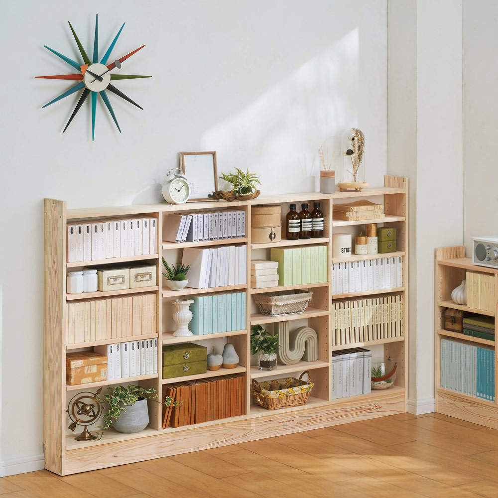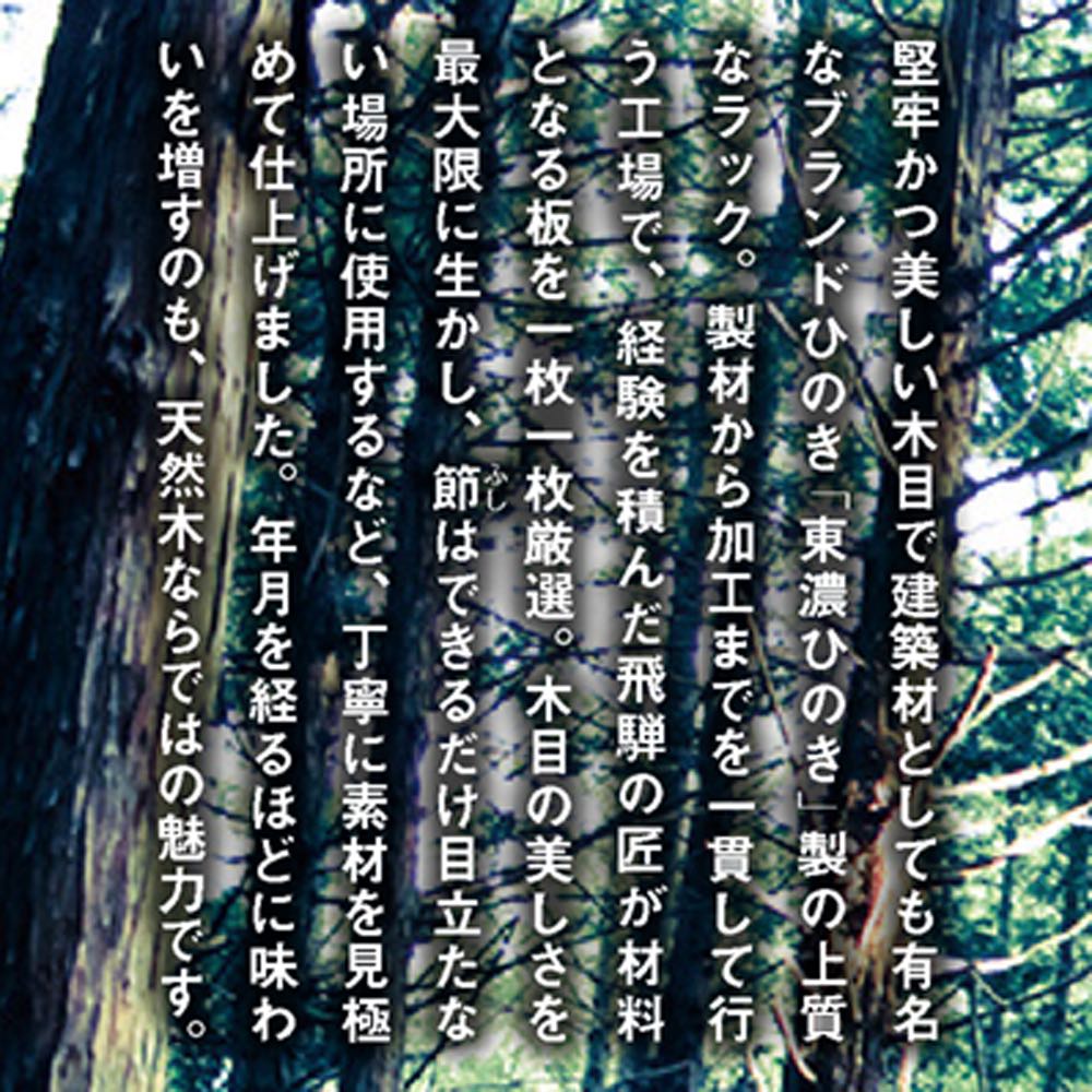 国産の東濃ひのきを贅沢に使用した、狭い通路やスペースにも無理なく置けてA4用紙も対応の奥行21cmの薄型ラックシリーズ。暮らしに寄り添う天然木の表情と、ひのきの豊かな香りが魅力です。飛騨の熟練の匠が、心を込めて1本1本丁寧に仕上げます。使用例(左から幅90高さ100cm、幅120高さ100cm ※画像は奥行15cmのより薄型タイプです。)国産天然木の柔らかな表情が魅力、薄型収納ラックシリーズカウンター下や窓下、廊下など、デッドスペースになりがちな空間を実用的な収納スペースに変える、奥行21cmの薄型ラック。リビングダイニングなどの憩いの場にも調和する、天然木の質感を存分にいかしたシリーズです使用例(左から幅150高さ100cm、幅90高さ70cm、幅150高さ70cm ※画像は奥行15cmのより薄型タイプです。)奥行が浅く、設置場所を選びませんちょっとしたスペースに置ける、奥行浅めの薄型収納。奥行の浅いキッチンカウンターの下にもキレイに収まります。リビングの窓下などに設置すれば、電話台、ローボード・窓下収納としても活躍。リビングに散らばりがちな小物をまとめてスッキリ。寝室などの窓下に設置して、書斎に収まりきらない本、CDやDVDなどの収納にもおすすめ。使用例(幅120高さ70cm ※画像は奥行15cmのより薄型タイプです。)狭い場所にも圧迫感なく置ける収納を諦めていたダイニングや廊下の壁面にも置けます。狭い玄関、リビングの空きスペースなど、様々なデッドスペースを有効活用。幅90cm高さ100cmタイプ ※画像は奥行15cmのより薄型タイプです。幅120cm高さ100cmタイプ ※画像は奥行15cmのより薄型タイプです。 ※赤文字は内寸(単位:cm)幅150cm高さ100cmタイプ 。※画像は奥行15cmのより薄型タイプです。幅は、90・120・150cmからお選びください。もしもの時も安心な、転倒防止金具が付属しています。薄型だけど頑丈仕様棚板耐荷重は1枚あたり約15kg!本や食器など重いものも安心して置けます。薄型でも収納力たっぷり。中皿や小鉢、買い置きの缶詰や瓶詰をまとめて、食器棚・キッチンストッカーとしてもお勧めの隙間収納です。高さ調整可能な棚板、背板がない仕様棚板は3cm間隔の可動式。物に合わせて高さ調節ができ、効率よく収納できます。また、背板がないので壁面のコンセントを活かすことができます。国産の檜無垢材を使用堅牢さと美しい木目、なめらかな手触り、香りが非常に高く建築材としても有名な国産檜。使い込む程に樹脂が表面に滲んで、味わい深い風格を与えます。また、粘り強い木材としても有名で、棚板耐荷重約30kgを実現。豊かな風合いが魅力の無垢材は北欧家具・北欧インテリアにも優しく調和します。安心と信頼の職人技が光る国産家具熟練の飛騨の家具職人がひとつずつ丁寧に仕上げた日本製。環境に配慮したF☆☆☆☆の材料を使用しています。組立不要の完成品でお届け。商品が到着したらすぐに使えるのも嬉しいポイントです。国産国消への取り組みとして、国内製造業の大切さに改めて目を向け、安心・信頼感の高い「Made in Japan」を応援していきたいと考えております。希少価値の高い国産檜を使用した匠のこだわり商品をぜひともお楽しみください。
