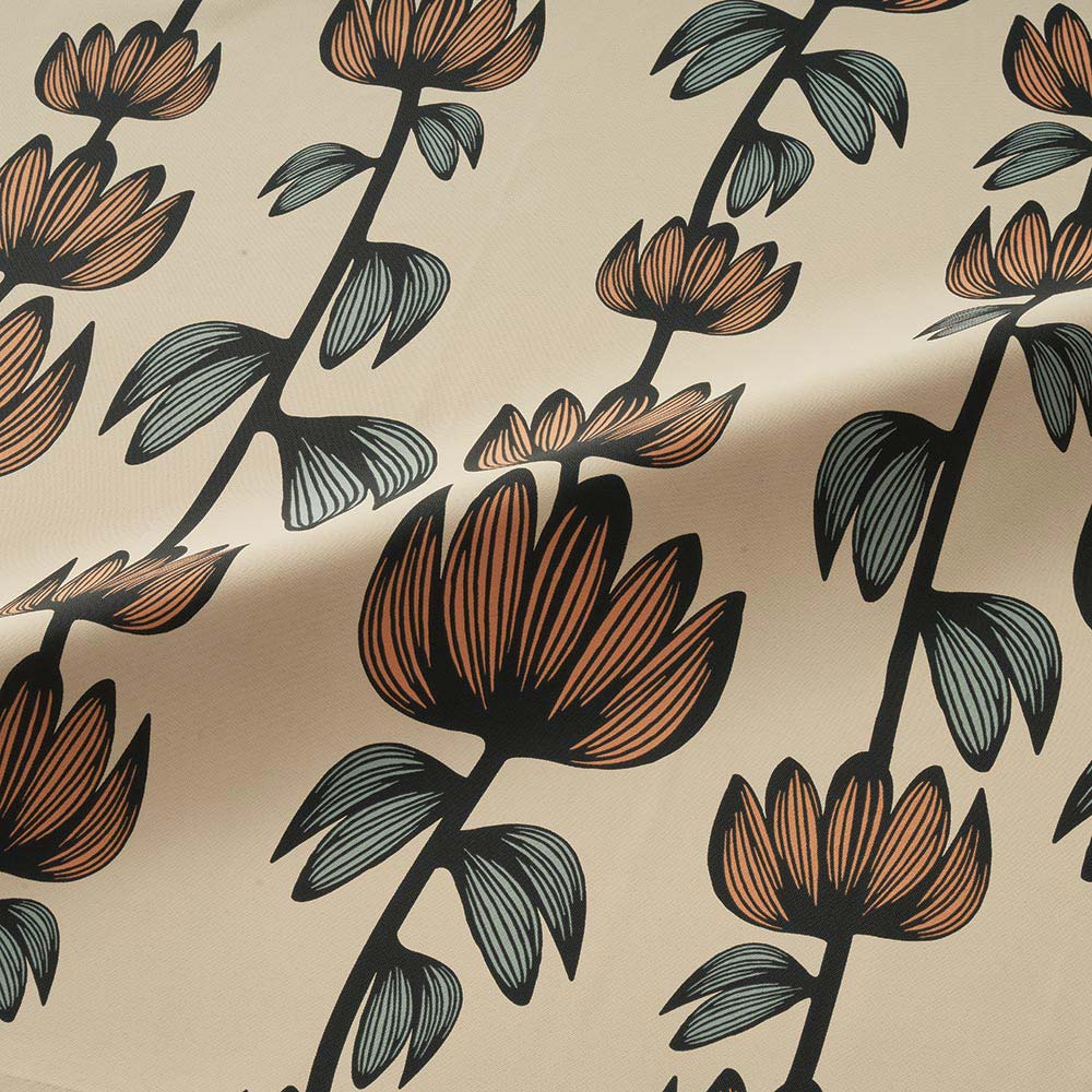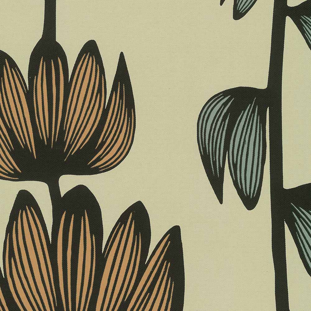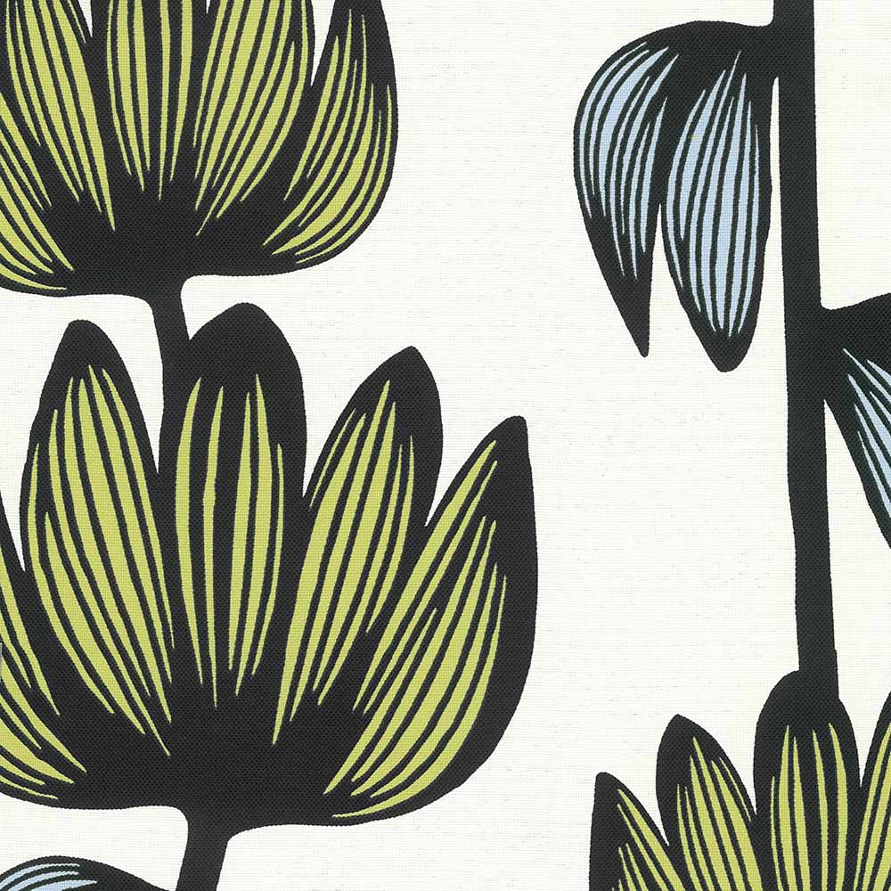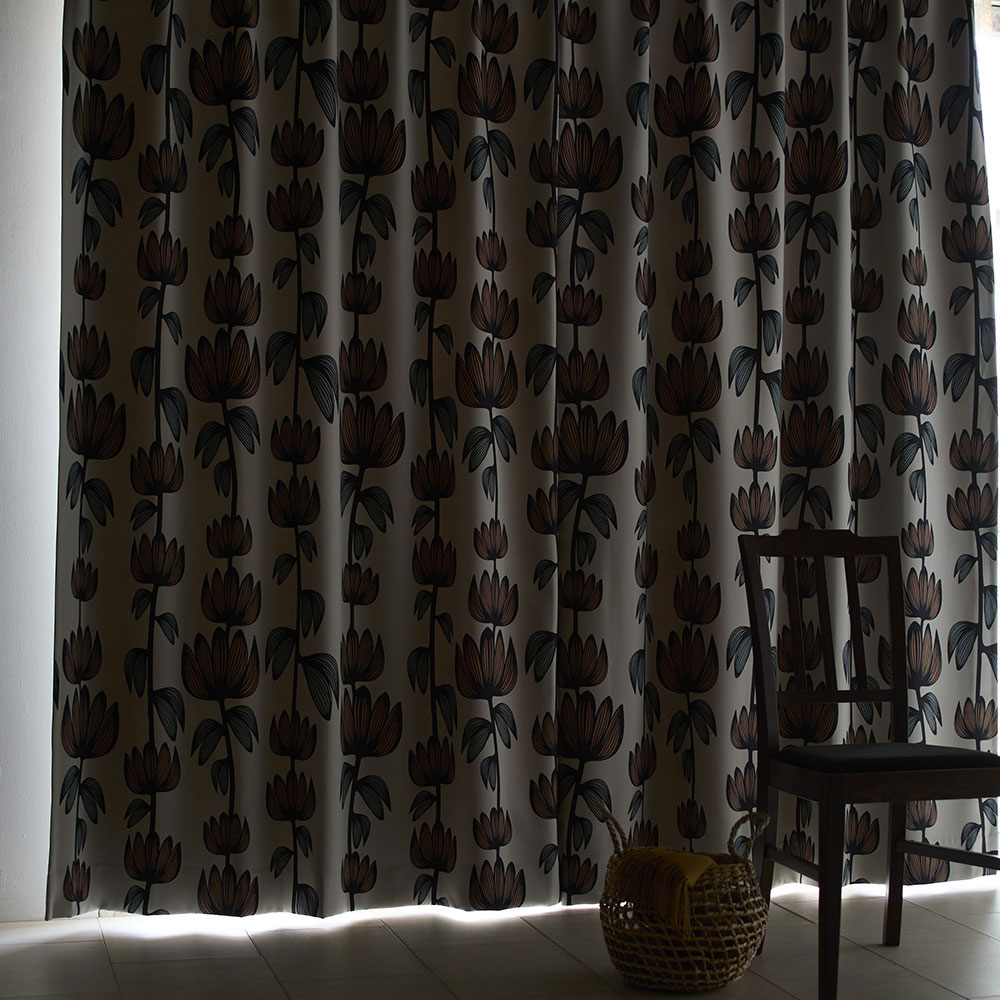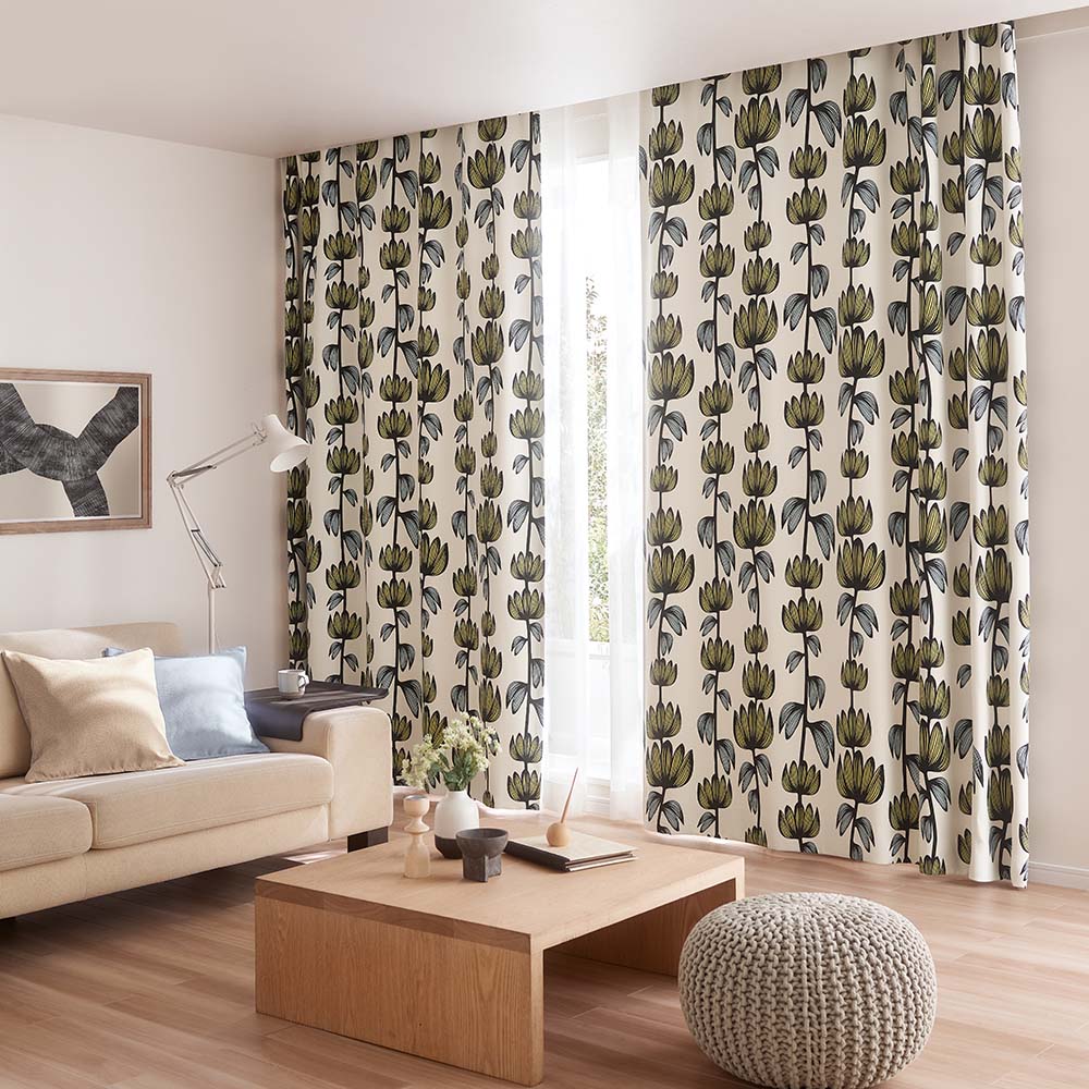 ニュアンスカラーの大胆な花柄が人気の遮光「アルマ」に、葉模様のレースカーテン「カイホ」を合わせて。お部屋に北欧のお庭を。
