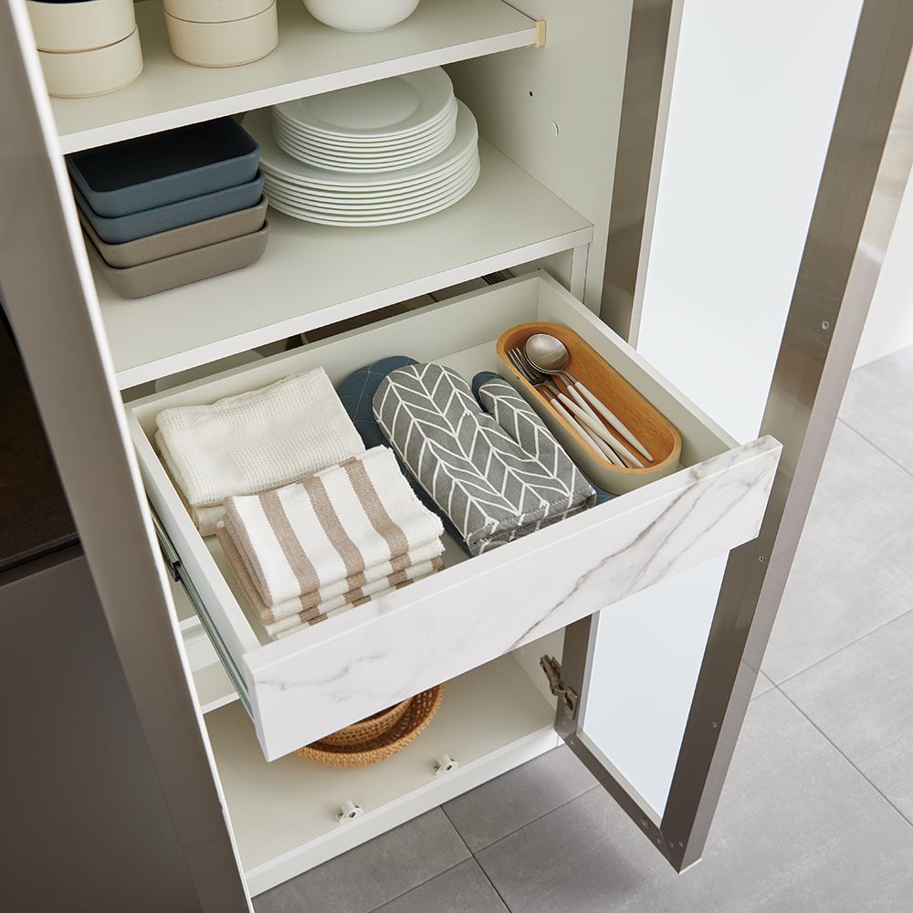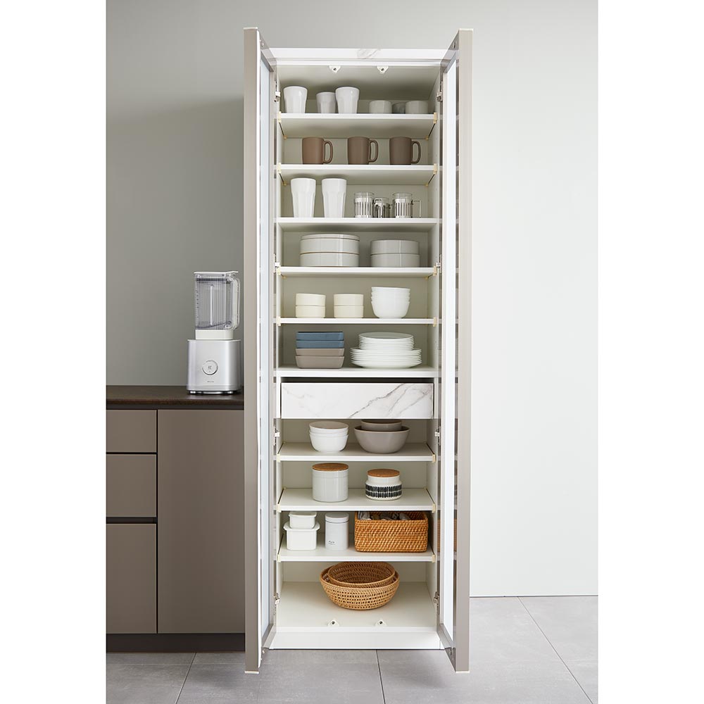 コンパクトなのに収納力◎、お部屋も高見えするデザインが魅力。収納物が微かに見える扉と家電収納部の石目柄(ホワイト)、セラミック柄(ブラック)がスタイリッシュな雰囲気を演出します。ご家庭の収納したい場所・モノに合わせてサイズと組み合わせが選べます。ガラス扉と収納部背面の柄が、こだわりの食器や家電を更に美しく見せます食器棚は上から下までガラス扉。収納物を適度に隠ししつつ、高級感を演出します。フィルム貼りガラスなので、万一割れても飛散防止のため安心。家電収納はオープンなため、背面がよく見えます。そこを石目柄(ホワイト)/セラミック柄(ブラック)にしたことでデザイン性をプラス。キッチン収納の主役になる、美しいボードです。来客時にも自慢できる空間づくりが実現します。コンパクトな幅サイズ展開で、憧れてるけど置けなかったスタイリッシュデザインの収納が叶いますキッチンボードやカウンターは、幅100〜160cmがメジャーですが、スペースが確保できず置けない…というお客様もいらっしゃるのではないでしょうか。高級感のあるデザインのキッチン収納アイテムをコンパクトな幅サイズ展開にして、どんなお家でも設置しやすいラインナップをご用意いたしました。食器棚は幅40cmの左右選択できる片扉タイプと、幅60cmの2枚扉タイプの2サイズ。家電収納は一般的な電子レンジが入る幅60cmと、大型レンジを入れても余裕が持てる幅80cmの2サイズです。お客様のキッチンスペースや収納したいモノに合わせて、組み合わせ自由自在のシリーズです。使いやすさにこだわったつくりもポイント◎食器棚は扉を開けると真ん中にインナー引出がついています。ここにカトラリーやミトンなど布物を収納しておくことができます。棚板は収納物に合わせて高さを変えられる可能棚が7枚つき。家電収納はスライドテーブルにフルスライドレールを使用しているため、奥までしっかり引き出せます。下部はゴミ箱や段ボール、お米など重たいもの・移動するものが楽に置けるオープンスペース。また、2口コンセントが上下2箇所についているので複数の家電を稼働させることができます。商品担当者からのメッセージ高級感漂うキッチンスペースにしたいけれど、我が家はマンションで限られた間取りのためサイズが合わない…ダイニングボードのような中天板はいらないから、とにかく沢山モノを収納したい…そんなお悩みを持つお客様に是非ご検討いただきたいのが本シリーズです!コンパクトな幅サイズだけど上から下まで収納できるスリムなキッチン収納アイテムです。お客様のキッチン空間に合わせて自由に組むことができます。単品でお使いいただくも良し、3台4台と並べて置くも良し。憧れのキッチンに少しでも近づくお手伝いができますと幸いです。