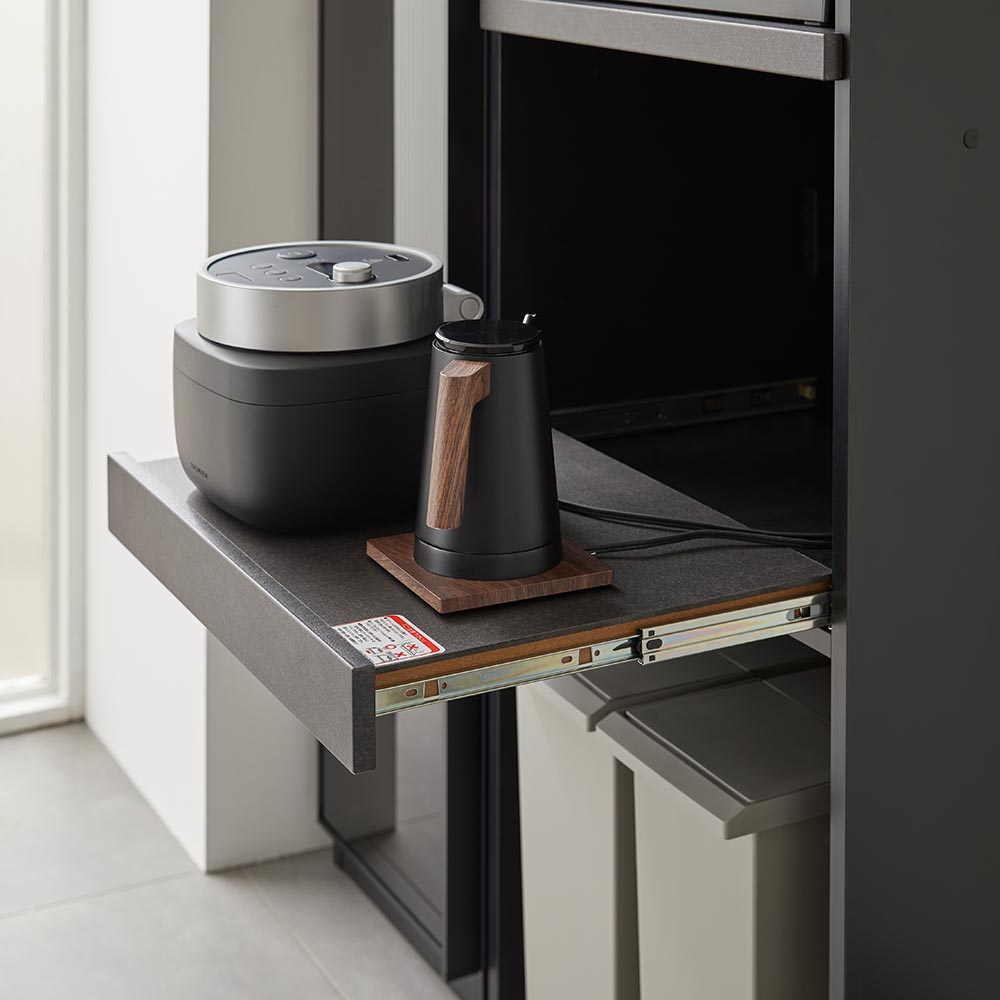 コーディネート例(イ)ブラック ハイグレード家電がマッチするお洒落なキッチンボード。 ※左:食器棚幅40cm 右:レンジボード幅60cm