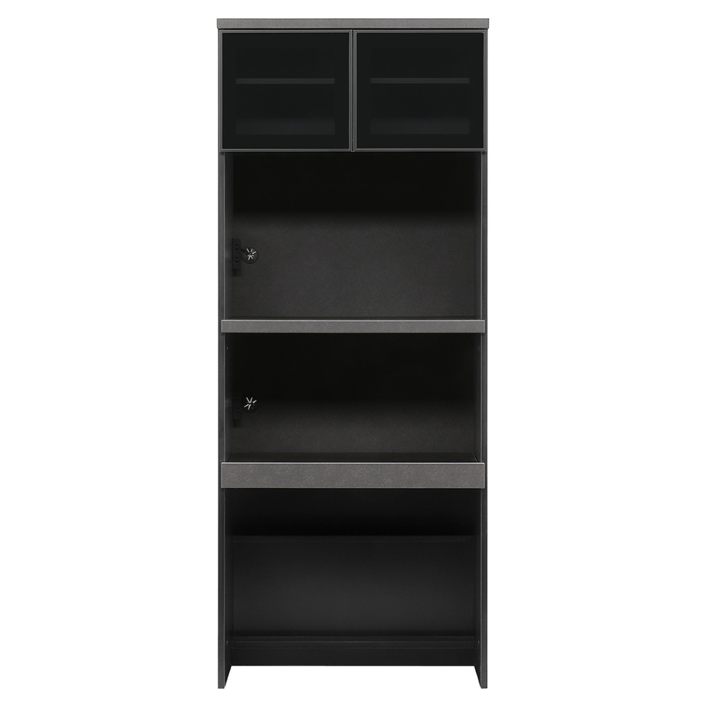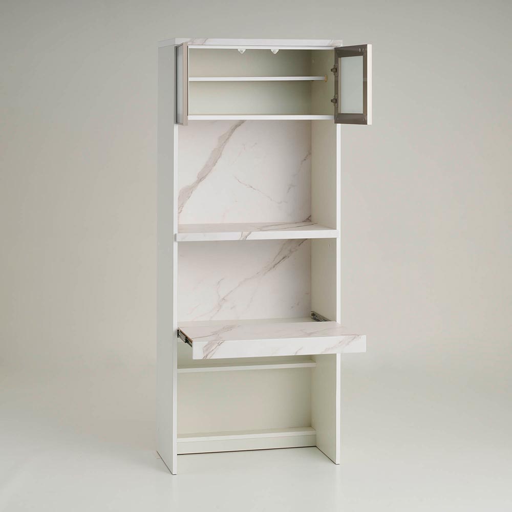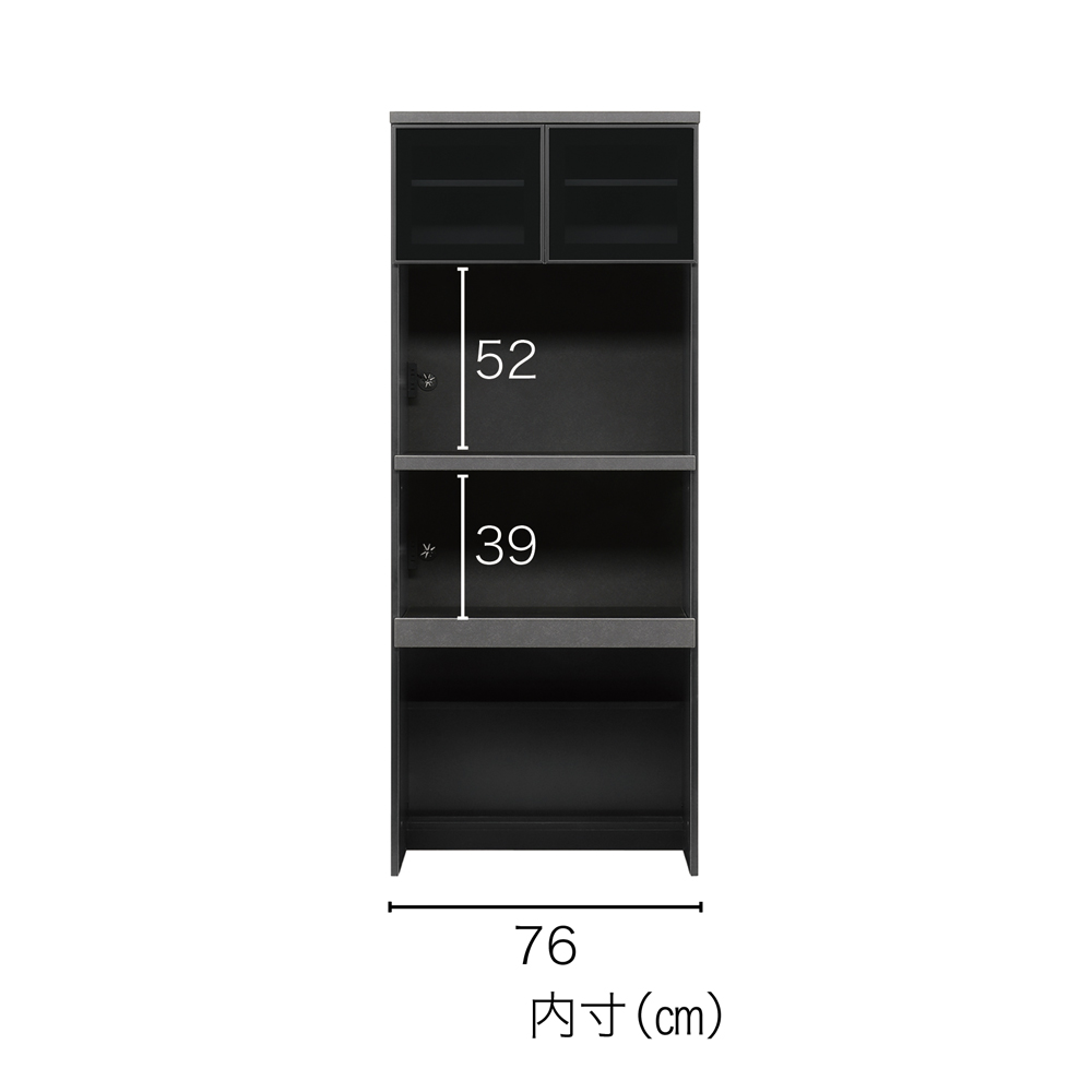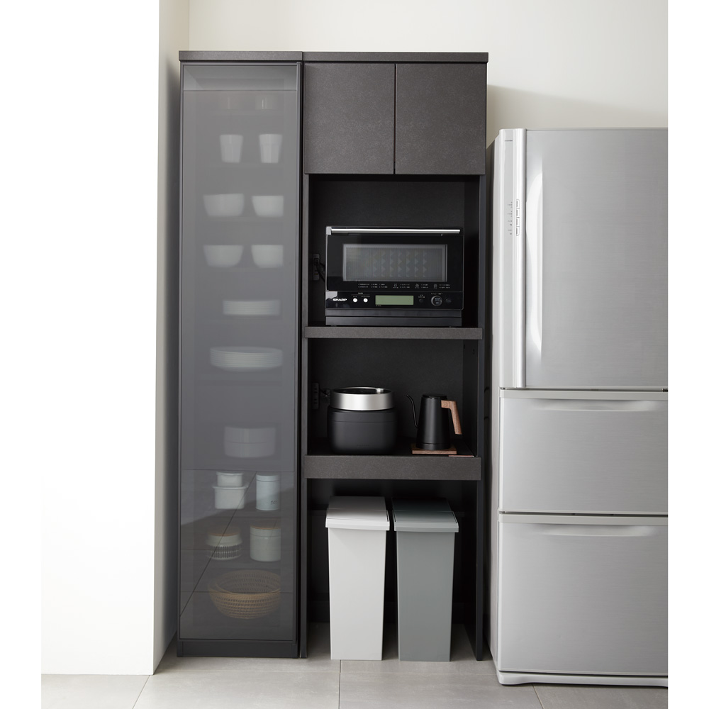 コンパクトなのに収納力◎、お部屋も高見えするデザインが魅力。収納物が微かに見える扉と家電収納部の石目柄(ホワイト)、セラミック柄(ブラック)がスタイリッシュな雰囲気を演出します。ご家庭の収納したい場所・モノに合わせてサイズと組み合わせが選べます。ガラス扉と収納部背面の柄が、こだわりの食器や家電を更に美しく見せます食器棚は上から下までガラス扉。収納物を適度に隠ししつつ、高級感を演出します。フィルム貼りガラスなので、万一割れても飛散防止のため安心。家電収納はオープンなため、背面がよく見えます。そこを石目柄(ホワイト)/セラミック柄(ブラック)にしたことでデザイン性をプラス。キッチン収納の主役になる、美しいボードです。来客時にも自慢できる空間づくりが実現します。コンパクトな幅サイズ展開で、憧れてるけど置けなかったスタイリッシュデザインの収納が叶いますキッチンボードやカウンターは、幅100〜160cmがメジャーですが、スペースが確保できず置けない…というお客様もいらっしゃるのではないでしょうか。高級感のあるデザインのキッチン収納アイテムをコンパクトな幅サイズ展開にして、どんなお家でも設置しやすいラインナップをご用意いたしました。食器棚は幅40cmの左右選択できる片扉タイプと、幅60cmの2枚扉タイプの2サイズ。家電収納は一般的な電子レンジが入る幅60cmと、大型レンジを入れても余裕が持てる幅80cmの2サイズです。お客様のキッチンスペースや収納したいモノに合わせて、組み合わせ自由自在のシリーズです。使いやすさにこだわったつくりもポイント◎食器棚は扉を開けると真ん中にインナー引出がついています。ここにカトラリーやミトンなど布物を収納しておくことができます。棚板は収納物に合わせて高さを変えられる可能棚が7枚つき。家電収納はスライドテーブルにフルスライドレールを使用しているため、奥までしっかり引き出せます。下部はゴミ箱や段ボール、お米など重たいもの・移動するものが楽に置けるオープンスペース。また、2口コンセントが上下2箇所についているので複数の家電を稼働させることができます。商品担当者からのメッセージ高級感漂うキッチンスペースにしたいけれど、我が家はマンションで限られた間取りのためサイズが合わない…ダイニングボードのような中天板はいらないから、とにかく沢山モノを収納したい…そんなお悩みを持つお客様に是非ご検討いただきたいのが本シリーズです!コンパクトな幅サイズだけど上から下まで収納できるスリムなキッチン収納アイテムです。お客様のキッチン空間に合わせて自由に組むことができます。単品でお使いいただくも良し、3台4台と並べて置くも良し。憧れのキッチンに少しでも近づくお手伝いができますと幸いです。