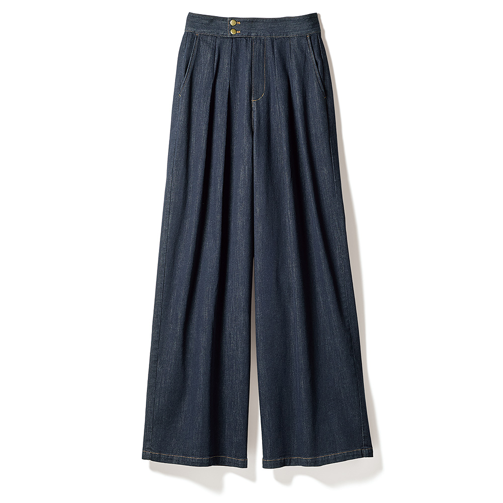 カジュアルこそ、品良く、軽やかに!軽く暖かな冬素材に女性らしいディテールを映したアイテムで、大人の毎日をさらに美しいものに。デニム×きれいめデザインでカジュアルが見違えるカジュアルとエレガンスをボーダーレスに纏う楽しみ方も大人の余裕の表れ。日本が誇る「カイハラ(株)」のデニムで仕立てた新作ワイドパンツ。持ち出し付きのハイウエストベルト、中縫いで押さえたツータック、腰ダーツに飾りヒップポケットなど、ウエストから腰周りをコンパクトに仕上げることで、ワイドシルエットでもカジュアルすぎず、脚長効果も絶大に。≫ POINTバイオウォッシュ加工でソフトに仕上げた「カイハラ(株)」のストレッチデニムを使用。色落ちしにくく、扱いやすい反応染めです。