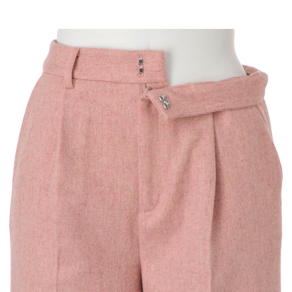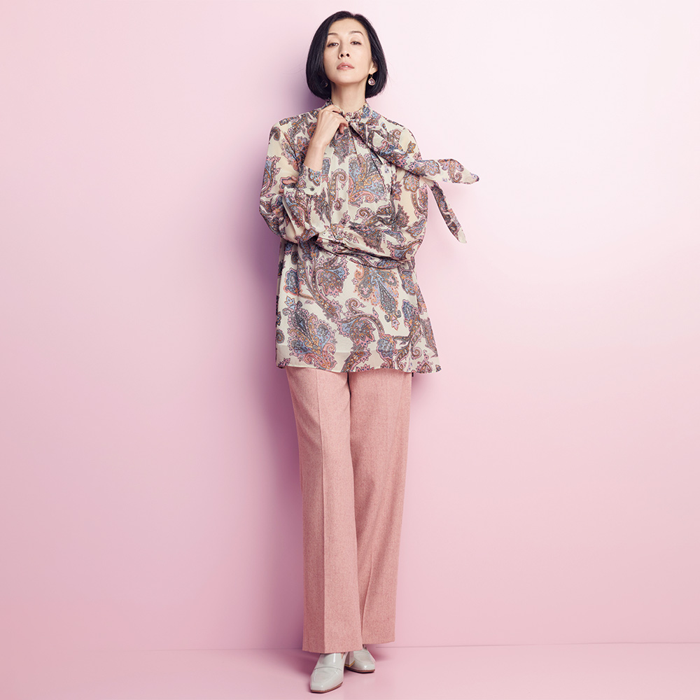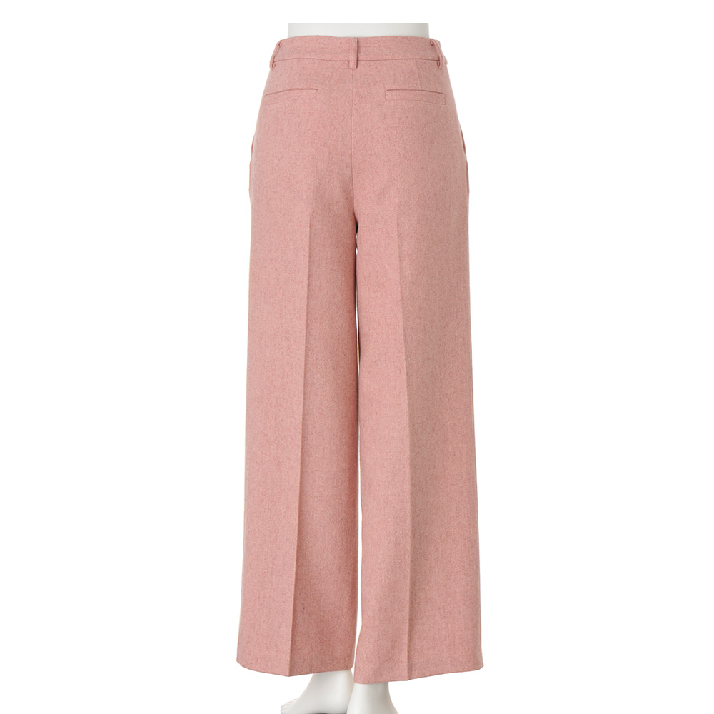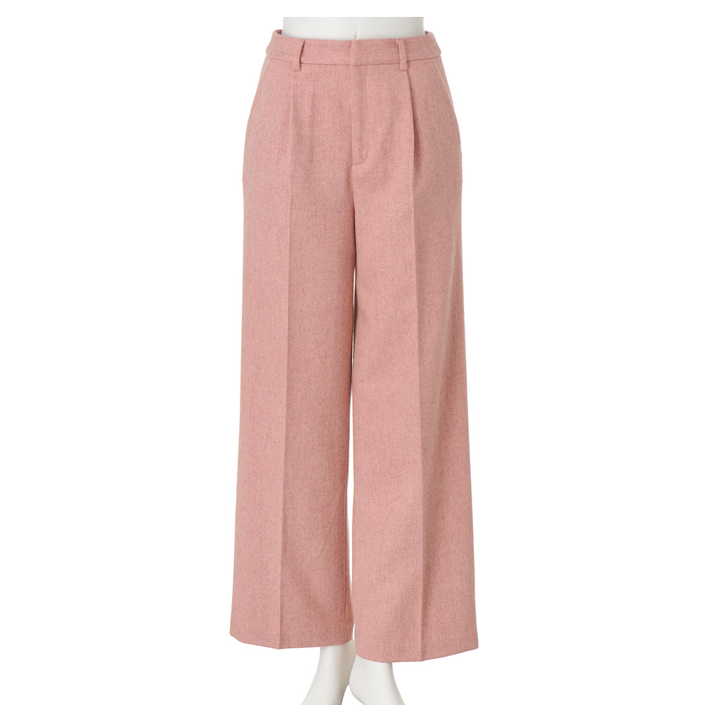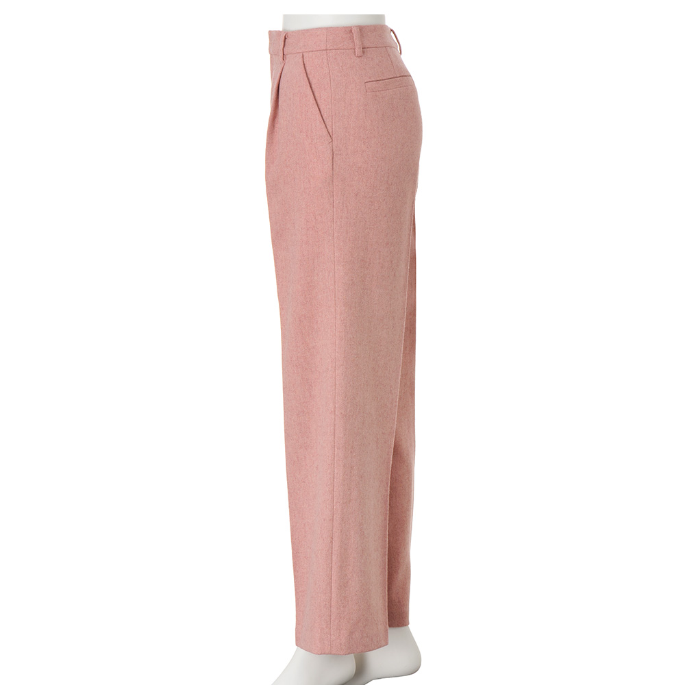 甘さ控えめなスモーキートーンが格上の華やぎを表現。ピンクを主役にしたコーディネートは、柔らかな奥行きを意識するのが洗練ルール。尾州産のウール混フラノ地のパンツ。リサイクルウールを混紡することにより、自然な色ムラと繊細な立体感が醸す温かみがラグジュアリーな雰囲気です。それをあえて知的モードなワイドパンツに仕上げるのが、DAMAコレクションのバランス学。甘さの中に薫る凛とした表情が、マチュア世代の魅力を物語ります。≫ POINTフロントのタックとセンタープレスで仕事スタイルにも合うきちんと感を意識。