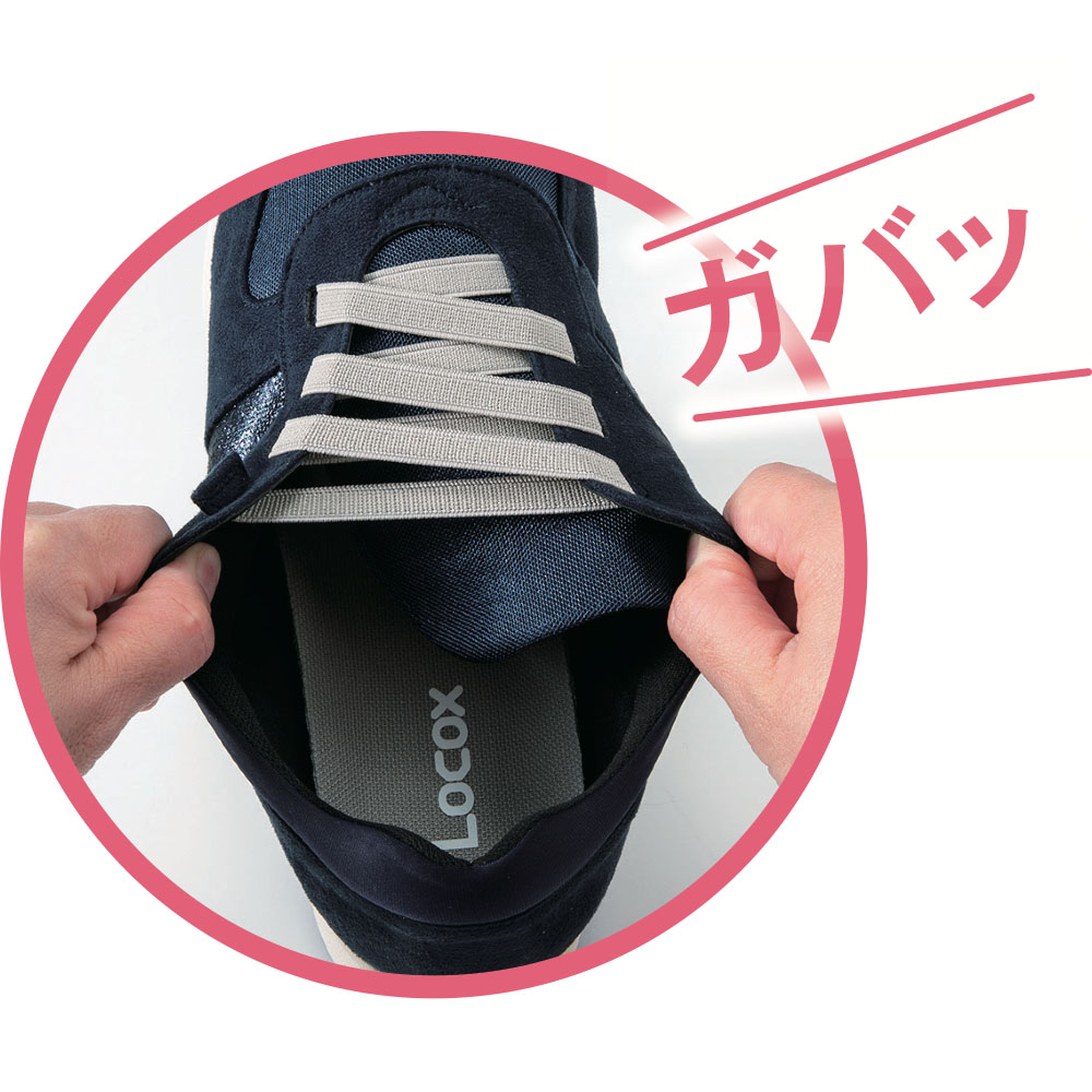 靴ひもはゴムでガバッと開き脱ぎ履きラクチン。
