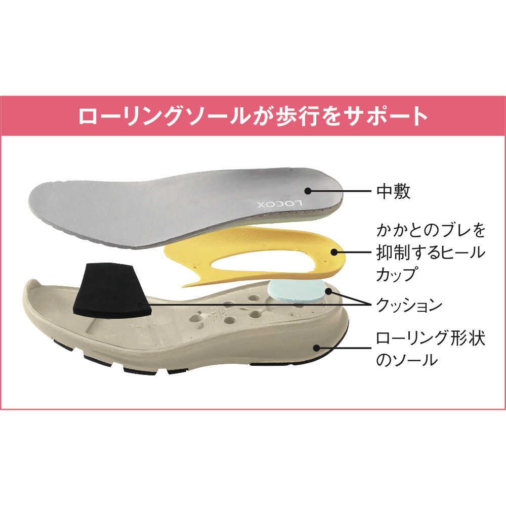ローリングソールで自然と足が前に出る!ぐんぐん歩けるスニーカーあとりえ岡田×ロコックス人気ブランドと日本ウォーキング協会のコラボシューズ!ローリングソールで自然と足が前に出るのをサポート。ゴム紐タイプで脱ぎ履きしやすく、紐がほどける心配も無く、ウォーキングがさらに快適に。