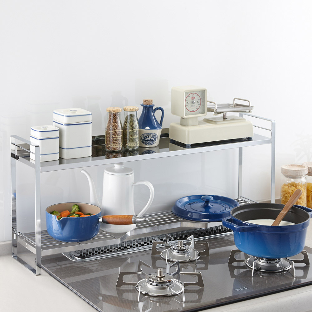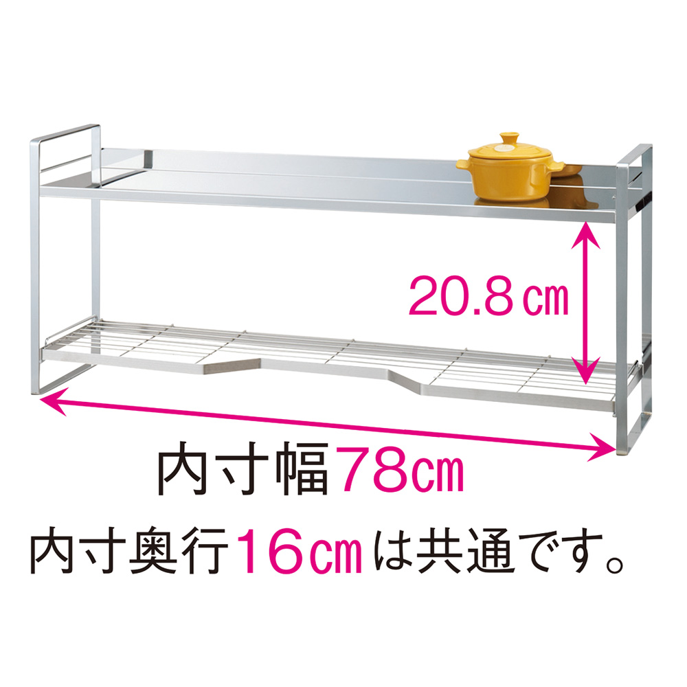 デッドスペースになりがちなコンロ奥を収納に活用できるステンレス製のラック。底板がなく、コンロの排気口をふさがない設計のキッチンラックです。調味料や小鍋がコンロの奥や横など手が届く場所に置けて、料理中の探し物もゼロに!ステンレス製の棚板・網棚で熱や汚れに強くお手入れ簡単なラック!◆棚板・網棚は厚い鍋もおけて、水や汚れに強いステンレス製。◆燕三条の工場で、熟練の職人が1点1点丁寧に作っており、国産ならではの丁寧なつくりをお楽しみいただけます。◆フレームもスチール製の頑丈な造り。◆底板がない構造なので、コンロ奥の排気口をふさがずに設置できます。すぐ手に取れる場所に必需品が置けて、テキパキ手際よく調理♪◆調味料ケースやスパイス、オイルの瓶や小鍋などがコンロ回りにズラリと並べられるラック。◆狭いキッチンでも効率よく収納スペースを増やします。◆よく使うものが料理しながら取りやすい位置に置けるから、探す時間や取りに行く手間が省けて、料理がはかどります。◆コンロ奥にもコンロ横にも置ける奥行17.5cmの薄型設計なので、置き場を選びません。◆ご自宅のキッチンのデッドスペースが収納に生まれ変わる、便利な収納ラックです。