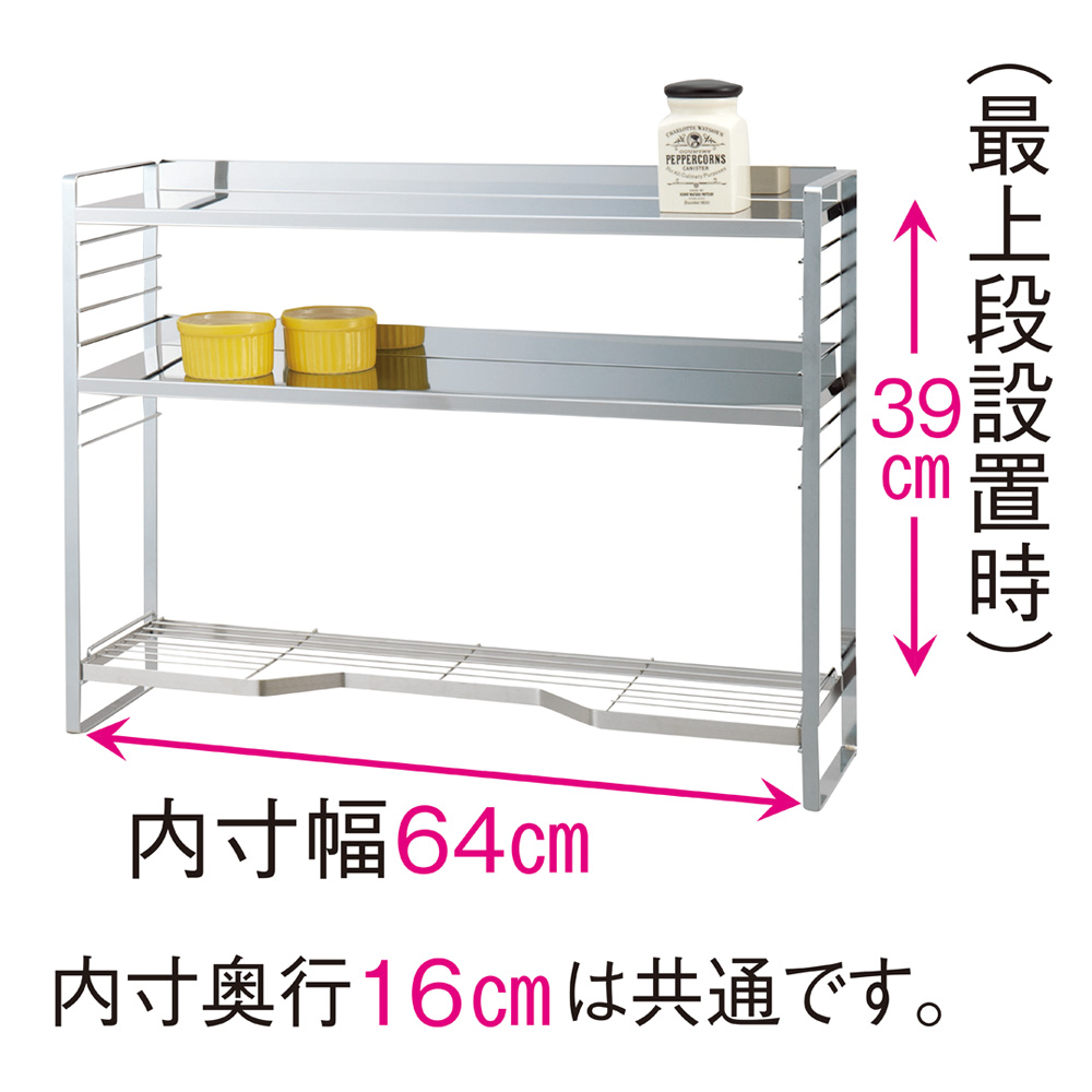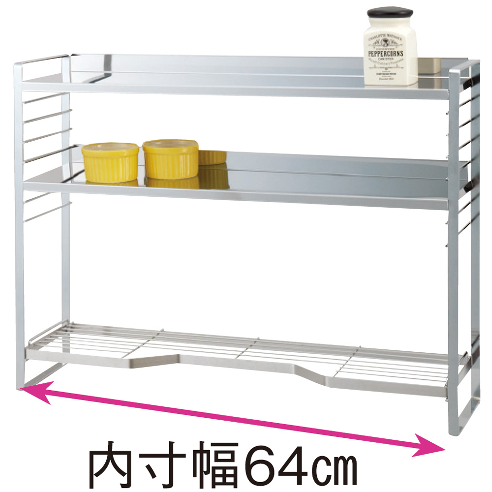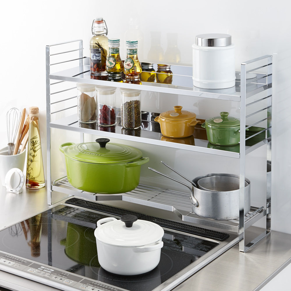 デッドスペースになりがちなコンロ奥を収納に活用できるステンレス製のラック。底板がなく、コンロの排気口をふさがない設計のキッチンラックです。調味料や小鍋がコンロの奥や横など手が届く場所に置けて、料理中の探し物もゼロに!ステンレス製の棚板・網棚で熱や汚れに強くお手入れ簡単なラック!◆棚板・網棚は厚い鍋もおけて、水や汚れに強いステンレス製。◆燕三条の工場で、熟練の職人が1点1点丁寧に作っており、国産ならではの丁寧なつくりをお楽しみいただけます。◆フレームもスチール製の頑丈な造り。◆底板がない構造なので、コンロ奥の排気口をふさがずに設置できます。すぐ手に取れる場所に必需品が置けて、テキパキ手際よく調理♪◆調味料ケースやスパイス、オイルの瓶や小鍋などがコンロ回りにズラリと並べられるラック。◆狭いキッチンでも効率よく収納スペースを増やします。◆よく使うものが料理しながら取りやすい位置に置けるから、探す時間や取りに行く手間が省けて、料理がはかどります。◆コンロ奥にもコンロ横にも置ける奥行17.5cmの薄型設計なので、置き場を選びません。◆ご自宅のキッチンのデッドスペースが収納に生まれ変わる、便利な収納ラックです。