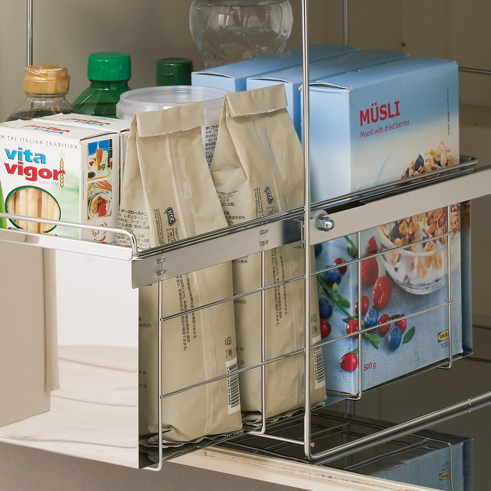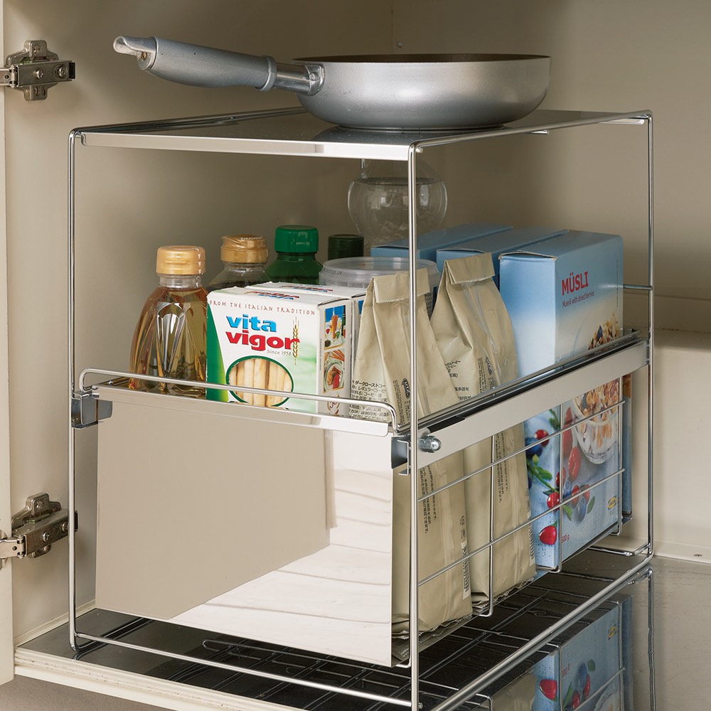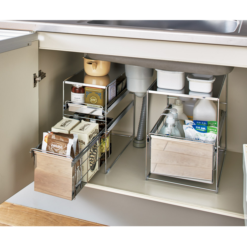 ゴチャつくシンク下が大変身!キッチンカウンターや洗面所のシンク下を美しく有効活用する、ステンレス製のシンク下収納です。引き出し式で奥のものも取り出しやすく、調味料や洗剤のボトルなどを効率良く収納できます。日本製の引き出し式スライドキッチンラックなので、しっかりとした作りで耐久性があり、長くお使いいただけます。便利なステンレスの天板は、フライパンや小さい鍋、調理トレーなどの調理具・キッチン雑貨の収納棚としても◎。スタイリッシュで丁寧な仕上げの国産品です。〜スライド式で取り出しやすいシンク下収納ラック〜◆キッチンのシンク下を、使い勝手の良い引き出し式の収納棚にするキッチンラック。◆キッチン収納で人気のステンレスを使用したコンロ下収納です。◆スライド式なので、カウンター下の奥の物も簡単に取り出せます。◆選べる幅は、20cm/25cm/28.5cmの3タイプ。◆ご自宅の隙間に合わせて、ぴったりのサイズを選べます。◆キッチンのコンロ下や洗面台下の排水パイプを避けて、空いたスキマに設置することも可能。◆1段タイプは背の高いボトルや洗剤、ペットボトルの収納にオススメ。◆2段タイプの引出トレーには、キッチン雑貨や缶詰・レトルト食品などのストック類を収納できます。◆洗面台下のラックとして洗剤やハウスキーピング用品・掃除道具の収納にもご使用頂けます◆キッチンキャビネットとして、スパイスラック・調味料収納にもおすすめです。〜見えないところにも気を抜かない、シンクまわりの収納アイデア〜◆スタイリッシュな光沢が美しいステンレス製のコンロ下収納です。◆水に強くお手入れ簡単で清潔感があります。◆引出はワイヤーのバスケットになっているので通気性が良いのも魅力。◆ずっと気になっていたシンク下のごちゃごちゃをすっきり整理整頓できる便利収納です。◆国内工場で丁寧に仕上げた、日本製のシンク下収納です。