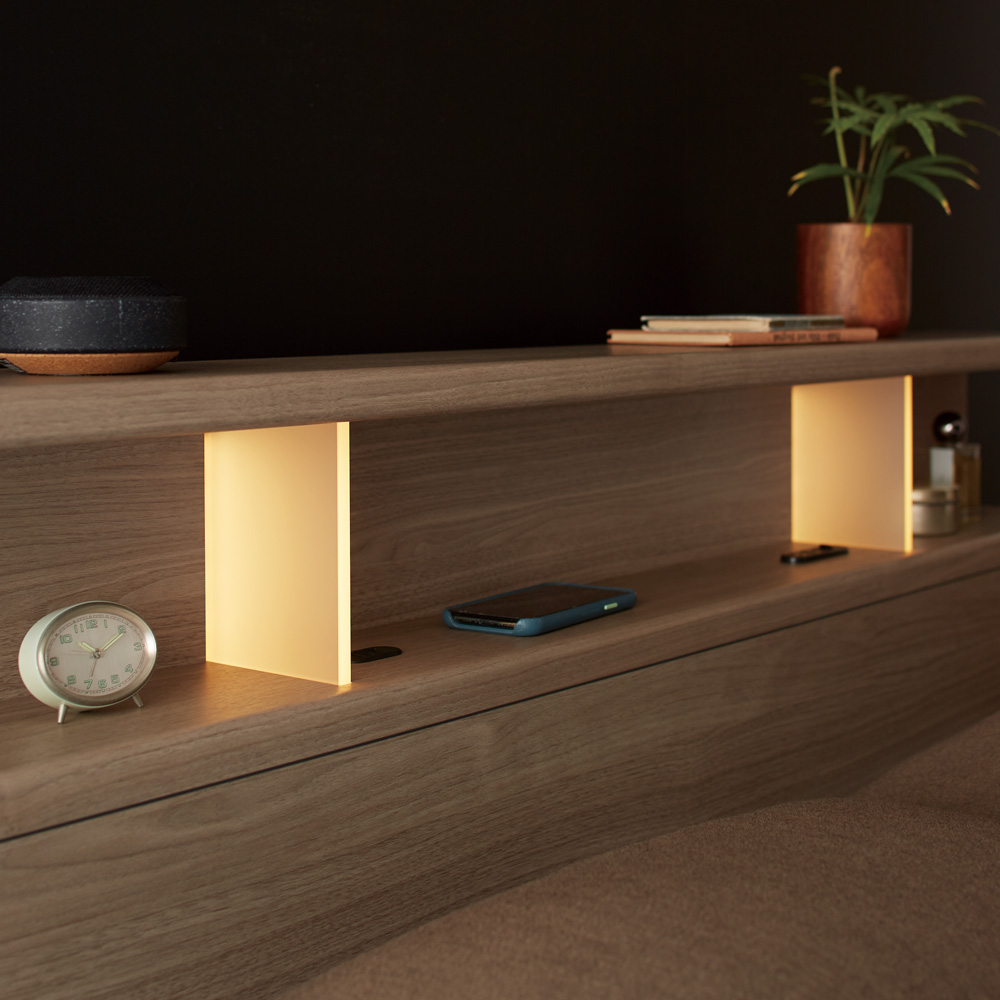 ヘッドボードのLED照明が枕元をやさしく照らします。