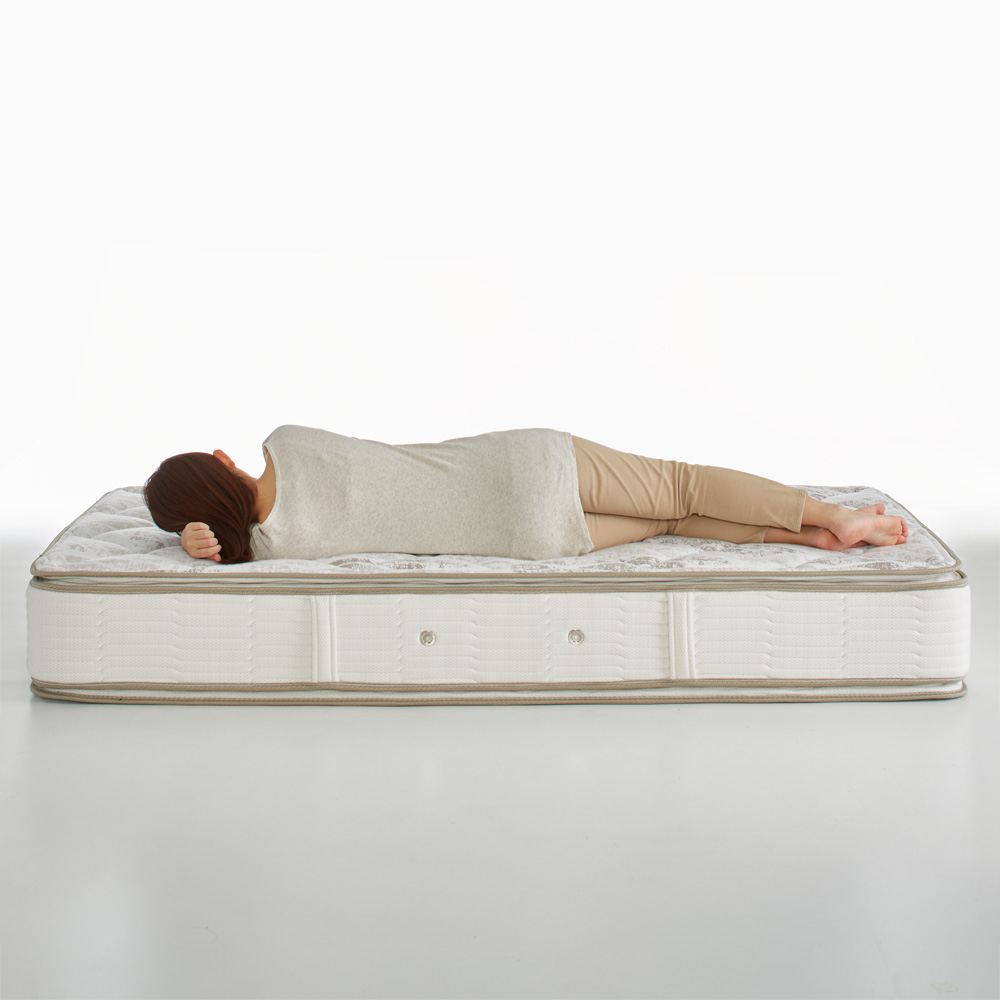 【この上ない眠りと心地よい安定感を贅沢に味わうピロートップ仕様】マットレスの上にもう1層、一体化したクッション材を施した、やさしく体を包み込む贅沢な寝心地。