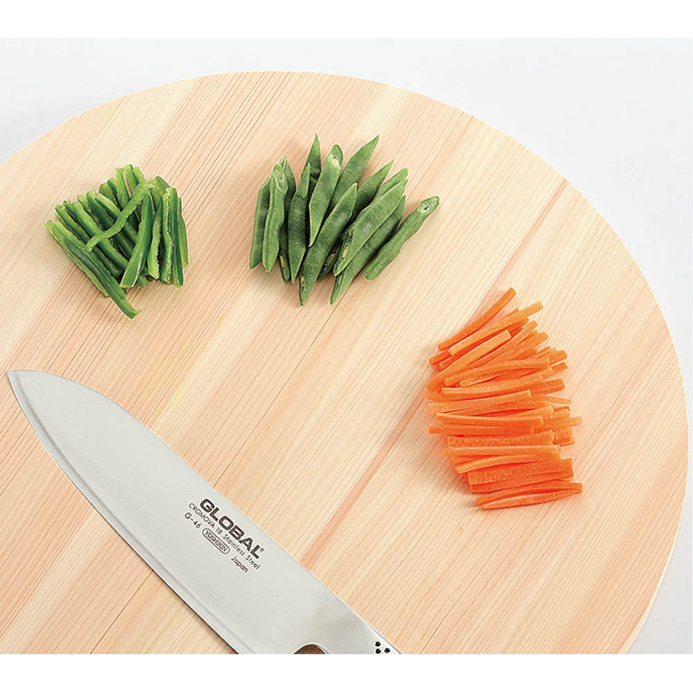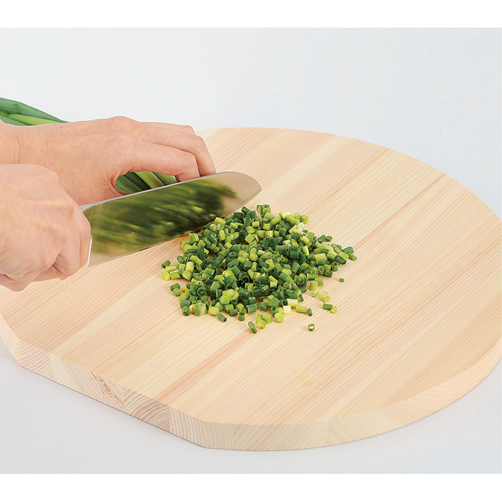 じっくり育った東濃(とうのう)ひのきを使いやすくモダンな形のまな板に。作業台を効率よく使える形が好評です。まな板に適した国産の東濃(とうのう)ひのきを使用していていますひのきは耐水性・耐久性が高く、軽くて丈夫で衛生的。日本の水まわりで古くから活躍してきたひのき製のまな板です。それも国産の東濃ひのきにこだわりました。東濃ひのきとは岐阜県の東濃地域はやせ土地で、年間降雨量が少なく、冬の寒さが厳しい、植物が育つには非常に厳しい環境です。東濃ひのきは他の地方の桧の何倍もの時間をかけて成長するため年輪幅が狭く、強度があり、反りにくいのが特徴です。見慣れない丸型ですが・・これが使うと便利なのです!まな板は長方形が一般的で、丸型は中華用のまな板くらいしかなかなかないですよね?しかし、丸型だからこその使い勝手にきっと驚くはずです!長方形のまな板、使っているのはほとんど中心部で両端はネギなど長い食材を使うとき以外実はあまり使っていないのです。丸型だと両端がないぶん作業台がかなり広々使えます!その分奥行があるのでコロコロ転がリやすいキュウリなどもしっかりキャッチ!またクルクル回転させながら使えば少しづつの食材を一回できることができるのも丸型ならではです。軽くて扱いやすいです。厚みが2cmあるので包丁の刃当たりがとってもいいのですが、ヒノキ製だからとっても軽いのです!もしこれが樹脂製ならもっと重くなったはず。それに厚みがあるので自立して乾かすのも簡単です。