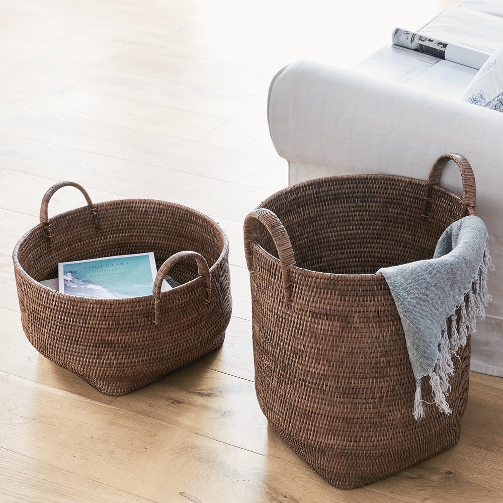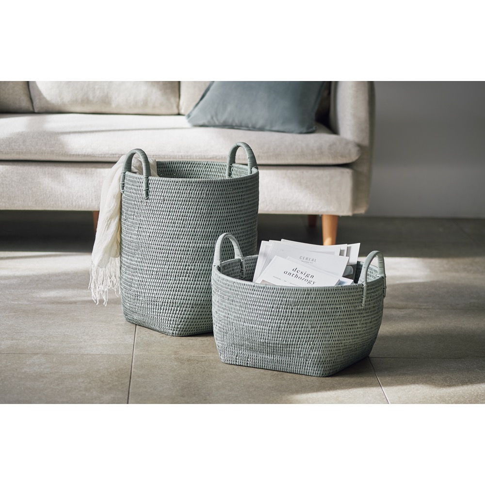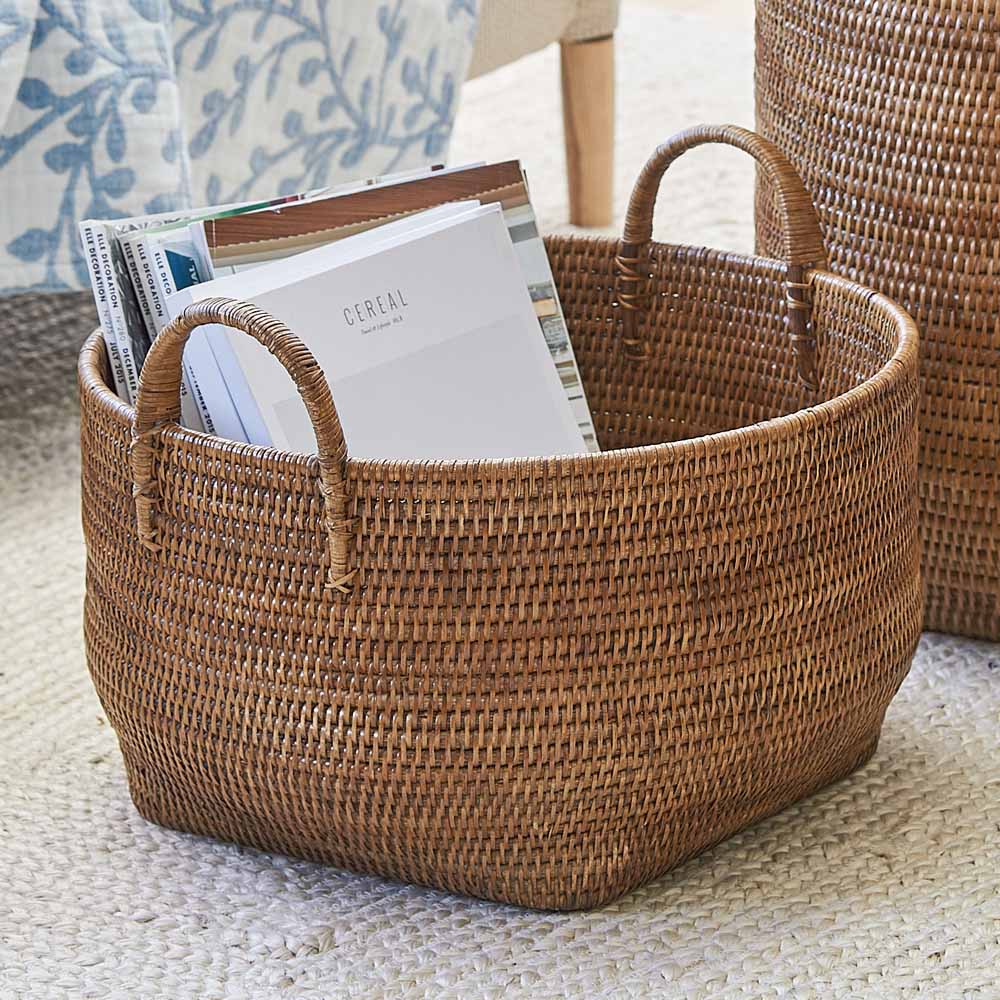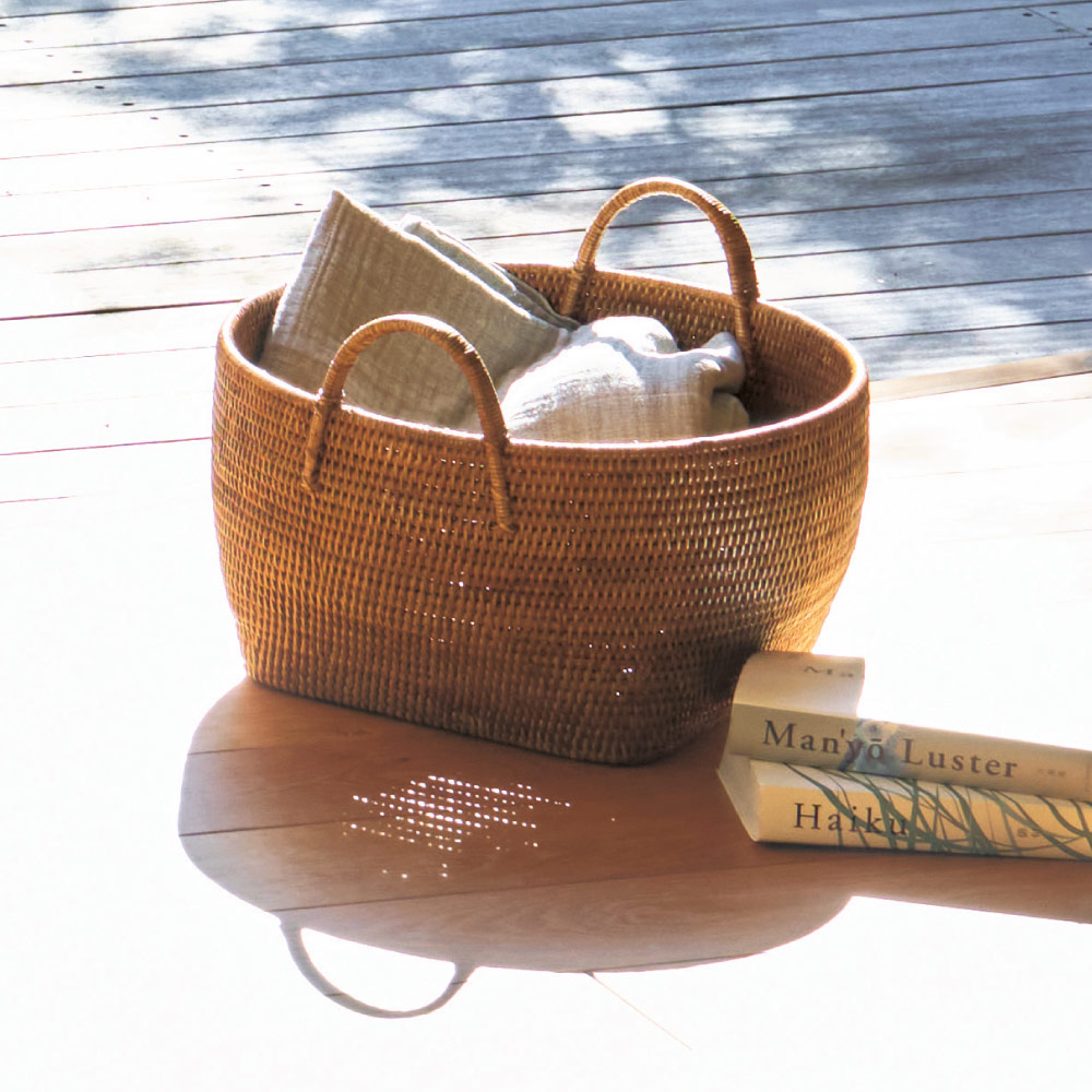 雑多収納に重宝。手編みのラタンバスケット。リビングに調和する、実用的なラタンバスケットシンプルなデザインで、日常生活のさまざまな場面になじむミャンマー製ラタンバスケット。洗練されたナチュラルと、落ち着いたグレイッシュグリーンの2色から選べるカラーバリエーションをご用意しています。持ち手付きで移動も簡単、毎日の暮らしに寄り添うバスケットです。表面はウレタン塗装で引っかかりにくく、底面が四角いので収納しやすいのも魅力。本・雑誌や新聞はもちろん、ごちゃごちゃ散らかりがちな場所で活躍します通気性と耐久性に優れたラタン素材ラタン(籐)は涼しさと温かみを同時に感じられる自然素材です。しなやかで丈夫な特徴に加え、通気性も備えているため、リビングや寝室、キッチンなどさまざまなシーンで快適にご使用いただけます。収納力と使い勝手マガジンラックとして雑誌や新聞の置き場にしたり、リビング小物の収納、洗濯物入れ、ランドリーバスケットなど幅広く活用できます。底面はしっかり平らに仕上げてあり安定感もあります。シンプルなデザインがインテリアに調和余計な装飾のないデザインは和洋問わず、どんなインテリアにも自然に調和します。高級リゾートホテルでも採用されるクオリティーミャンマーの職人たちが手編みで製作しています。その高い品質からヨーロッパを中心に輸出されています。高級リゾートホテルや世界的ブランドでも高く評価されています。