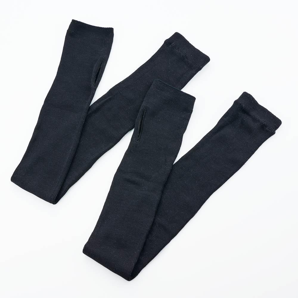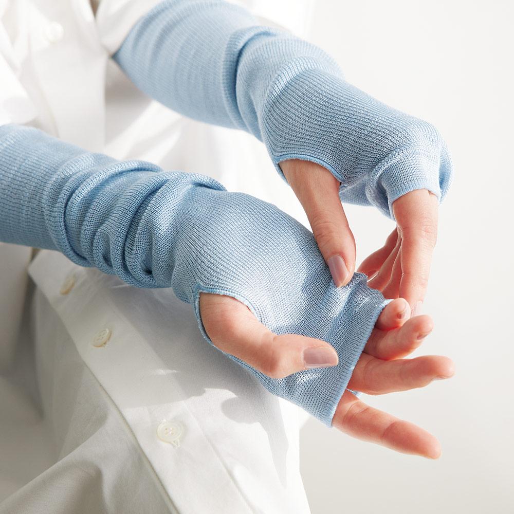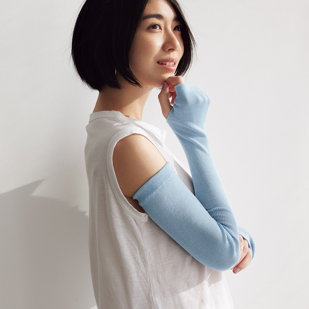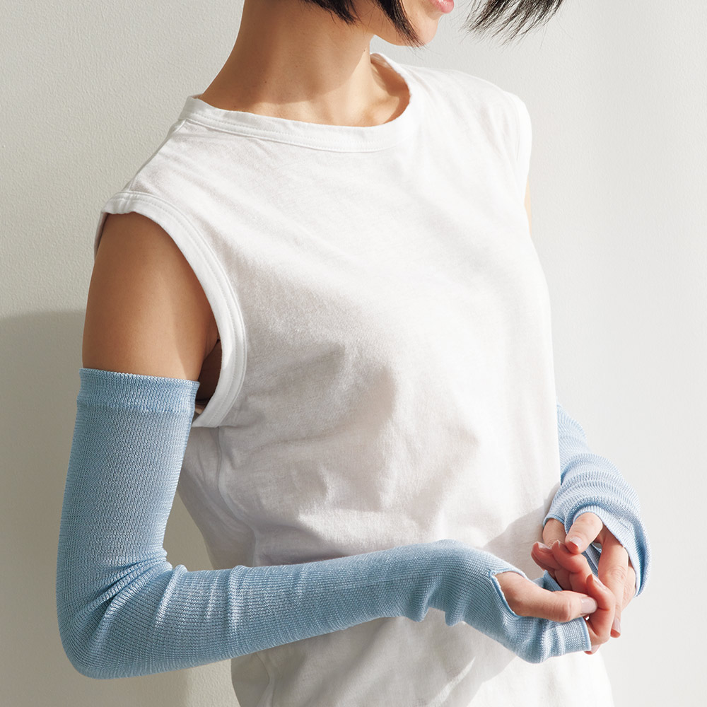 ノースリーブでも肩先から手の甲までカバーする超ロング丈。リブ編みだからずり落ちにくい。