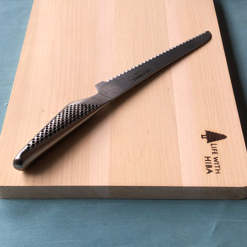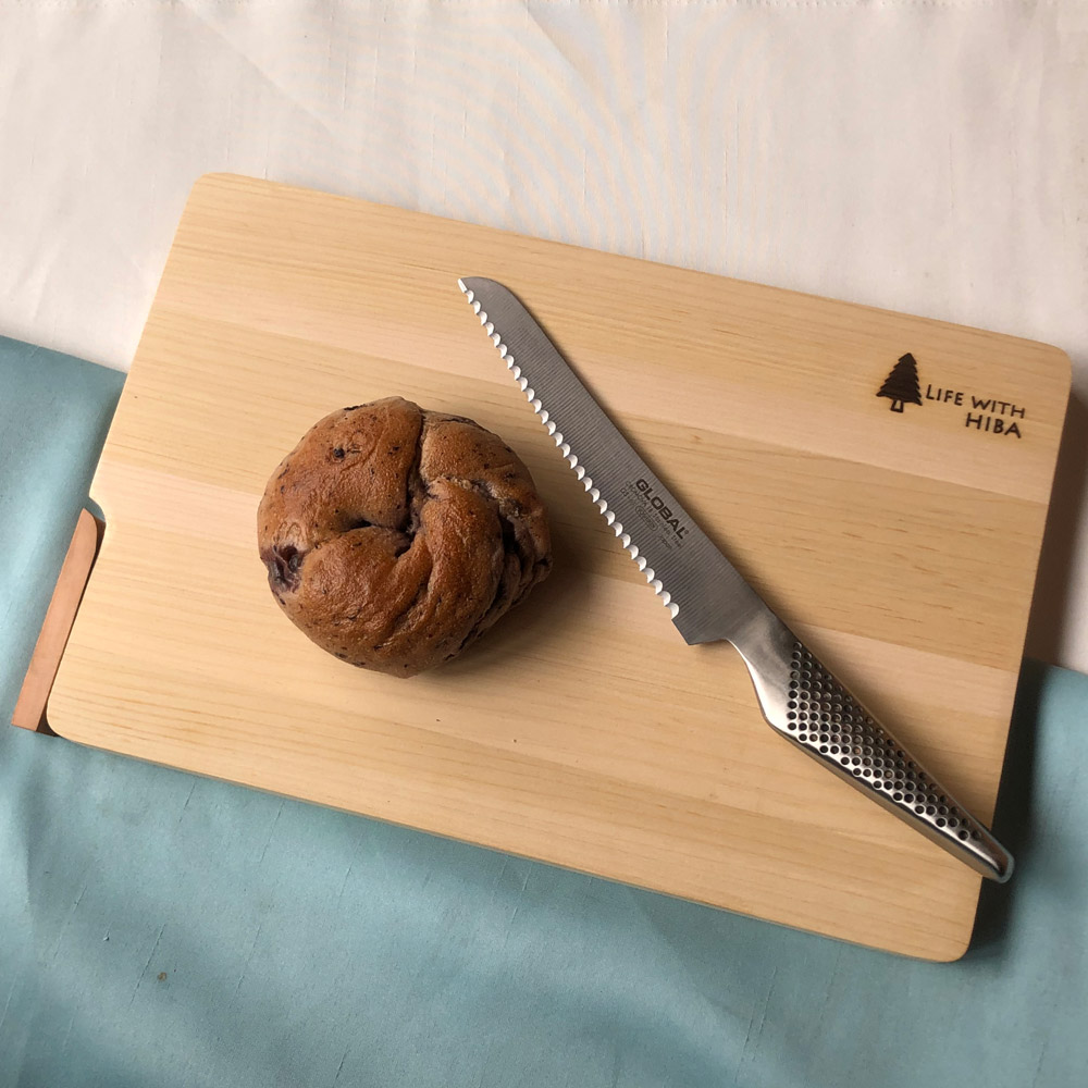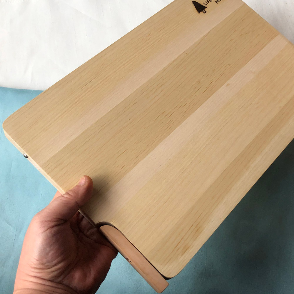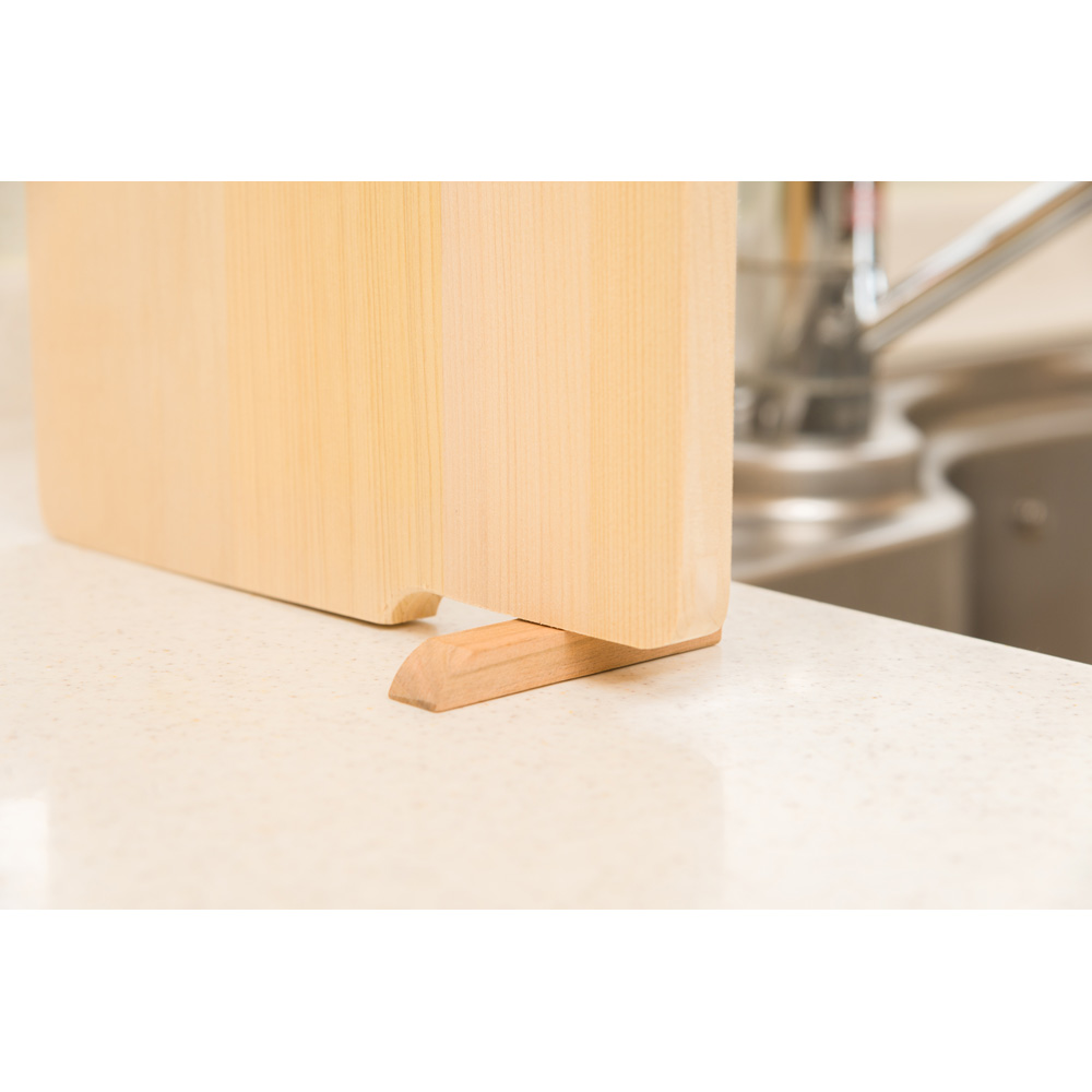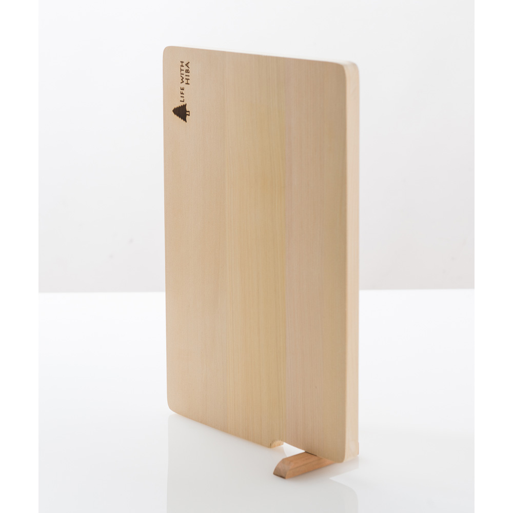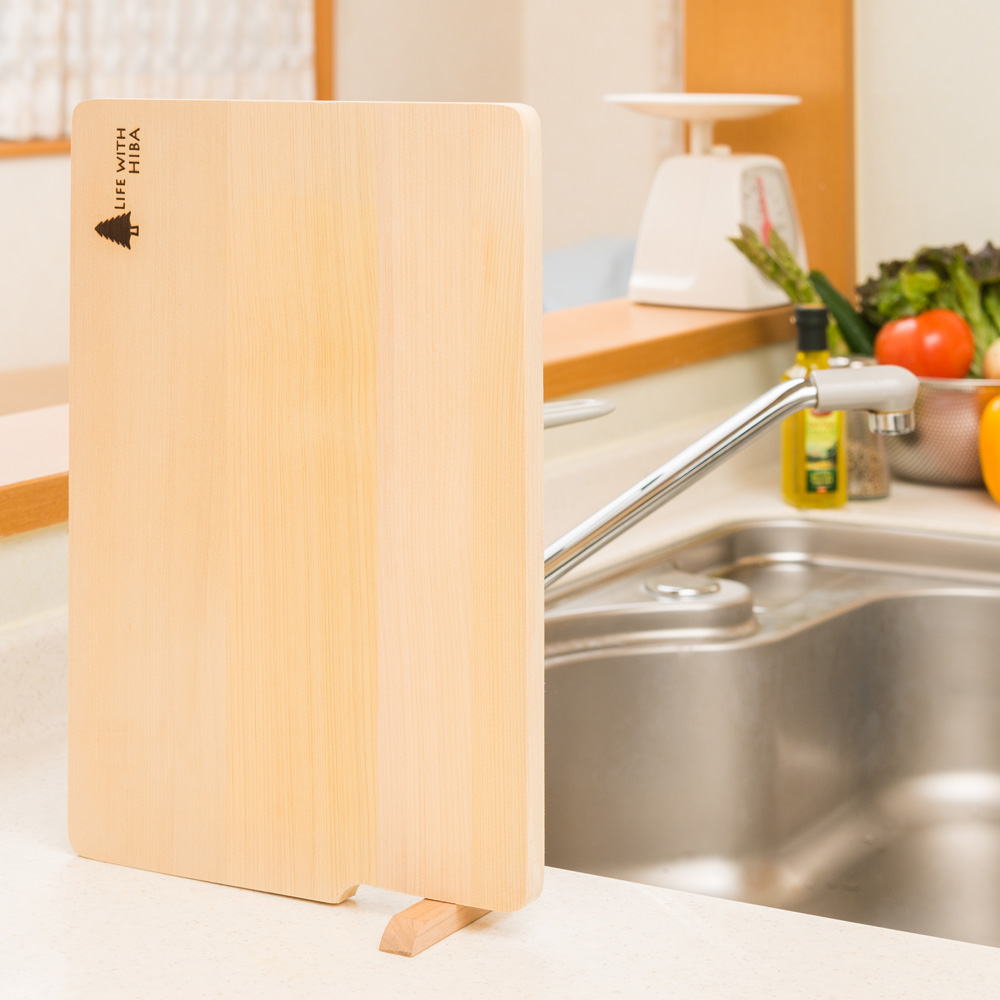 収納・乾燥に便利な自立スタンドが付いたヒバのまな板。天然の抗菌力でカビ・黒ズミを予防します。【他の木材より腐りにくいヒバ】青森ヒバの腐朽菌に対する耐久性は、ほかの木材よりも強く、腐りにくい。ヒノキ以上とされています。【青森ヒバの刻印いり】片面に「青森ひば」の焼印入りです。表裏の使い分けに便利です。【カビや細菌を寄せ付けません】青森ヒバにはヒノキチオール という、抗菌成分が豊富に含まれております。【柾目を使用】板目材のまな板は木口にひびが入ったり、そりあがることがあります。本品は厳選した柾目板を使用しております。●日本三大美林のひとつ青森ひば青森ヒバは秋田杉・木曽桧に並ぶ日本三大美林のひとつとして数えられています。青森ひばは、ヒノキ科の樹木で性質は桧に非常に近く、耐久性・耐水性・耐腐性では桧に勝る、実用性の高い材木と言えます。●青森ひばの不思議青森ヒバには、4つの大きな効果がある事が分かっています。抗菌効果・安息効果・防虫効果・消臭脱臭効果、この4大効果については、青森県工業試験場を始めとする研究機関で実証されており、この効果を利用した様々な商品が医療・農業・食品などの分野で開発されています。特に抗菌性については、抗菌スペクトルが非常に広く様々な細菌に対して効果があり、これを利用した医療用の消毒剤が開発されるなど利用分野の広がりを見せています。【カビや細菌を寄せ付けません】青森ヒバにはヒノキチオールという、抗菌成分が豊富に含まれております。