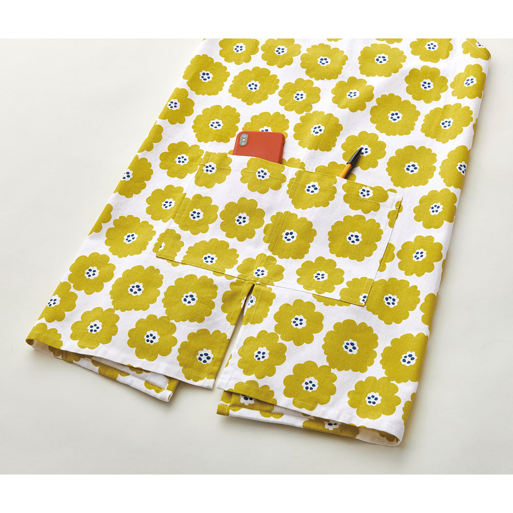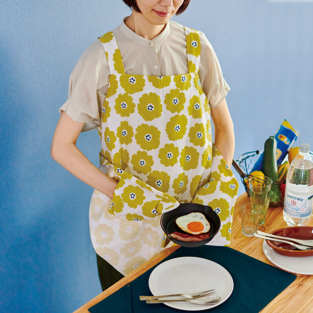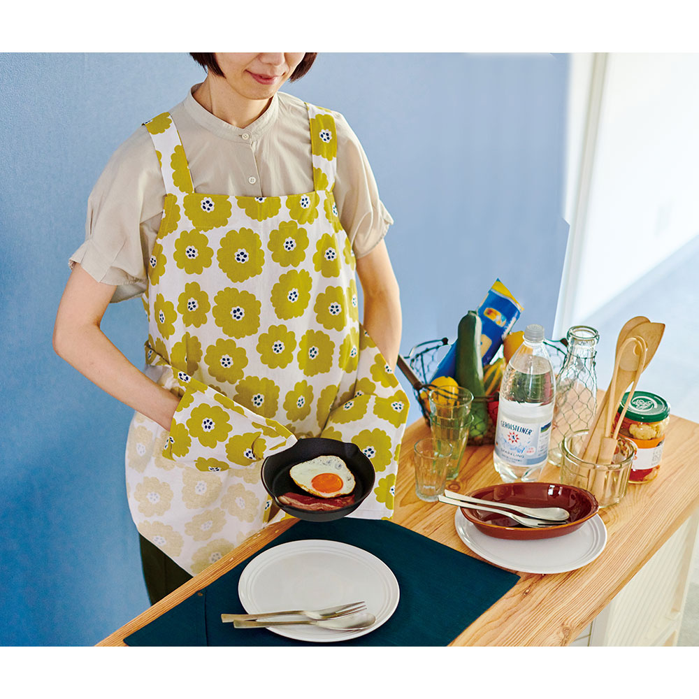 エプロンとミトンがいっしょになった便利アイテム!●背面の両裾に中綿を入れ、ミトンとして使用できるようにしました。熱いものをちょっと持ちたい時にササッと使えて便利です。●ヒモやボタンがなく、がさっと被って着るだけなので急いでいる時にさっと着られて便利です!●前センターのスリットがあるので足さばきを良くしてくれます。●真ん中に仕切りのある大き目の前ポケットがついているのでスマホなども入ります!●北欧調の甘すぎないデザインがオシャレです。