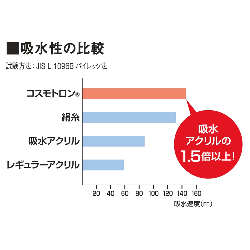 一般的なアクリルの1.5倍以上の吸水力。しかも素早く乾きます。