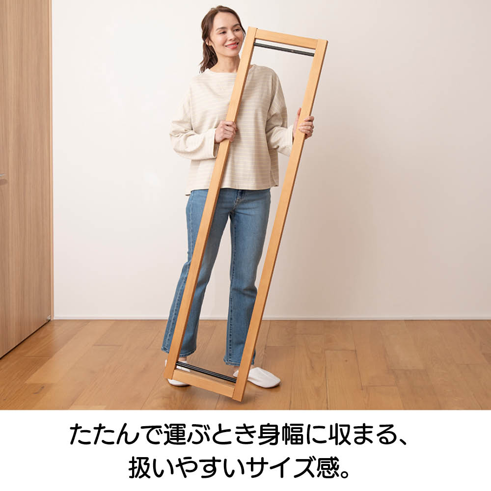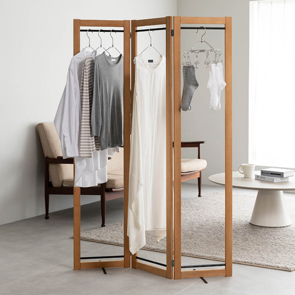 必要な時だけ開いて使えるパーテーション型の物干し。普段はたたんでコンパクトに収納可能です。天然木製で、いかにも物干しといった感じがなく、こだわりのインテリアとも好相性。ハンガーラックとして使うのもおすすめ!天然木の風合いが北欧ナチュラルな空間にマッチ! こだわりのインテリアの雰囲気を壊すことなく、おしゃれに部屋干しが可能です。ナチュラル色はカフェ風インテリアやブルックリンスタイル、和室までどんなインテリアにも合わせやすいのでおすすめ。物干しではなく、ハンガーラックとして使うのもおすすめ。シックなブラウンが、北欧モダンのインテリアになじんで素敵です。落ち着いたブラウン色は、ミッドセンチュリーなお部屋やアンティークなインテリアにも似合います。プレート状の転倒防止パーツが、底面と並行にセットされています。本体を設置したら、パーツを90度くるっと回して垂直に。倒れにくくなり安心です。たたむとスリムになるので省スペース収納が可能。壁と家具の間など、わずかな隙間にも収まります。1枚の幅は約35cm。たたんで運ぶ時に女性でも扱いやすいように、身幅に収まるサイズにこだわりました。空間に限りがある日本の住宅での設置しやすさも考慮したサイズ感です。