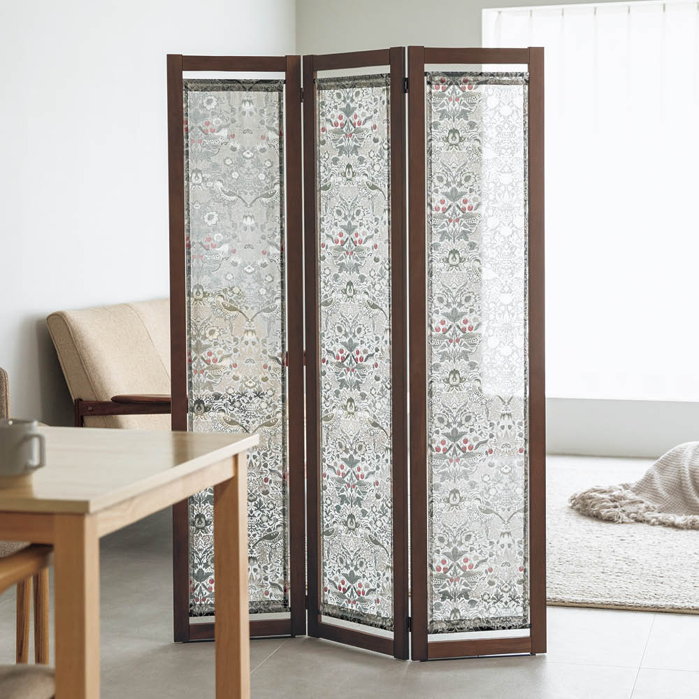 必要な時だけ開いて使えるパーテーション型の物干し。天然木製で、いかにも物干しといった感じがなく、こだわりのインテリアとも好相性。透け感のあるクロスはウィリアム・モリスの柄の中でも人気の高いいちご泥棒。普段はおしゃれな間仕切りとしても活躍します。ほどよく空間を区切れる透け感のあるパーテーションとして使用。ウイリアム・モリスのテキスタイルが素敵です。陽の光を通すので、お部屋が暗くなることもなく、軽やかな印象に。バーからクロスを取り外せば物干しに。天然木の風合いが、北欧ナチュラルな空間にマッチ。インテリアの雰囲気を壊すことなく、おしゃれに部屋干しが可能です。物干しではなく、ハンガーラックとして使うのも◎。2連タイプなら、1枚だけクロスを取り付けて、もう一方に洋服を掛けるとおしゃれです。ハンガーラックとして使いたいけど、掛けた洋服が丸見えなのはちょっと……という場合、1枚だけクロスを取り付けた側を、部屋の入口に向けて置くのがおすすめ。クロスがちょうどよい目隠しになってくれます。部屋の隅が定位置になっている、例えばゴルフバッグやスーツケース、健康器具など。インテリアとの調和が気になる物は、パーテーションを前に置いて、ソフトに目隠ししてみては?バーは穴に差し込むだけのシンプルな構造で、手で容易に付け外しが可能。そのバーをクロス両端の筒縫い部分に通して取り付けるだけなので簡単です。高さは身長160cmの女性でも扱いやすく、部屋に置いたときの圧迫感が少ない約153cm。ソファや椅子に座っている時は完全に姿が隠れ、立ち上がると頭が見えるように計算された、絶妙な高さが自慢です。1枚の幅は約35cm。たたんで運ぶ時に女性でも扱いやすいように、身幅に収まるサイズにこだわりました。空間に限りがある日本の住宅での設置しやすさも考慮したサイズ感です。パーテーションクロスには、「モダンデザイン」の父と称されるイギリスのテキスタイル・デザイナー、ウィリアム・モリスの「いちご泥棒」を使用。いちごをついばむツグミを描いたデザインはモリスの代名詞ともいわれ、今も世界中で愛されています。「Fabric by BEST OF MORRIS」は、モリスのテキスタイル生地を使った製品を通して、日々の暮らしをより豊かにするプロダクトブランドです。パーテーションクロスには、オパール加工で上品な透け感を施した、軽やかな素材感のテキスタイルを使用しています。陽の光を優しく通し、光の加減で柄の印象が繊細に変化して見えるのも魅力です。近づくと向こう側の様子がわかるくらいに透けて見え、離れるとほとんど見えなくなる……、この透け感は、お部屋の目隠しとしては絶妙!