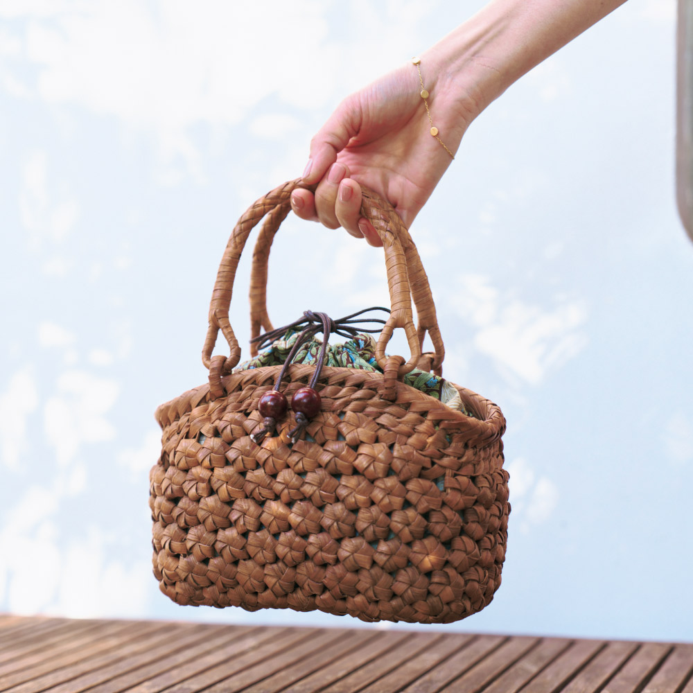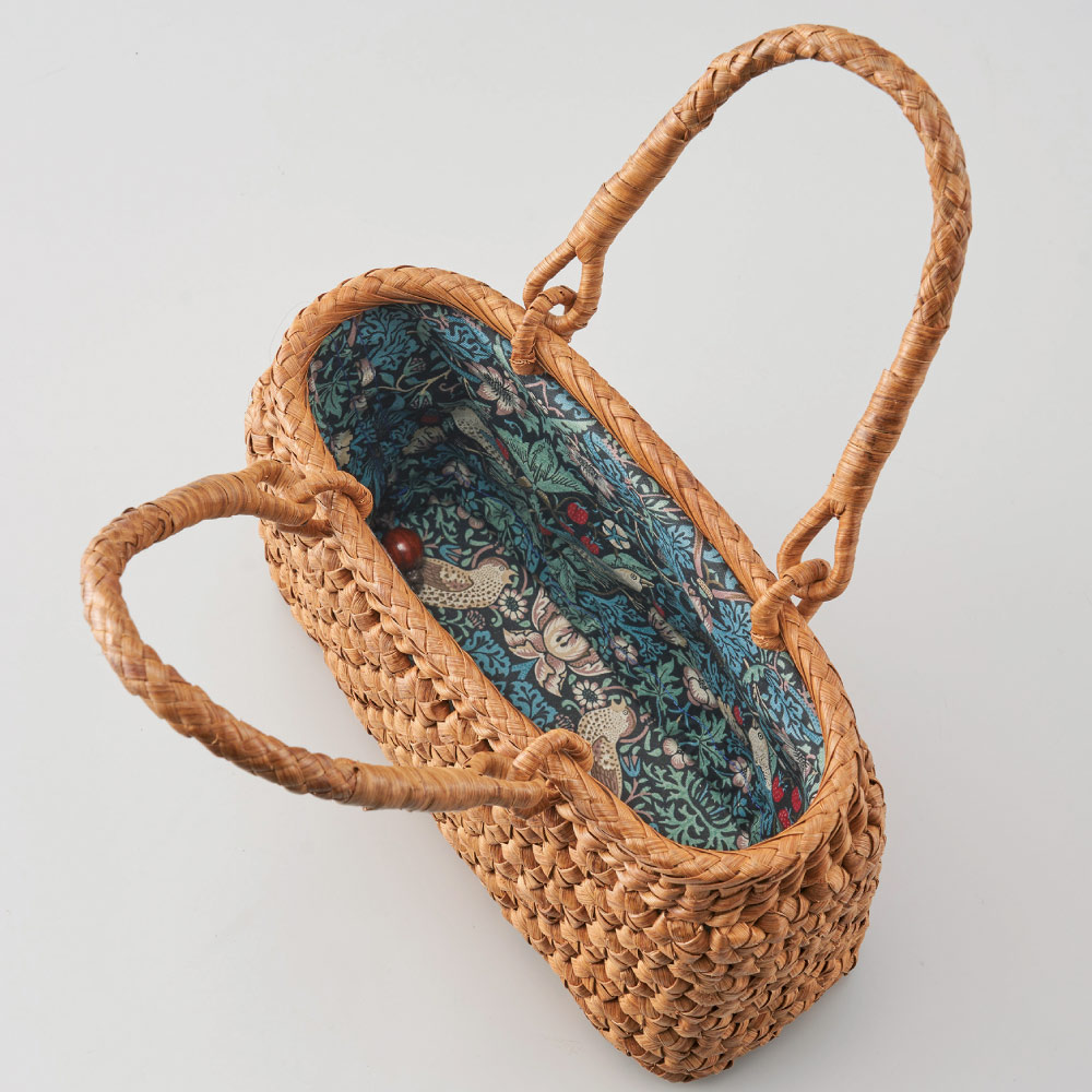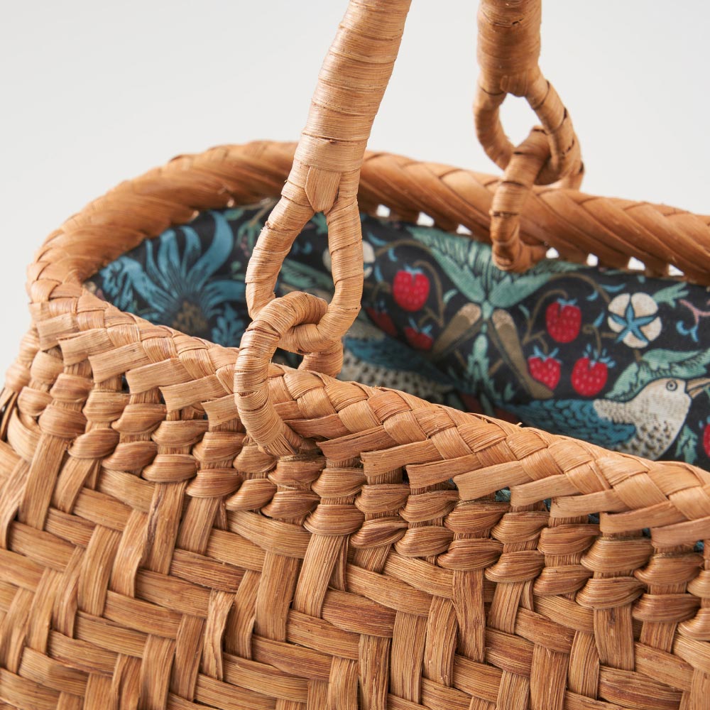 使うほど美しい風合いになる、山葡萄のかごバッグ。内布には「モリスモチーフ」を使い、和装にも洋装にも合うデザインに。耐久性と強度に優れた「山葡萄かごバッグ」山葡萄(やまぶどう)の蔓の皮を使って一つひとつ丁寧に編み上げたかごバッグは、かつて草履にも使用されていたほど高い耐久性と強度が特長です。普段使いはもちろん、重たい荷物にも耐えうるしっかりとした作りになっています。長く愛用できるので、大人の女性のライフスタイルにもぴったりのアイテムです。経年変化とともに深まる味わい山葡萄のかごバッグは、使い込むほどに艶やかさが増し、色や風合いが変化していきます。手にするうちに徐々に味わいが深まる経年変化は、このバッグならではの楽しみ。自分だけの特別なバッグへと成長していく様子も、多くの女性から支持されています。ウィリアム・モリスの人気柄で華やかな印象内布にはイギリスのデザイナー、ウィリアム・モリスの人気柄「いちご泥棒」と「ピンパーネル」を採用。バッグを開けたときに見える美しいテキスタイルが、日々の暮らしに彩りを添えます。内布の上質なデザインは、外側のナチュラルな風合いとのコントラストが魅力です。手仕事の温もりとモダンなデザインこのかごバッグは、一貫して職人による手作業で作られています。ひとつのバッグが完成するまでには約半月もの時間を要し、美しい六角形の編み目が見事に仕上がります。伝統の技が光る編み目と、内布の上品な柄が合わさり、まるでアート作品のような存在感。洋装にも和装にも合わせられるモダンでニュートラルな印象で、さまざまなシーンに活躍します。長く使うほど愛着が増す大人のための逸品年月とともに自分だけの風合いへと変化し、手放せない存在になる山葡萄のかごバッグ。日々のコーディネートで、使うたびに愛着が深まるのもこのバッグの魅力です。上質な素材と伝統技術が息づく、長く大切に使いたい逸品をぜひお試しください。