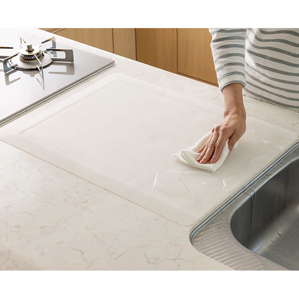 お気に入りのカウンターを守って、快適に。気が利いた仕様にリピ買い続出!\お気に入りのキッチンカウンターを綺麗に守りませんか?/愛用者続々!「キッチン用半透明保護マット」人工大理石やステンレスなど、傷つきやすい素材のキッチンカウンターを保護する半透明マット。でも、ただのマットではないんです!普段のお料理を快適にするための工夫が色々あります♪【オススメポイント1:吸盤付きでズレにくい!】「野菜のスライスや大根おろし、力を入れないといけないけど、滑って危険!」なことってありませんか?この保護マットはシリコン製かつ、裏面に吸盤がついているので、しっかり吸着してズレにくい仕様なので、大根おろし等も安定してお使いいただけます!【オススメポイント2:カウンターが水びだしになりにくい様工夫した設計!】「トマトや、水分を多く含んだ野菜を切ると、その水分がまな板からこぼれて、カウンターがびちょびちょ…さらにその水分が床にこぼれて床もびちょびちょ…」なんて経験ありませんか?このマットは表側に3辺にわずかな立ち上がりがあるため、切った野菜の水分等が外へ流れ出すのを防いでくれます。【オススメポイント3:熱いものも直置きOK!耐熱180度】180度までの耐熱仕様なので、オーブンの天板や鍋も直接おけます!【他にも色んな使い方が…!】水切りラックの下におけば、キッチンカウンターが水滴で濡れるのを防いでくれたり、パンをこねたり、ピザを作ったり、クッキングマットとしてお使いになるのもオススメです♪