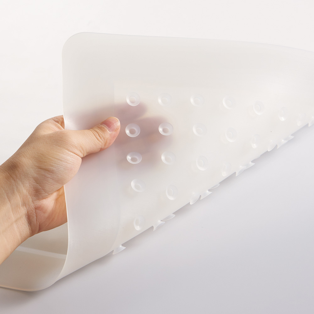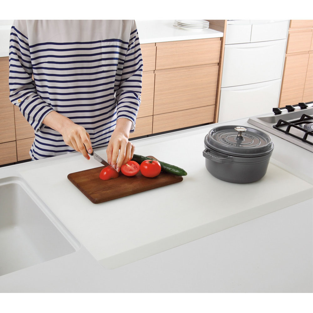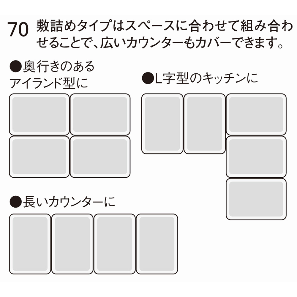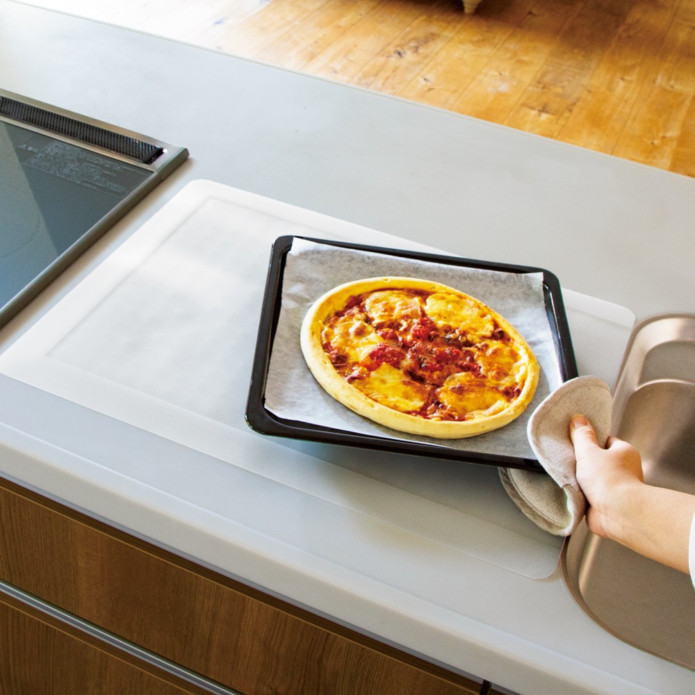 お気に入りのカウンターを守って、快適に。気が利いた仕様にリピ買い続出!\お気に入りのキッチンカウンターを綺麗に守りませんか?/愛用者続々!「キッチン用半透明保護マット」人工大理石やステンレスなど、傷つきやすい素材のキッチンカウンターを保護する半透明マット。でも、ただのマットではないんです!普段のお料理を快適にするための工夫が色々あります♪【オススメポイント1:吸盤付きでズレにくい!】「野菜のスライスや大根おろし、力を入れないといけないけど、滑って危険!」なことってありませんか?この保護マットはシリコン製かつ、裏面に吸盤がついているので、しっかり吸着してズレにくい仕様なので、大根おろし等も安定してお使いいただけます!【オススメポイント2:カウンターが水びだしになりにくい様工夫した設計!】「トマトや、水分を多く含んだ野菜を切ると、その水分がまな板からこぼれて、カウンターがびちょびちょ…さらにその水分が床にこぼれて床もびちょびちょ…」なんて経験ありませんか?このマットは表側に3辺にわずかな立ち上がりがあるため、切った野菜の水分等が外へ流れ出すのを防いでくれます。【オススメポイント3:熱いものも直置きOK!耐熱180度】180度までの耐熱仕様なので、オーブンの天板や鍋も直接おけます!【他にも色んな使い方が…!】水切りラックの下におけば、キッチンカウンターが水滴で濡れるのを防いでくれたり、パンをこねたり、ピザを作ったり、クッキングマットとしてお使いになるのもオススメです♪