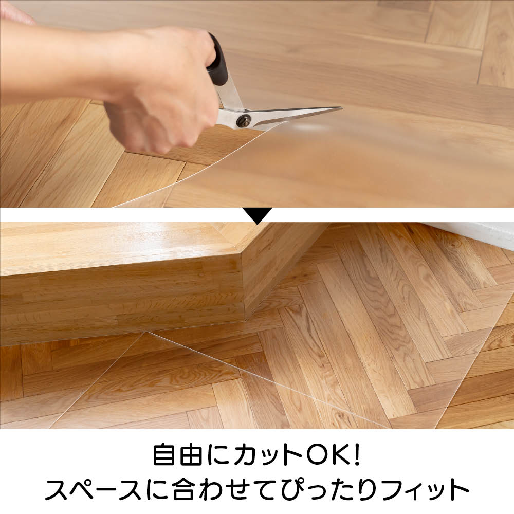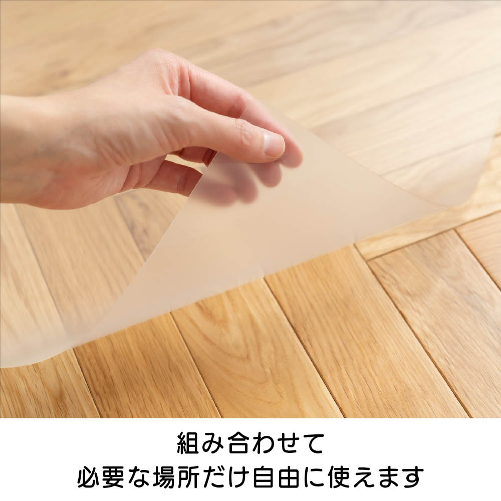 滑りやすいフローリングにサッと敷くだけ!透明だからインテリアを損なわず、敷くだけで床を守れる、ペットの足への負担軽減をめざしてつくった高機能マットです。クラレプラスチックス開発の特殊素材「アーネストン(R)」採用で、防滑・衝撃吸収・耐久性に優れ、汚れてもサッと拭くだけ。水洗いやカットもOKで、使い勝手の良さも魅力です。敷いても気づかないほど自然。触れてわかる、上質な透明感とやわらかさ美しいフローリングの質感を損なわない高い透明度とクラレプラスチックス開発の素材ならではのしなやかさが魅力。サッと拭けて、丸洗いもOK!毎日清潔&長く使える安心感水分や汚れがしみ込まないから、ペットのトイレ下などに敷いてもサッと拭くだけで清潔に。組み合わせて必要な場所だけ自由に使えますペットの動線や生活シーンに合わせてレイアウト自在。わずか約1mm&角はゆるやかなR形状に。つまずきにくく、安全性も◎試作段階で"めくれやすさ"に着目し、角を直角からゆるやかなR形状に改良。引っかかりにくく、つまずきも軽減。扉の開閉や引き出しにも干渉しにくいです。幅広い分野で活躍!クラレプラスチックス開発の高機能素材「アーネストン(R)」スポーツや医療、生活用品から車のダッシュボードの滑り止めまでーーー多彩な分野で採用されるクラレプラスチックスの高機能樹脂「アーネストン(R)」を使用。防滑・衝撃吸収・耐久性に優れ、信頼の品質を支えています。落とした鉄球の跳ね上がりも軽減する衝撃吸収力!クラレプラスチックスの高機能素材「アーネストン(R)」は、落とした鉄球のバウンド距離を軽減させる衝撃吸収力。足腰への負担が少ないことを目指して開発しました。驚きの防滑性。こんなに傾けてもグラスをキープ!シートを敷いたテーブルを傾けても、グラスが滑らずしっかりキープ。高い防滑性で、歩いても滑りにくい仕様です。ピタッと吸着、でも床を傷つけないやさしい安心設計裏面には高い吸着力を持つ特殊素材を採用。垂直な壁面にくっつけても落ちにくいグリップ力で、床にもズレずにしっかり密着します。接着剤などの成分は不使用だからフローリングを傷つけず、安心して使えます。※使用前に裏面の保護フィルムをはがしてください。「ワンちゃんの健康をサポートするために床材にもこだわりましょう」「ペットにとって、滑りやすく硬い床は足腰への負担となり、転倒や関節への衝撃につながることがあります。特に、骨の発達段階にある仔犬や、足腰が弱くなるシニア期の犬にとっては注意が必要です。実際、行動が制限されることで筋力が低下してしまうケースも少なくありません。このマットは非常に滑りにくく、体勢を安定させやすいのが特長です。私自身、使用してみて、愛犬がしっかり踏ん張れ、安心感がありました。また、水分が下に染み込まず、丸洗いもできるので、これまで使っていたマットに比べて衛生的に長く使える点も嬉しいポイントです。ワンちゃんの健康をサポートするためにも床材にこだわることは重要です。体勢を安定させやすくするためにも、滑りにくい床材を選びましょう。」