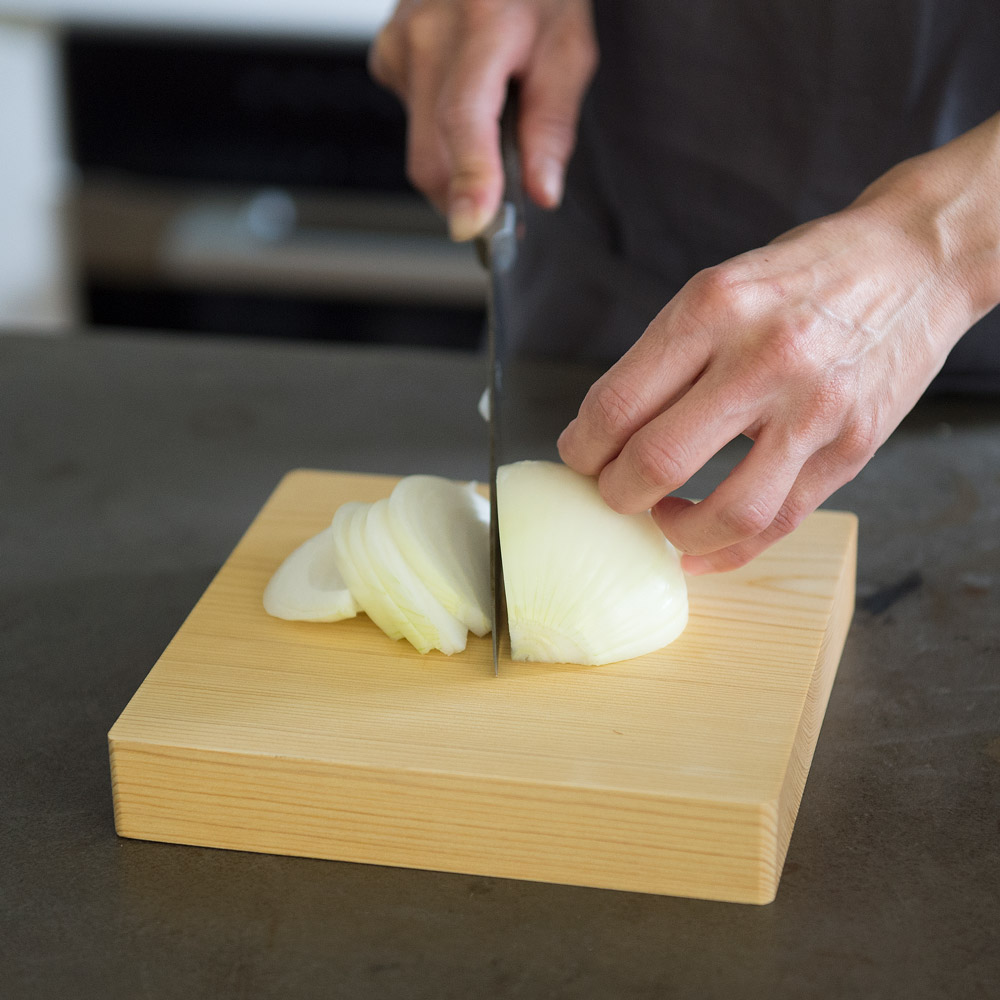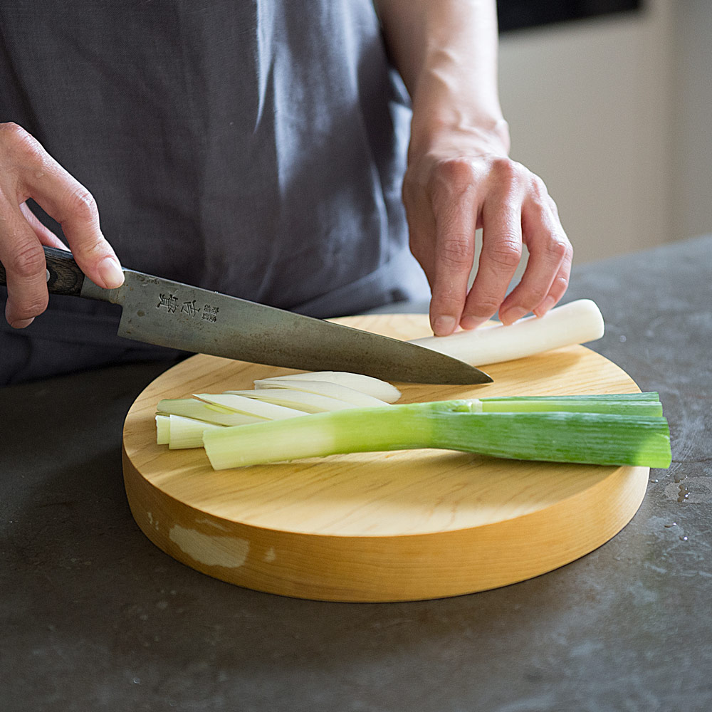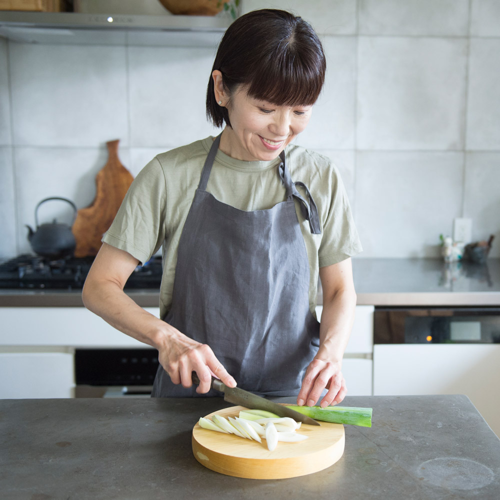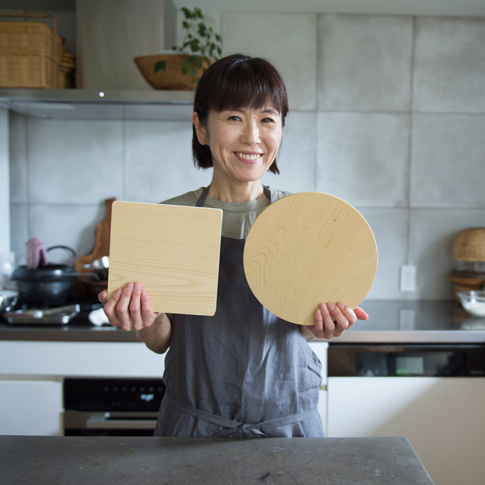 料理家ワタナベマキさんも愛用。貴重な青森ヒバを使い、厚み約3cmの一枚板で仕上げた贅沢なまな板です。刃あたりが良く、安定感があり、包丁仕事がとても快適に。ヒバは天然の抗菌性や消臭性を持ち、カビや黒ずみが発生しにくいのも特長。あたりがやさしく、包丁仕事が楽しくなるまな板。「このまな板は本当に使いやすいです。刃あたりがやさしくトントンとリズミカルに切れて、コンパクトだから小回りが効いてサッと洗えるし、包丁仕事が楽しくなりますね。しっかりとした厚みのおかげか、手も疲れにくいです。」丸型は小さく見えても広く使えます。「見た目はコンパクトなのに意外と広く使える丸型。大きな野菜も、細かな薬味も、このまな板ひとつで対応できますよ。」取り回しやすいコンパクトさと、贅沢な厚みがポイント。「もともとコンパクトなまな板が扱いやすくて好きなのですが、ここまでの厚みのものはなかなか見つかりません。薄いまな板は安定しにくかったり、使ううちに反ってしまうことも。このまな板はしっかり安定感があって、手にもやさしい使い心地です。」気軽に使える小さなまな板が、料理を身近にしてくれます。「料理は準備や後片付けが億劫になりがちですよね。その点サッと手に取れる小さめのまな板は、気軽に使えてお手入れもラク。料理のハードルを下げてくれる気がします。」取り回しやすく、調理作業がはかどります。「コンパクトで厚みのわりに軽量なので、カットした食材をそのまま鍋やボウルに移すのにも便利です。調理作業がスムーズ&スピーディに。」普段はたわしでゴシゴシ水洗いがおすすめ。「使用後はたわしでゴシゴシ水洗い。お湯を使うと魚や肉のたんぱく質が固まって落ちにくくなるので、水がおすすめです。食器用洗剤は木の油分を落としてしまうので、ニオイや汚れが気になる時にだけ控えめに使っています。」使用後はしっかり乾燥させてカビや黒ずみを予防。「洗ったまな板は乾いた布で拭き上げ、よく乾燥させます。木目が横になるように立てておくと下部に水が溜まることなく、横から水分が抜けてくれます。しっかり乾かせばカビも生えにくく、長く愛用できますよ。」使い勝手の良い形状もヒバの香りも、とても気に入っています。「どちらも取り回しやすく使いやすい形と大きさ。良質な国産青森ヒバのすがすがしい香りにも癒されます。」貴重な青森ヒバの一枚板で仕立てたまな板。耐久性に優れ、天然の抗菌・消臭性を持つ貴重な青森ヒバを、約3cm厚の一枚板で仕上げた贅沢なまな板です。日本の職人技が光る、ハンドメイドのまな板。木材の性質を知り尽くした木工職人が、一枚ずつ丹精込めて仕上げています。
