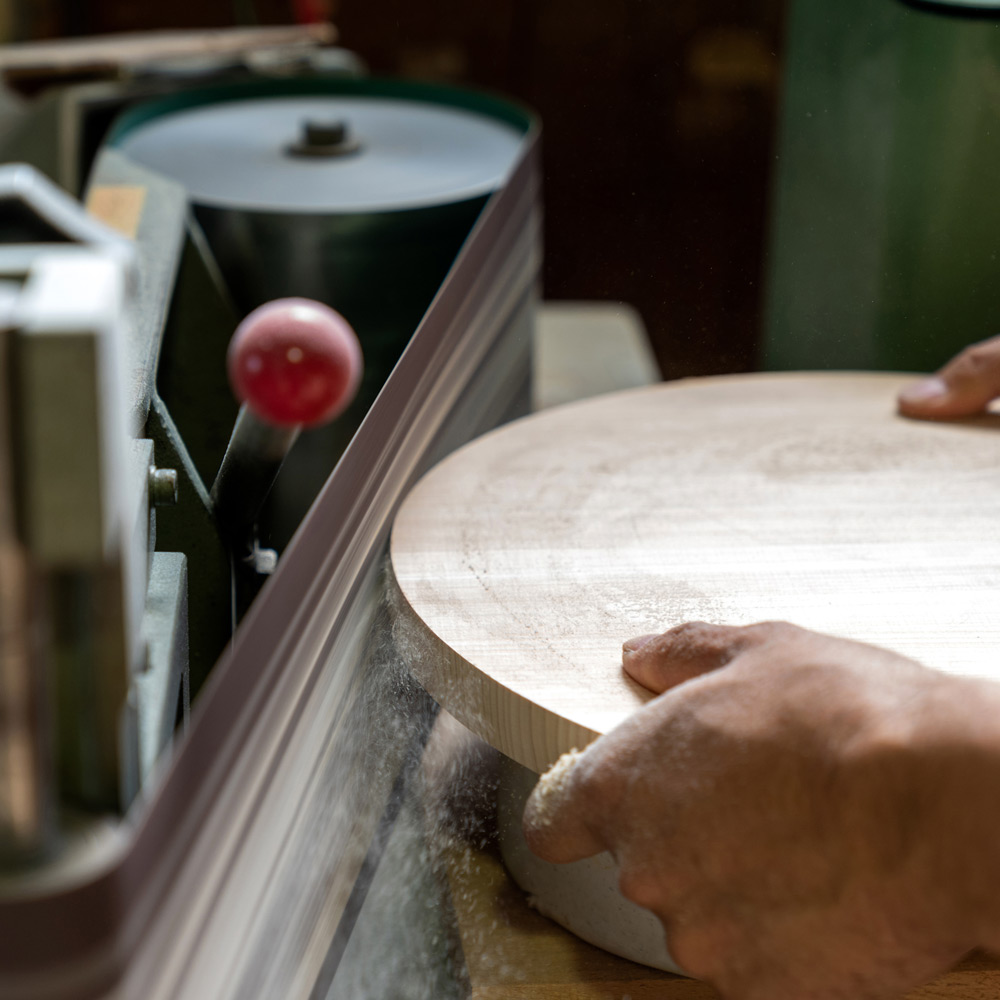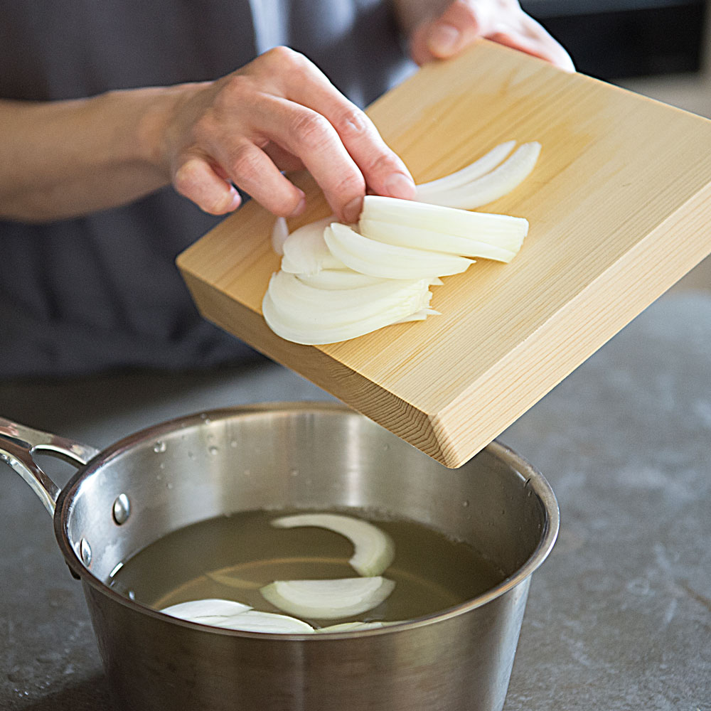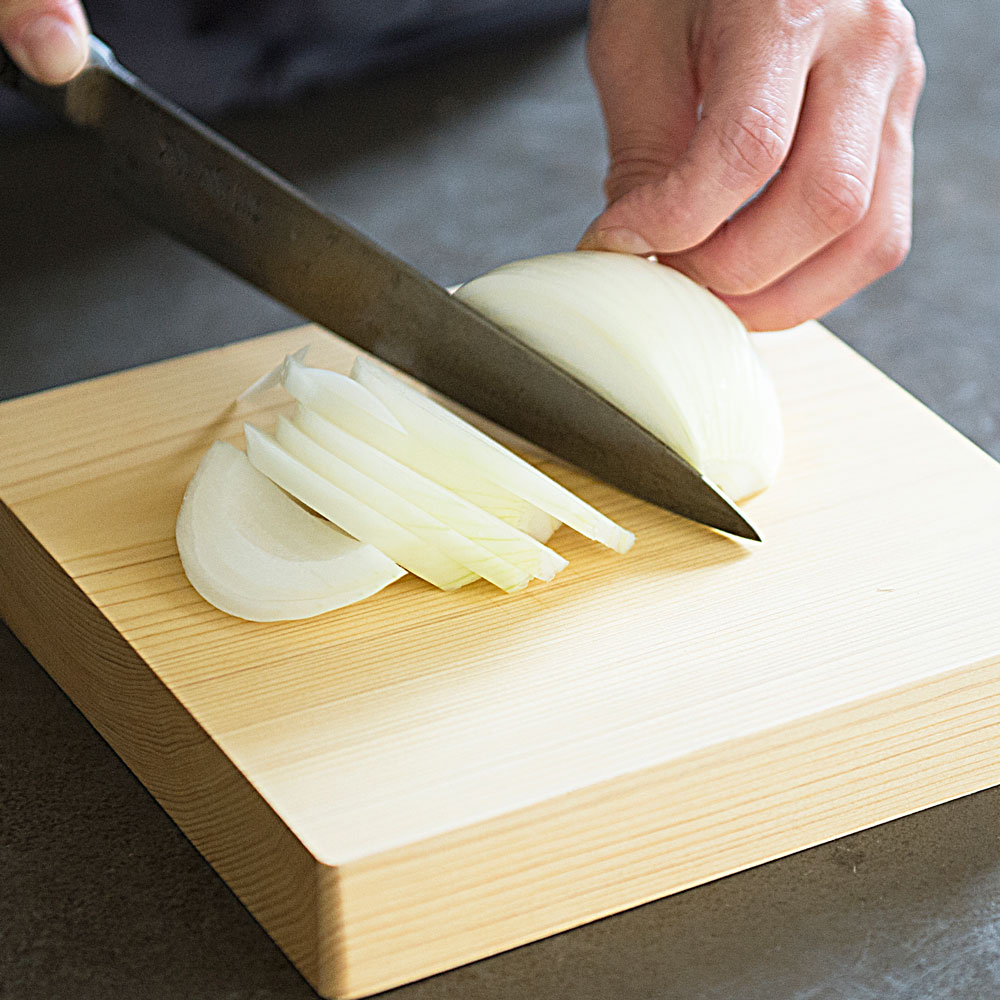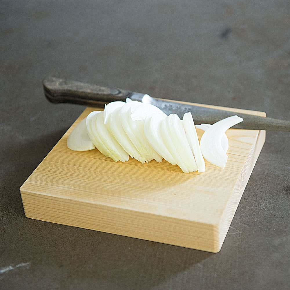 料理家ワタナベマキさんも愛用。貴重な青森ヒバを使い、厚み約3cmの一枚板で仕上げた贅沢なまな板です。刃あたりが良く、安定感があり、包丁仕事がとても快適に。ヒバは天然の抗菌性や消臭性を持ち、カビや黒ずみが発生しにくいのも特長。あたりがやさしく、包丁仕事が楽しくなるまな板。「このまな板は本当に使いやすいです。刃あたりがやさしくトントンとリズミカルに切れて、コンパクトだから小回りが効いてサッと洗えるし、包丁仕事が楽しくなりますね。しっかりとした厚みのおかげか、手も疲れにくいです。」丸型は小さく見えても広く使えます。「見た目はコンパクトなのに意外と広く使える丸型。大きな野菜も、細かな薬味も、このまな板ひとつで対応できますよ。」取り回しやすいコンパクトさと、贅沢な厚みがポイント。「もともとコンパクトなまな板が扱いやすくて好きなのですが、ここまでの厚みのものはなかなか見つかりません。薄いまな板は安定しにくかったり、使ううちに反ってしまうことも。このまな板はしっかり安定感があって、手にもやさしい使い心地です。」気軽に使える小さなまな板が、料理を身近にしてくれます。「料理は準備や後片付けが億劫になりがちですよね。その点サッと手に取れる小さめのまな板は、気軽に使えてお手入れもラク。料理のハードルを下げてくれる気がします。」取り回しやすく、調理作業がはかどります。「コンパクトで厚みのわりに軽量なので、カットした食材をそのまま鍋やボウルに移すのにも便利です。調理作業がスムーズ&スピーディに。」普段はたわしでゴシゴシ水洗いがおすすめ。「使用後はたわしでゴシゴシ水洗い。お湯を使うと魚や肉のたんぱく質が固まって落ちにくくなるので、水がおすすめです。食器用洗剤は木の油分を落としてしまうので、ニオイや汚れが気になる時にだけ控えめに使っています。」使用後はしっかり乾燥させてカビや黒ずみを予防。「洗ったまな板は乾いた布で拭き上げ、よく乾燥させます。木目が横になるように立てておくと下部に水が溜まることなく、横から水分が抜けてくれます。しっかり乾かせばカビも生えにくく、長く愛用できますよ。」使い勝手の良い形状もヒバの香りも、とても気に入っています。「どちらも取り回しやすく使いやすい形と大きさ。良質な国産青森ヒバのすがすがしい香りにも癒されます。」貴重な青森ヒバの一枚板で仕立てたまな板。耐久性に優れ、天然の抗菌・消臭性を持つ貴重な青森ヒバを、約3cm厚の一枚板で仕上げた贅沢なまな板です。日本の職人技が光る、ハンドメイドのまな板。木材の性質を知り尽くした木工職人が、一枚ずつ丹精込めて仕上げています。