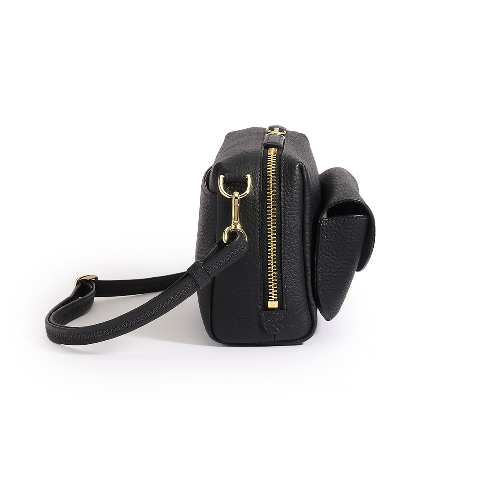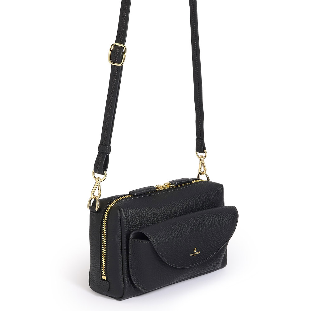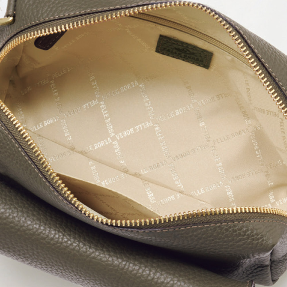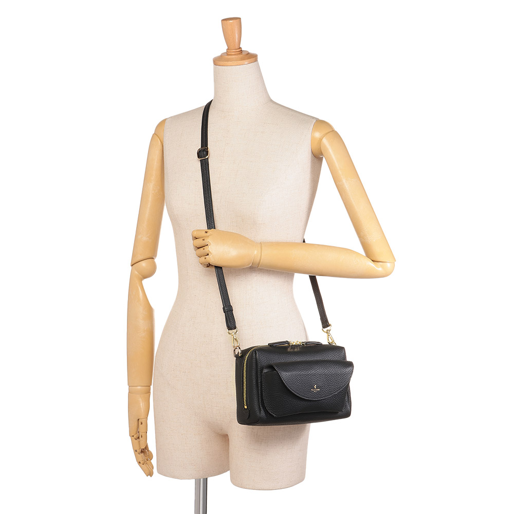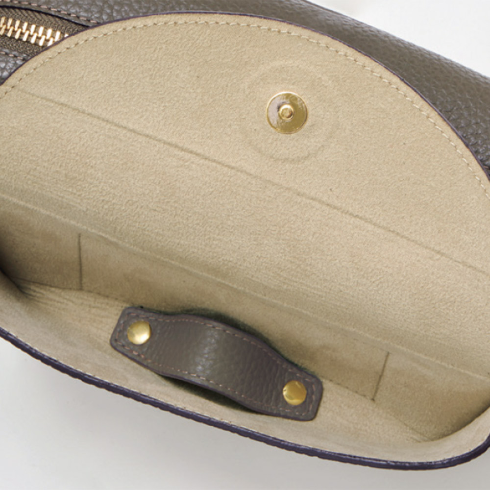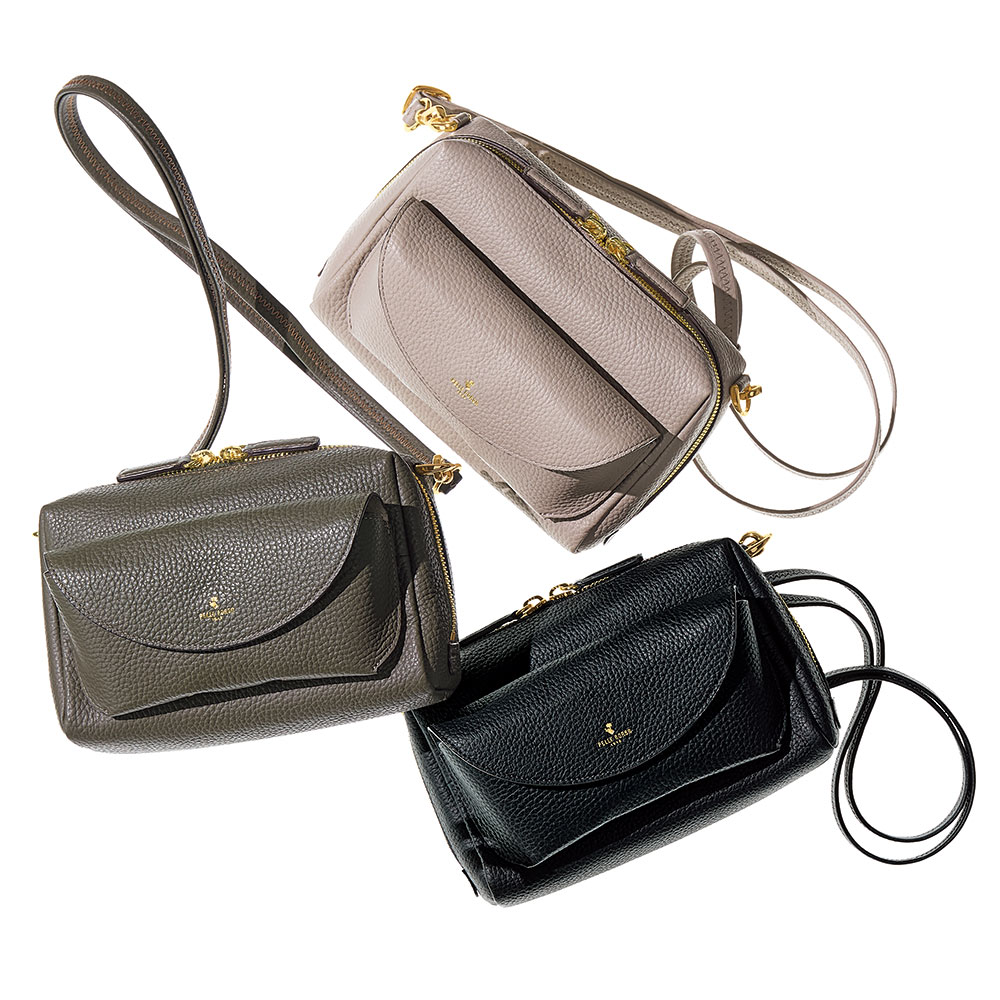 きめ細やかな和心、匠の知恵が使い心地を決める日本の繊細さを宿した、美しく機能するバッグ美しくタフなオリジナルレザーのモダン・ラグジュアリーなバッグ独自開発した素材や卓越したデザイン力が光る、大阪発「PELLEBORSA」。なかでも、ハイブリッドな鞣しと空打ちのプロセスに拘った、日本製シュリンク型押しレザーはブランドを代表するマテリアル。豊かな風合いと耐久性を兼ね備えた人気素材です。この革の美しさをミニマルなデザインで打ち出した“レネット”シリーズをご紹介します。ボクシーなショルダーバッグは、前胴にアイウェアポケットが付いたユニークなデザイン。開き口のファスナーは両横まで大きく開き、収納力は期待以上。≫ POINT外ポケットの内側はアイウェアを傷つけない微起毛素材。ノーズパッドを支えるレザーパーツをはずせば、小物収納も。