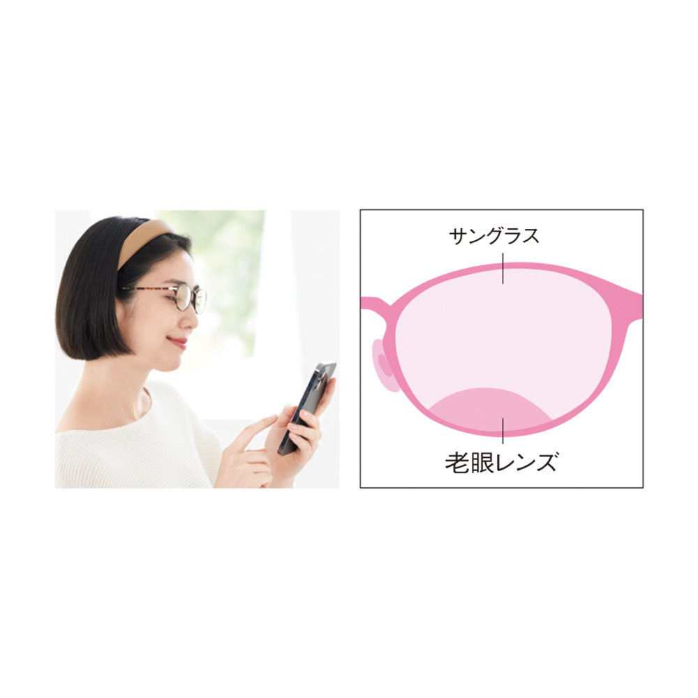 一日中かけていられるクリアサングラス。サングラスは薄い色がいい!?目の健康のためには日頃から紫外線カットのために「サングラスをかける習慣」も大切です。しかし、色の濃いサングラスは、目に入ってくる光が少なくなるので、逆に瞳孔が開いて紫外線を呼び込みやすくなることもあるそう。透明なサングラスなら、季節や場所など使うシーンが限定されないので、生活に取り入れやすいんです。“サングラス”と“老眼鏡”を兼ね備えた「フィール プラス」「フィール プラス」は、レンズの下部の一部が“老眼レンズ”の仕様。買い物中に値札を見たり、カフェでメニューを見るときなど、視線を下側に落とすだけで手元が見やすくなります。これなら、お出かけの際に老眼鏡を持ち運ぶ必要がなくなって便利!度数は+1.00〜+2.00の3段階から選べます。