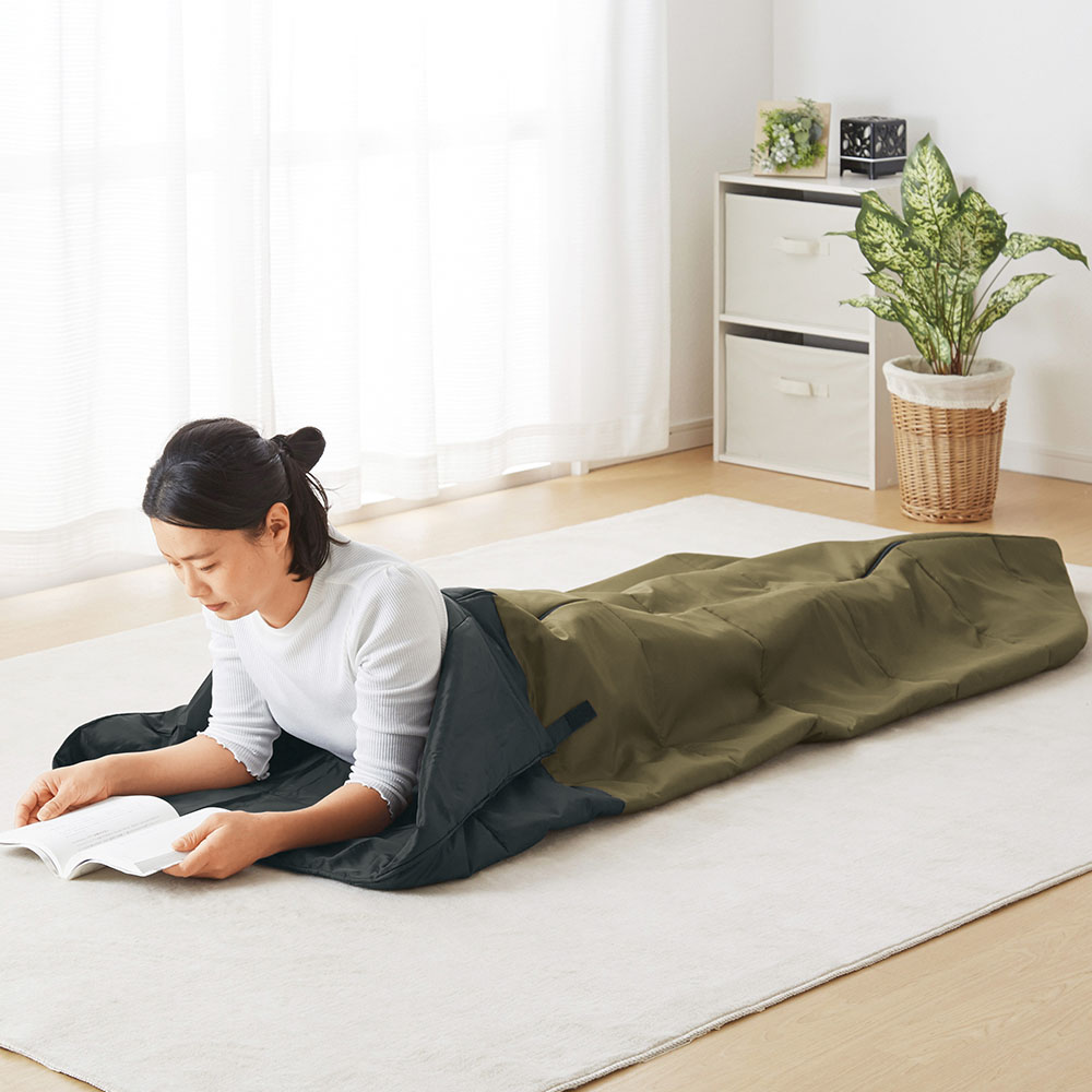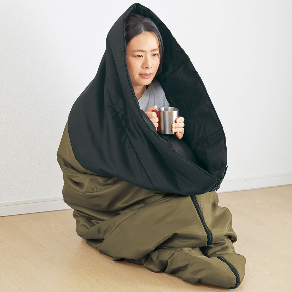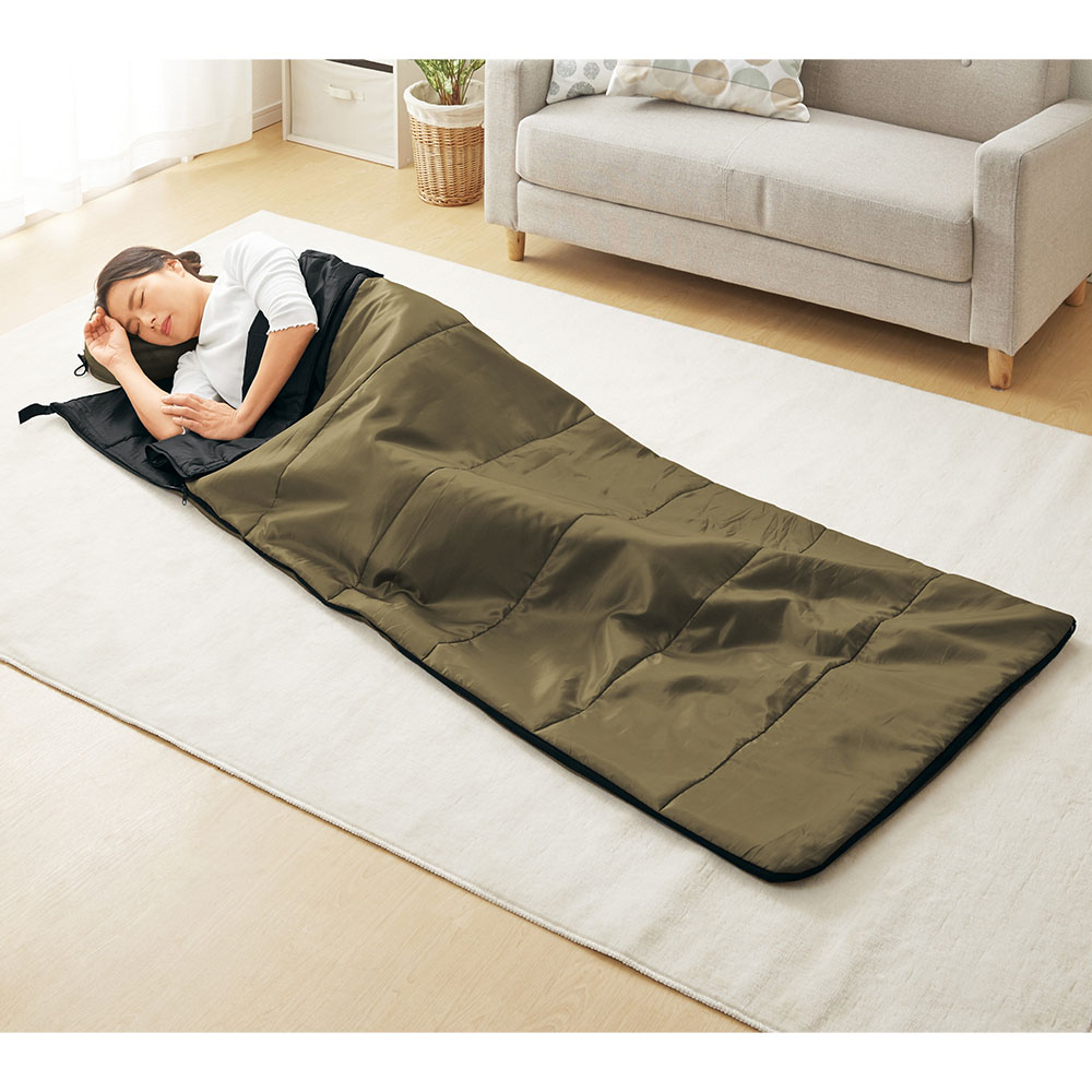 薄くて軽く、足元ゆったりの筒型の寝袋です。収納袋に入れて小さくコンパクトになり、持ち運びも便利です。広げて使えば軽くて暖かい掛け布団に。キャンプや車中泊、防災の備えに。