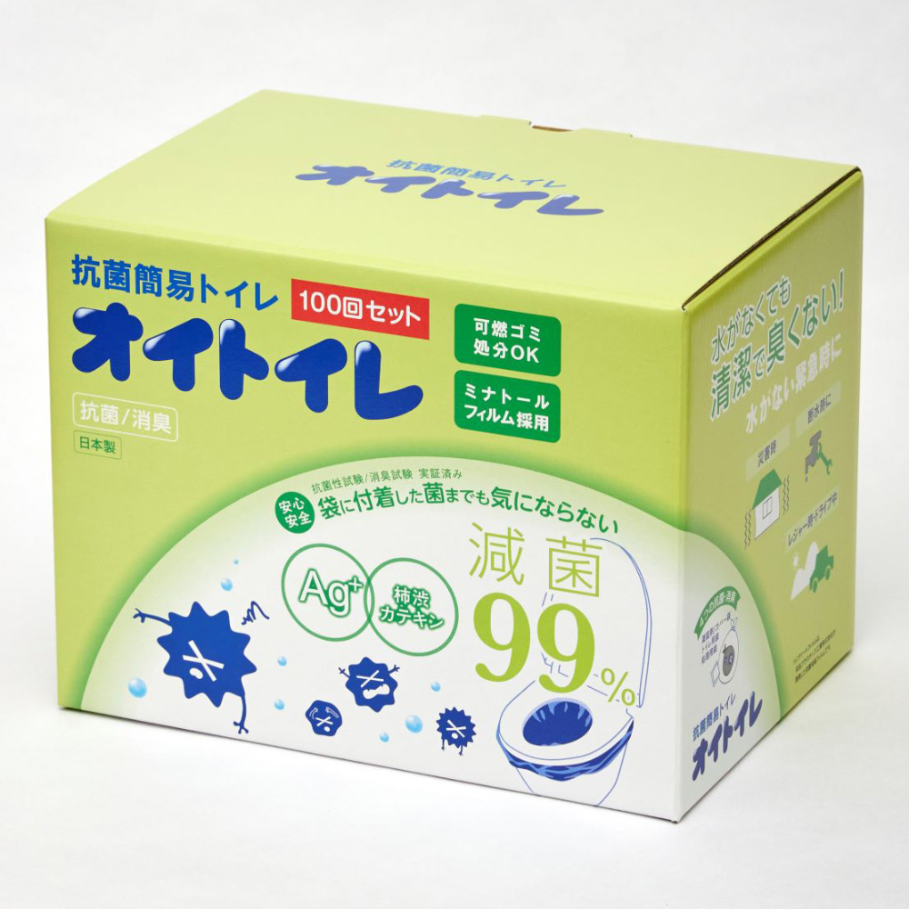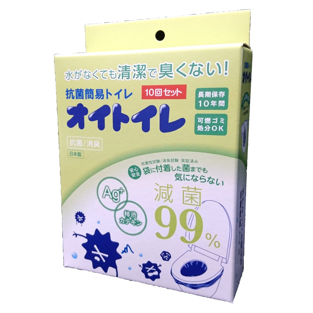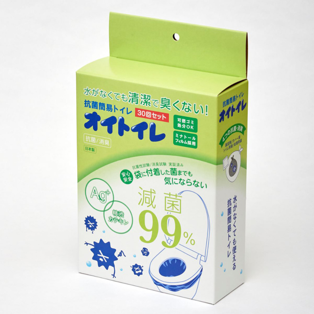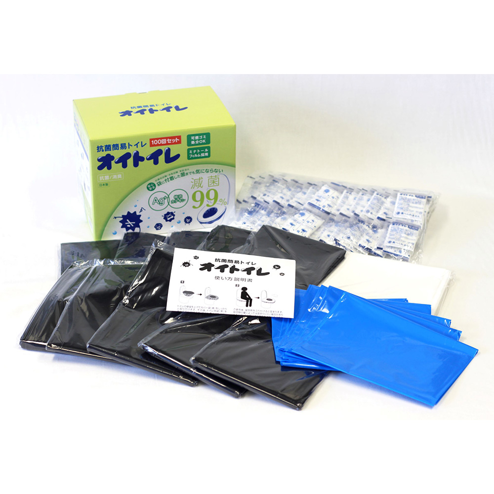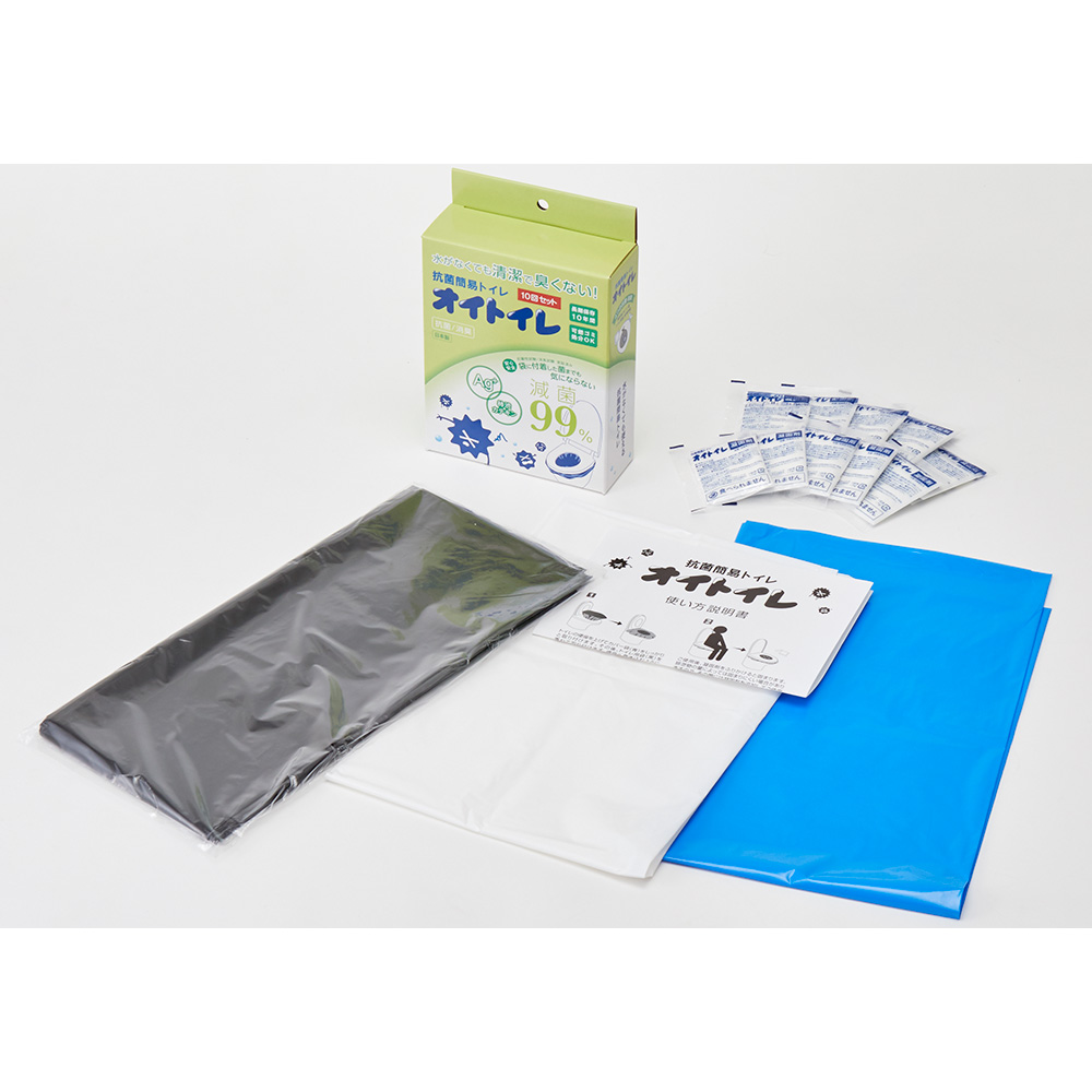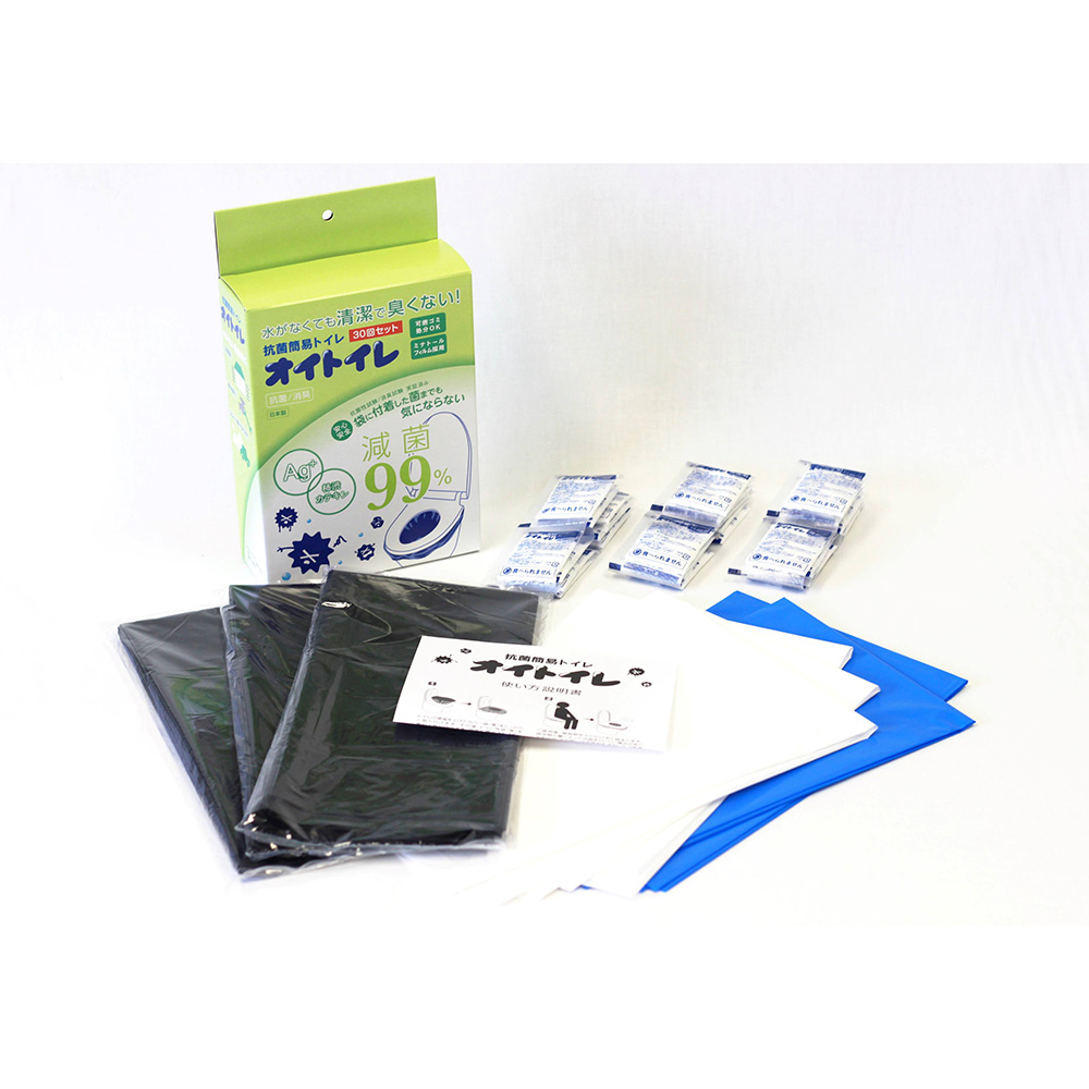 必要に合わせた備えで置いてて安心、抗菌・消臭トイレ。水がなくても清潔で臭くない!水が使えない状況は、突然訪れます。災害時、断水時、ドライブ中の渋滞、レジャー先、突然トイレに行きたくなった時にオイトイレを手元に置いておけば安心!抗菌簡易オイトイレは袋を取りつけて排泄物を凝固剤で瞬間的に固めて、使用した袋を取り出し捨てるだけの仕様です。また、燃焼時に有害ガスが発生しないため、可燃ごみで処分可能です。【使い方】(1)トイレのカバーの便座を上げてカバー袋(青)をしっかりと取り付けます。(2)さらにカバー袋を被せるようにトイレ袋(黒)を取りつけします。その後、便座を下ろします。(3)ご使用後、凝固剤をふりかけると固まります。(4)トイレ用袋を取り出し、袋口をしっかりと結びます。