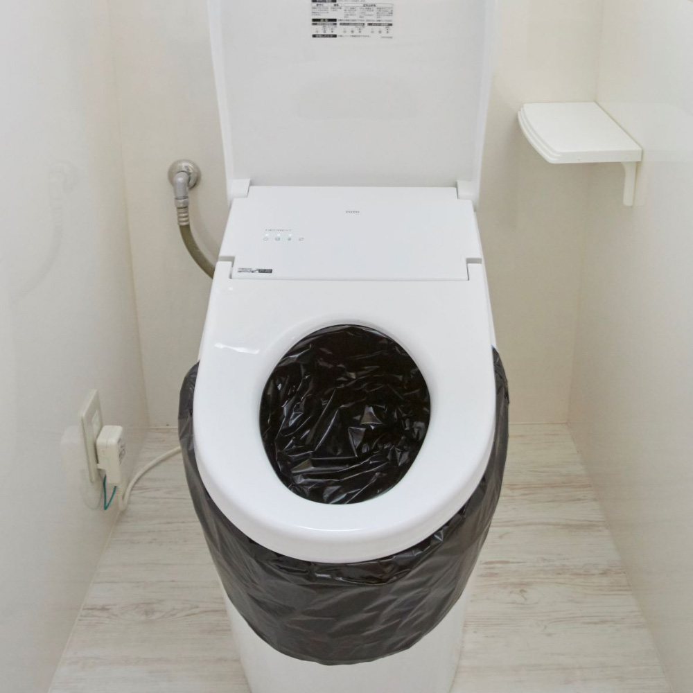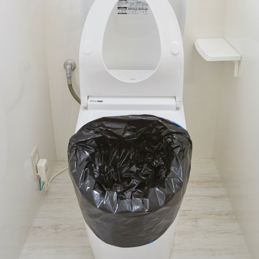 (2)さらにカバー袋を被せるようにトイレ袋(黒)を取りつけします。その後、便座を下ろします。