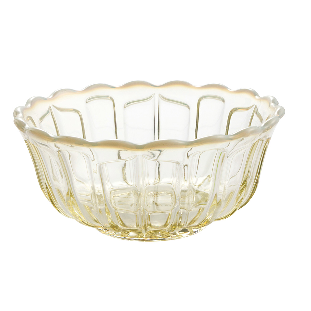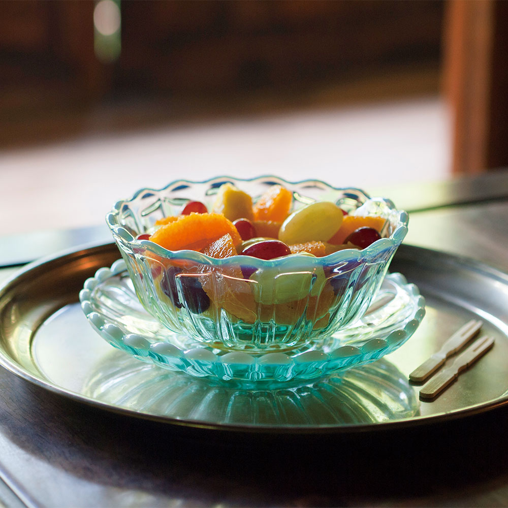 涼しげで華やかなガラスのうつわとお皿。1つ1つ手作業でつくられている日本製の美しい食器です。レトロで可愛らしいガラスの食器セット昭和に制作した型を今でも大切に使って作られているという、可愛らしい花のような食器。アンティークのガラスを思わせるディテールに、柔らかなオパール色の縁取りは降り積もった雪のようです。ふちの乳白色は手作業によるあぶりで加工されており、ひとつひとつあじわいが異なります。どこを眺めても愛らしくロマンティックなガラスです。レトロな雰囲気ながら、組み合わせで洋にも和にもアジアンにも。ちょっと大きめの洗鉢には、ぶどう一房が入ります。カットフルーツや、1人前のそうめんなどにちょうど良いサイズです。デザートトレーは、カットメロンをのせたいサイズ。洗鉢の下に置くのも良し、単品で使っても良し、毎日でも使いやすいかたちです。こちらは1899年創業の廣田硝子が製造。東京で最も歴史のあるガラスメーカーのひとつです。なかでも雪の花シリーズは、レトロな雰囲気を残しつつ、いつもの食卓を華やかに彩ってくれます。大切な方への贈り物としてもおすすめです。