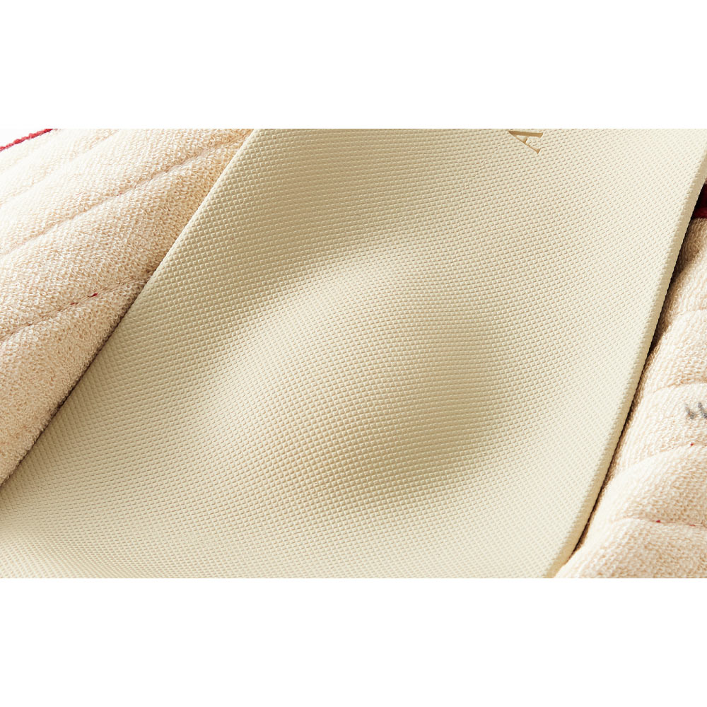 足裏を支えるフットベッドには低反発なポリウレタンを採用し、ふかふかのクッションがやさしくフィット。アッパー内側は気持ちよいタオル素材を使用。クッションが足裏のカーブに対して均等にかかることで、土踏まずや足指付け根の負担を分散します。