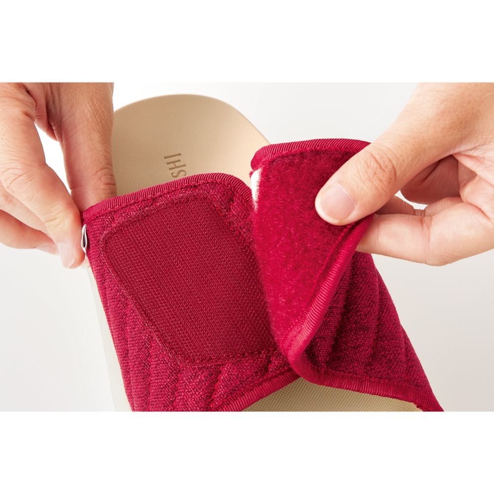 • 甲部がパカッと開いて、面ファスナーでお好みのサイズに調整可能です。甲高の方や、甲が低い方でもフィット感を損なわずに履くことができます。