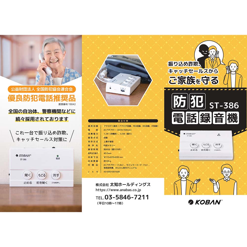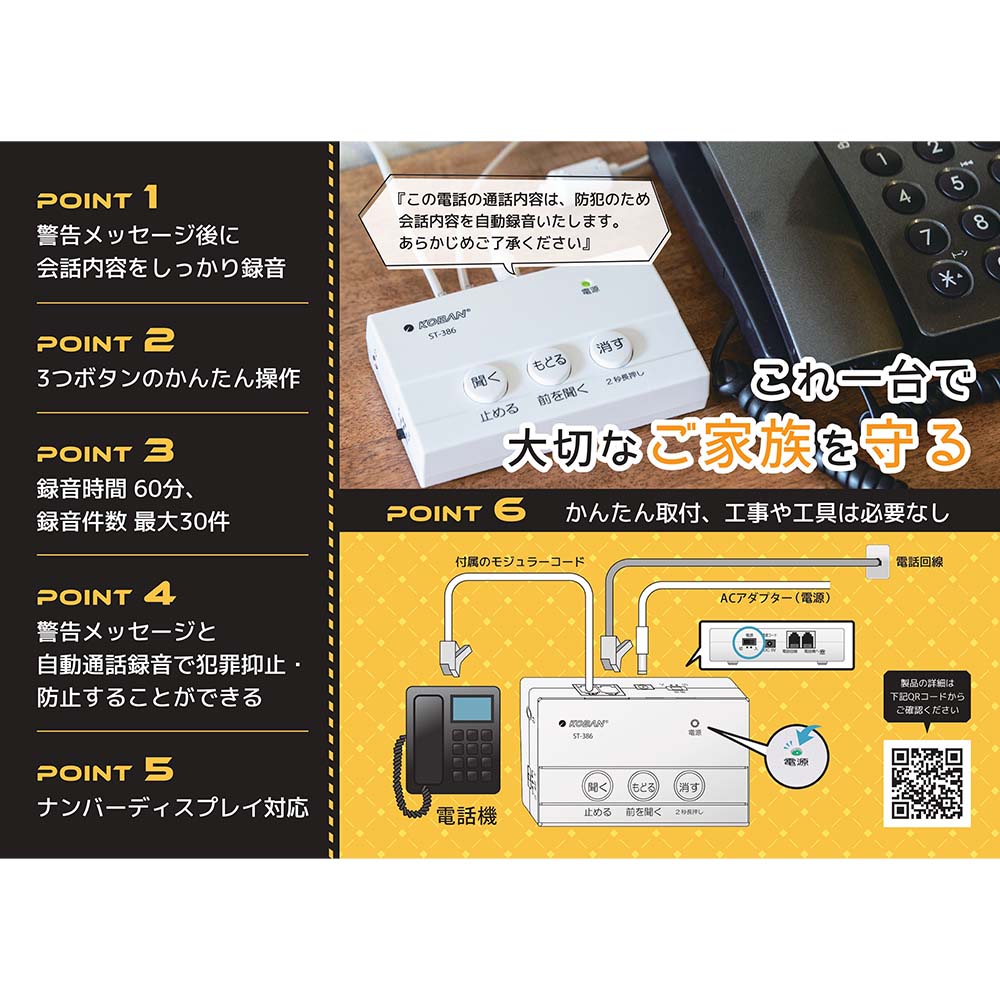かかってくる怪しい電話の対策に!自宅の電話に取り付けて、詐欺などの防犯対策に。●警告メッセージで応答かかってきた電話に警告メッセージで応答します。「この電話の通話内容は防犯のため会話内容を自動録音いたします。あらかじめご了承ください」と警告をいたします。●自動で通話音声を録音自動で通話の音声を録音します。家族に確認が必要な電話の内容も、録音した音声を聞き返すことができます。録音時間:60分、録音件数:最大30件これを超えると、古いデータから消されて上書きされます。●かんたん取付、工事や工具は必要なし取付は簡単です。既存の電話機に不測の電話線をつなげるだけのかんたん取付です。●公益財団法人 全国防犯協会連合会「優良防犯電話推奨品」全国の自治体、警察でも採用されています。推奨番号:19042