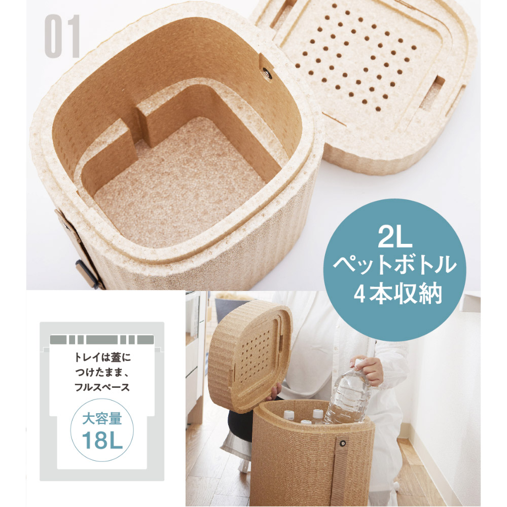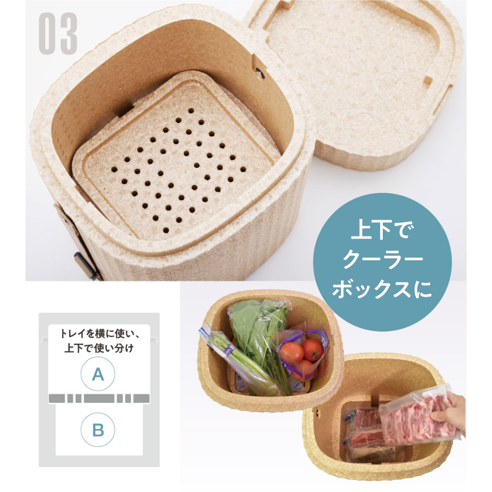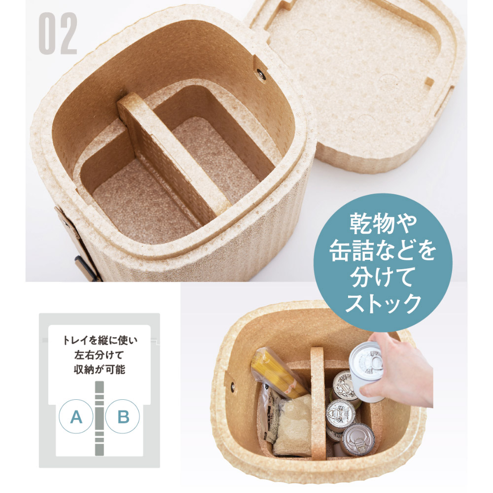 座れる防災インテリアSONAIR「ソナエア」“いつも”の使い方インテリアに馴染むカラー・デザインで、玄関やキッチン、リビング、寝室など、あらゆる場所でスツールやサイドテーブルとして普段使いできます。断熱機能のある発泡プラスチックを使用した肉厚設計で、アウトドアでも活躍。耐荷重が120kgで、イスにもなって一石二鳥!本体重量は約873gと軽く、持ち運びにも便利なベルト付き。“もしも”の使い方(1)断水対策としてフタを開けると2Lのペットボトルが4本入れられます。内部が容器形状になっているので、防災用品や非常時のお水などもすぐに使える場所にストックしておける。(2)停電対策としてクーラーボックスとして、冷蔵庫の食材の避難にも使える。(3)水害対策として水に浮く素材なので、非常時には浮具としてもサポート。本体・蓋合わせて浮力約18.91kgの浮力を計測。※メーカー調べ付属のトレイで3パターンの使い方ができる・トレイ横に置くと、上下でスペースを使い分け可能 食材を入れてクーラーボックスに。・トレイを縦に置くと、左右でスペースを分割 乾物や缶詰などを分けてストック。・トレイをフタ裏につけて、フルスペースでの活用 2Lのペットボトルが4本入ります。