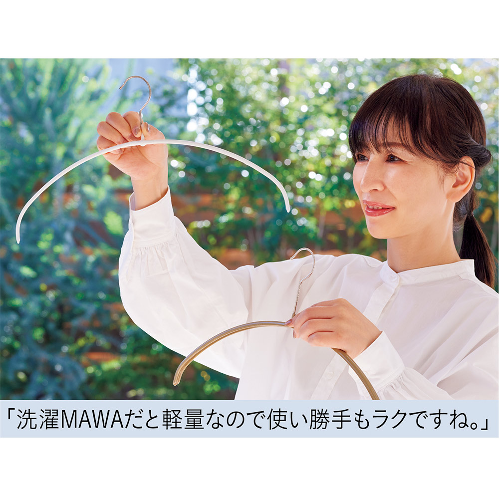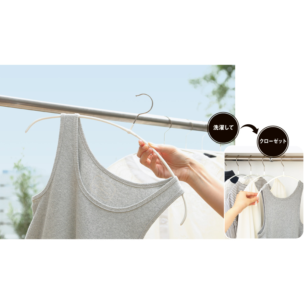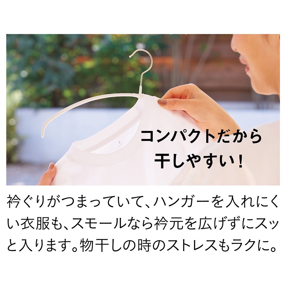 濡れてくっついた洗濯物も干しやすい、「スモールサイズ」取り込んだら、このままクローゼットへ収納できる手軽さで大人気。風が吹いてもずり落ちにくい特殊加工で、ピンチを使わずに洗濯物が干せます。フックはさびにくいステンレス製で、濡れた洗濯物にも安心。「この細さと軽さ、いいですね!洗濯物をスッと楽にかけられます。すごくスリムだから、収納場所にも困りません」(瀧本さん)